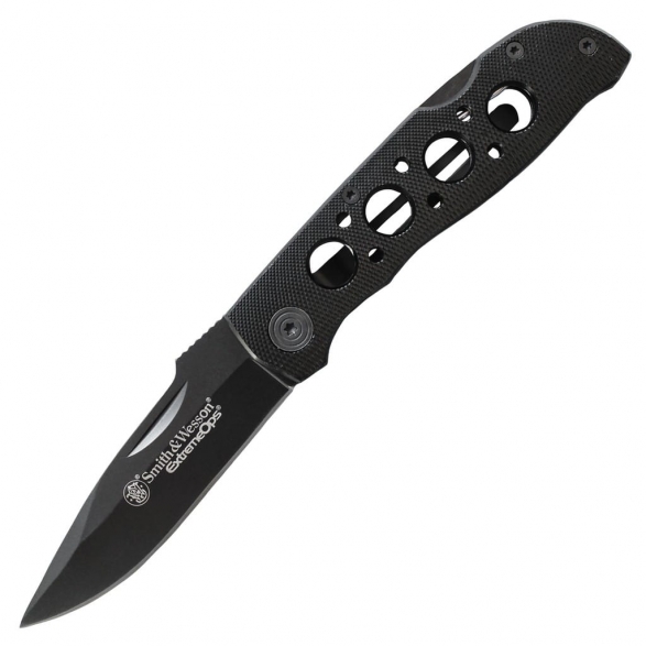 Taktyczny folder z serii Extreme Ops firmy Smith & Wesson zaprojektowany przez legendarnego producenta broni palnej. Model posiada gładką klingę o funkcjonalnym profilu Drop Point zrobioną ze stali nierdzewnej 7Cr17MoV pokrytej czarną oksydą chroniącą przed korozją i odblaskami. Szybkie i sprawne rozłożenie narzędzia prawą ręką umożliwia jednostronne zagłębienie na paznokieć znajdujące się na głowni. Bezpieczeństwo pracy, gdy nóż jest w użyciu zapewnia mechanizm Back Lock. Karbowany grzbiet ostrza stanowi stabilne podparcie dla kciuka, co ułatwia wykonywanie zadań wymagających większej precyzji. Anodowaną na czarno aluminiową rękojeść charakteryzują okrągłe otwory zmniejszające wagę konstrukcji. Antypoślizgowa powłoka okładzin i ich delikatne wyprofilowanie sprawia, że folder dobrze leży w dłoni gwarantując komfort użytkowania. Całość dopełnia klips mocujący do wygodnego przenoszenia narzędzia w kieszeni spodni lub przy wyposażeniu.