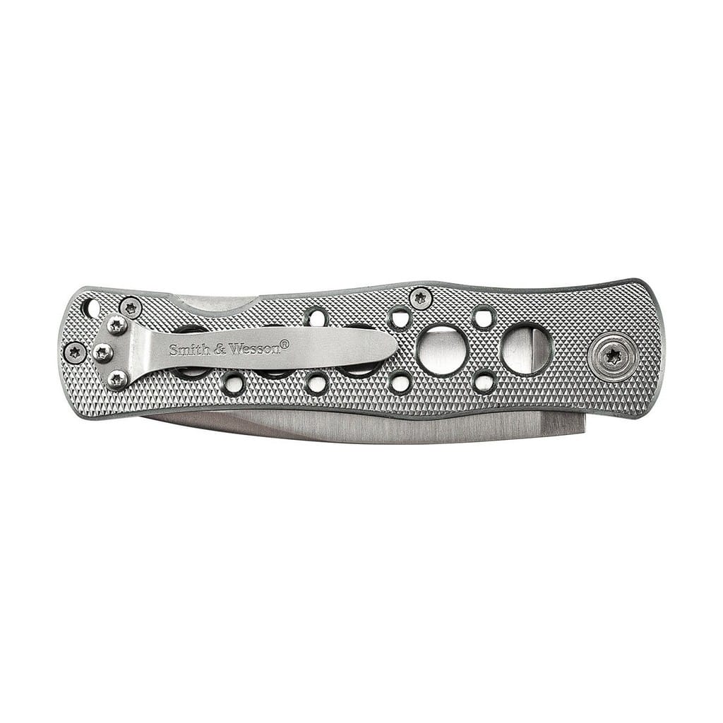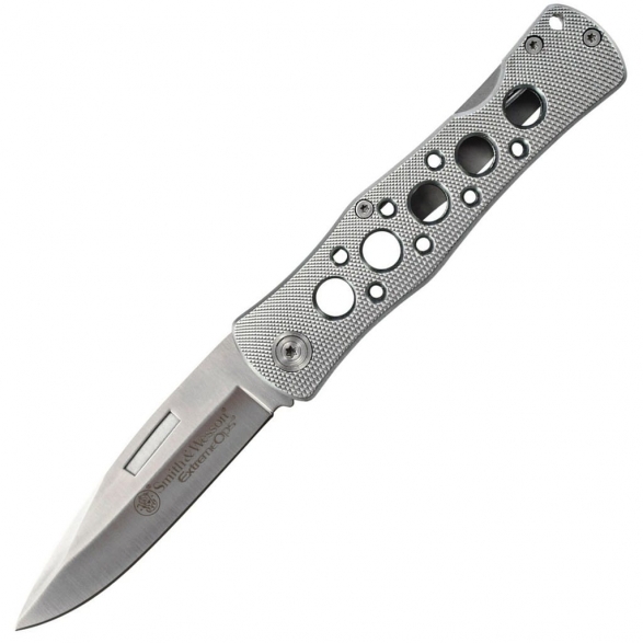 Elegancki folder z serii Extreme Ops firmy Smith & Wesson zaprojektowany przez legendarnego producenta broni palnej. Model posiada gładką klingę o funkcjonalnym profilu Drop Point zrobioną ze stali nierdzewnej 7Cr17MoV. Wykończenie jej metodą Satin pozostawia drobne ryski lekko matujące powierzchnię, co daje efekt niedokładnego wypolerowania. Szybkie i sprawne rozłożenie narzędzia prawą ręką umożliwia jednostronne zagłębienie na paznokieć znajdujące się na głowni. Bezpieczeństwo pracy, gdy nóż jest w użyciu zapewnia mechanizm Back Lock. Karbowany grzbiet ostrza stanowi stabilne podparcie dla kciuka, co ułatwia wykonywanie zadań wymagających większej precyzji. Srebrną, aluminiową rękojeść charakteryzują okrągłe otwory zmniejszające wagę konstrukcji. Antypoślizgowa powłoka okładzin i ich delikatne wyprofilowanie sprawia, że folder dobrze leży w dłoni gwarantując komfort użytkowania. Na zakończeniu znajduje się otwór na linkę umożliwiający przełożenie paracordu lub breloka ozdobnego, co ułatwi chwytanie narzędzia. Całość dopełnia klips mocujący do wygodnego przenoszenia noża w kieszeni spodni lub przy wyposażeniu.