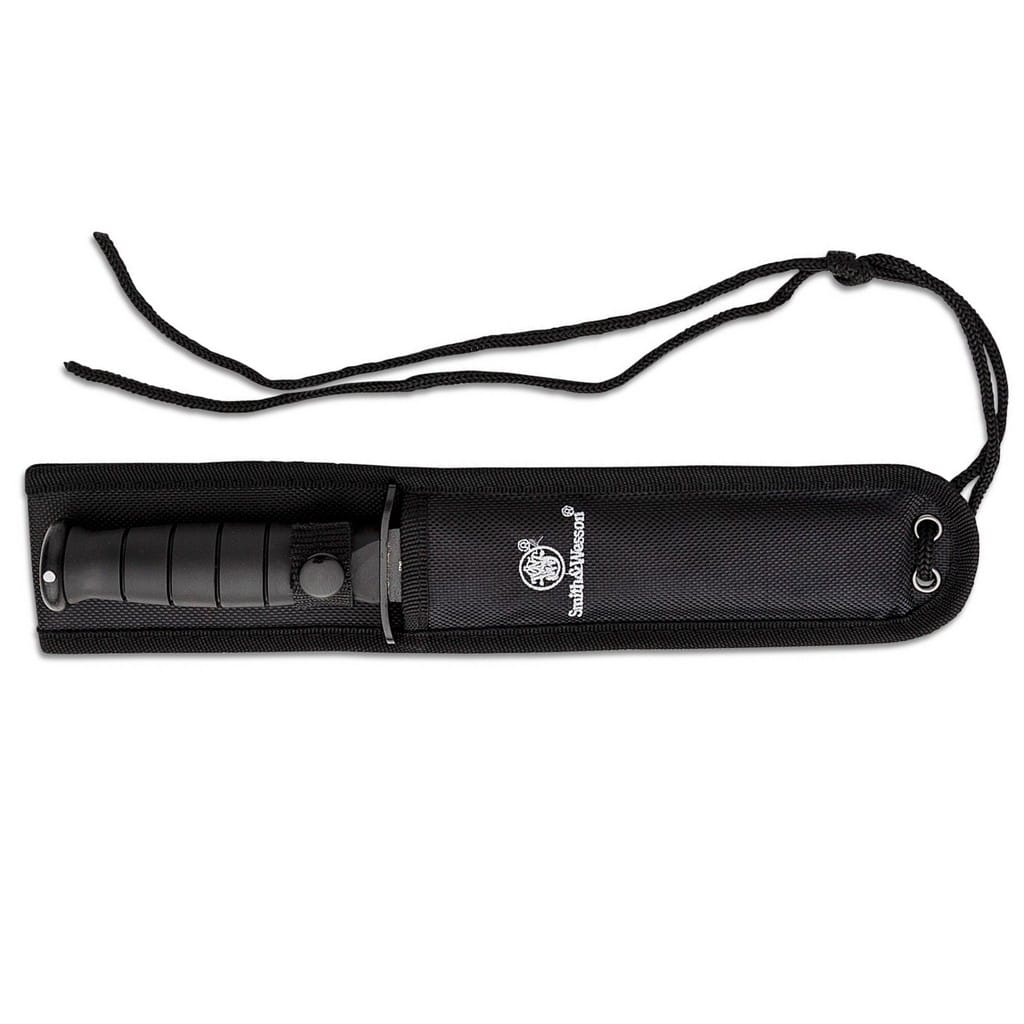 CKSUR1 to solidny nóż taktyczny, który świetnie sprawdzi się w terenie i przetrwa w najtrudniejszych warunkach. Model został zaprojektowany przez firmę Smith & Wesson rozpoznawalną na całym świecie z produkcji broni palnej. Ostrze o uniwersalnym profilu Clip Point wykonano ze stali nierdzewnej 7Cr17MoV o wysokiej zawartości węgla, co wpływa na jego wytrzymałość. Głownię w celu ochrony przed korozją i odblaskami pokryto czarną oksydą. Duży, obustronny jelec poprawia bezpieczeństwo użytkowania zapobiegając przypadkowemu zsunięciu się palców na krawędź tnącą. Rękojeść zrobiono z aluminium i pokryto antypoślizgową powłoką gumową, co gwarantuje pewny chwyt w każdych warunkach, nawet gdy dłoń jest mokra lub w rękawicy. Głowica noża w awaryjnej sytuacji może posłużyć jako zbijak do szyb lub młotek. W zestawie znajduje się pochwa z poliestru, dzięki której możemy wygodnie transportować narzędzie na pasku spodni, blisko ciała lub doczepić do wyposażenia za pomocą dołączonej linki.