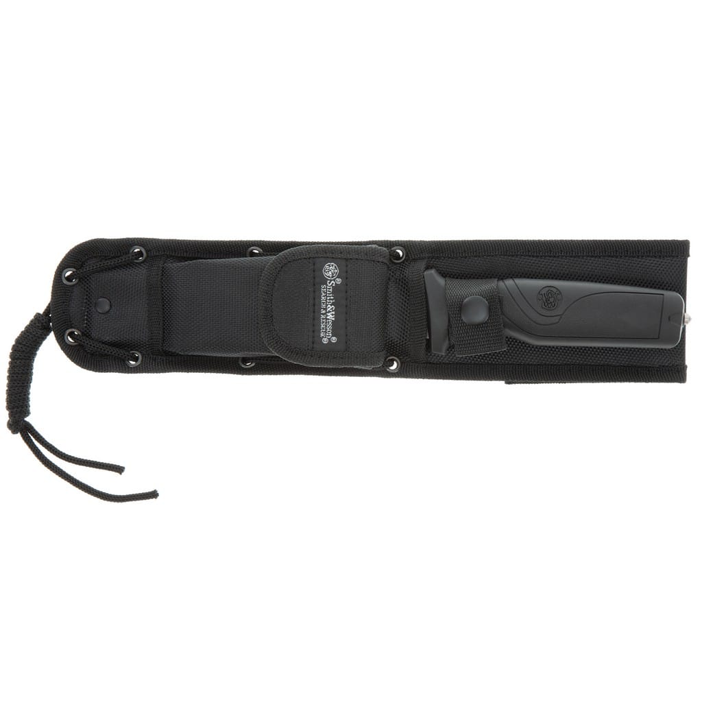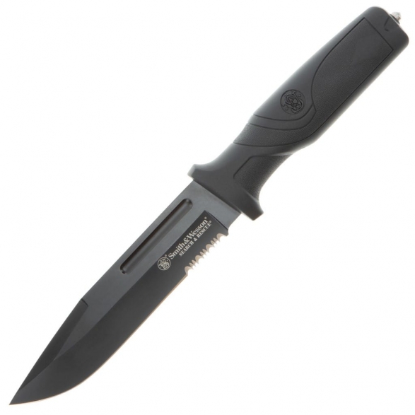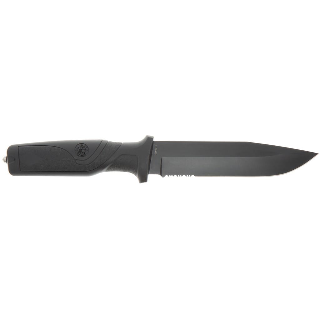 Solidny nóż taktyczny wyprodukowany przez legendarnego producenta broni palnej, firmę Smith & Wesson. Szerokie ostrze o profilu Drop Point wykonano ze stali nierdzewnej 8Cr13MoV, a w celu zabezpieczenia przed korozją pokryto czarną oksydą. Klinga typu Combo łączy gładką krawędź tnącą z ząbkowaną, co pozwala na skuteczne cięcie zarówno miękkich przedmiotów jak i twardych lin czy taśm. Rękojeść z tworzywa o odpowiednim wyprofilowaniu zapewnia komfort użytkowania oraz dobrą przyczepność do dłoni, dzięki gumowej powłoce. Na jej zakończeniu znajduje się zbijak do szyb nieoceniony w awaryjnej sytuacji. Dodatkowo bezpieczeństwu pracy sprzyja obustronny jelec chroniący palce przed ich przypadkowym zsunięciem się na krawędź tnącą. W zestawie znajduje się nylonowy pokrowiec do przenoszenia narzędzia na pasku lub wokół nogi, do czego wykorzystamy dołączoną linkę. Pochwa posiada kieszonkę, w której umieszczono kamień ostrzący do noża. Model doskonale sprawdzi się w terenie i przetrwa nawet najtrudniejsze warunki.