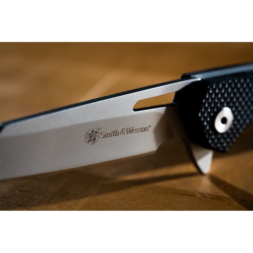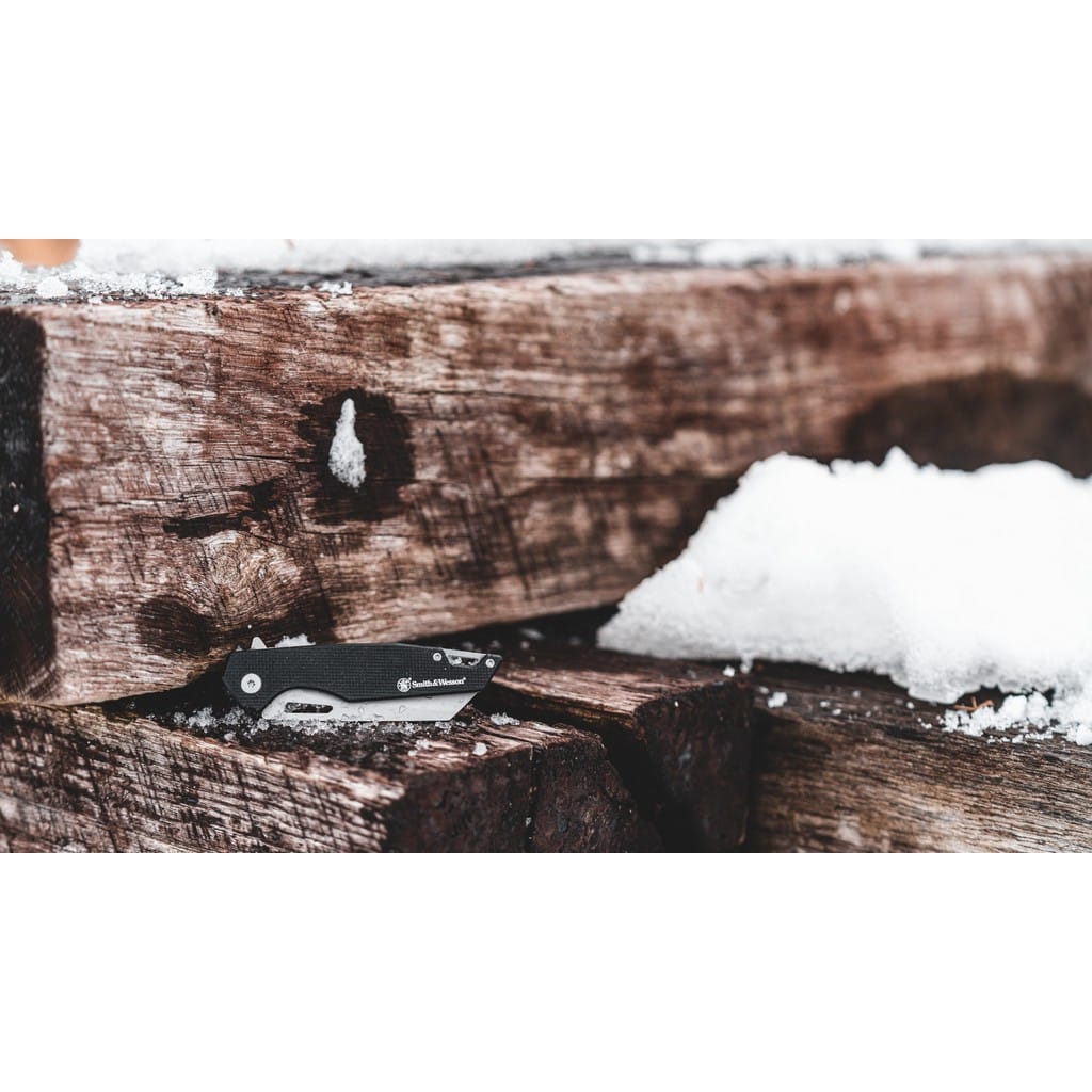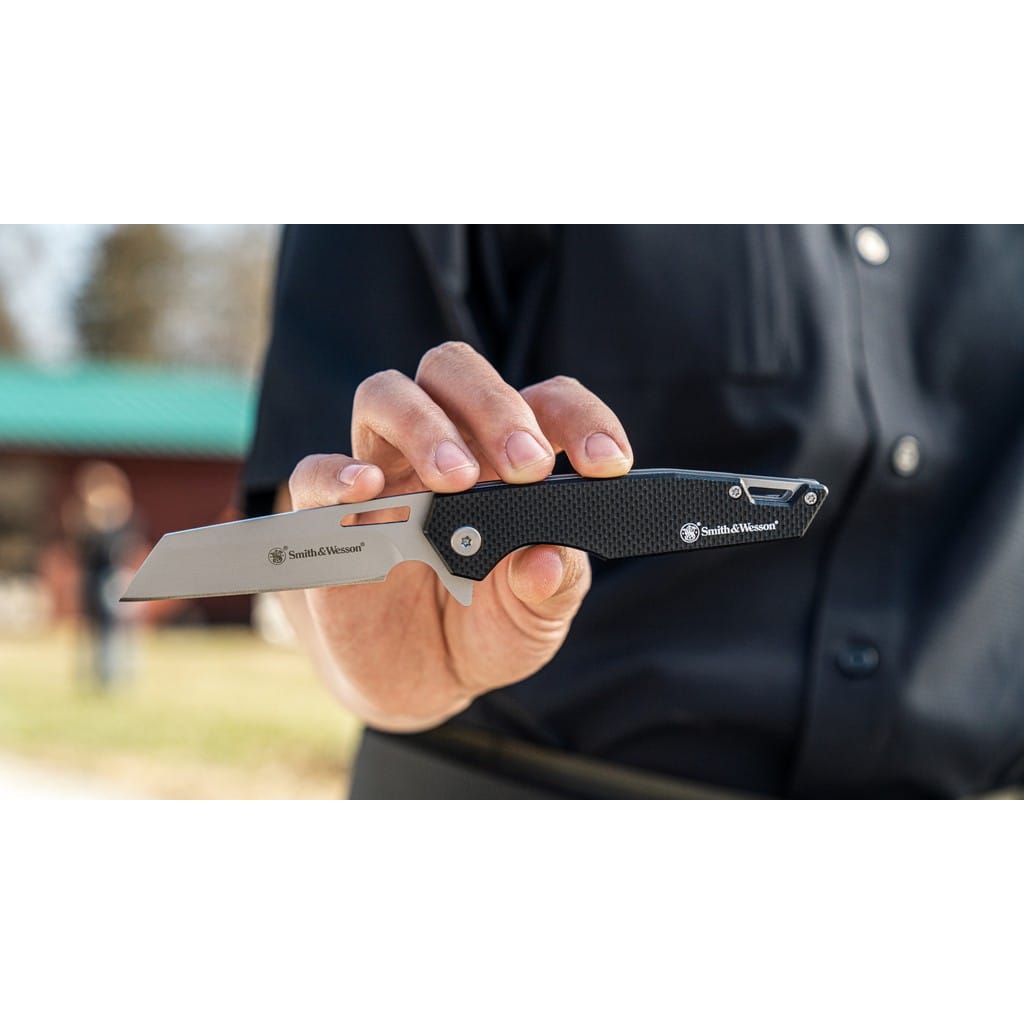 Legendarny producent broni palnej, firma Smith & Wesson zaprojektowała lekki nóż EDC o nazwie Sideburn. Model posiada ostrze o profilu Wharncliffe wykonane ze stali nierdzewnej 8Cr13MoV z matowym wykończeniem uzyskanym dzięki metodzie beadblast. Użytkownik może wysunąć klingę jedną ręką przy wykorzystaniu otworu na głowni lub flippera pełniącego jednocześnie funkcję jelca, chroniącego dłoń przed jej przypadkowym zsunięciem się na krawędź tnącą. Mechanizm łożysk kulkowych Ultra Glide wpływa na płynną pracę narzędzia. Nad bezpieczeństwem pracy, gdy folder jest w użyciu czuwa blokada Liner Lock. Rękojeść z tworzywa G10 z głębokim wyprofilowaniem pod palec pozwala na pewny chwyt. Na zakończeniu znajduje się sporych rozmiarów otwór na linkę umożliwiający przełożenie paracordu lub breloka ozdobnego. Konstrukcję uzupełnia klips mocujący do wygodnego przenoszenia noża w kieszeni spodni lub przy wyposażeniu.