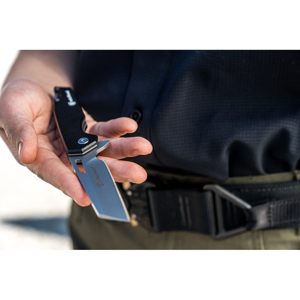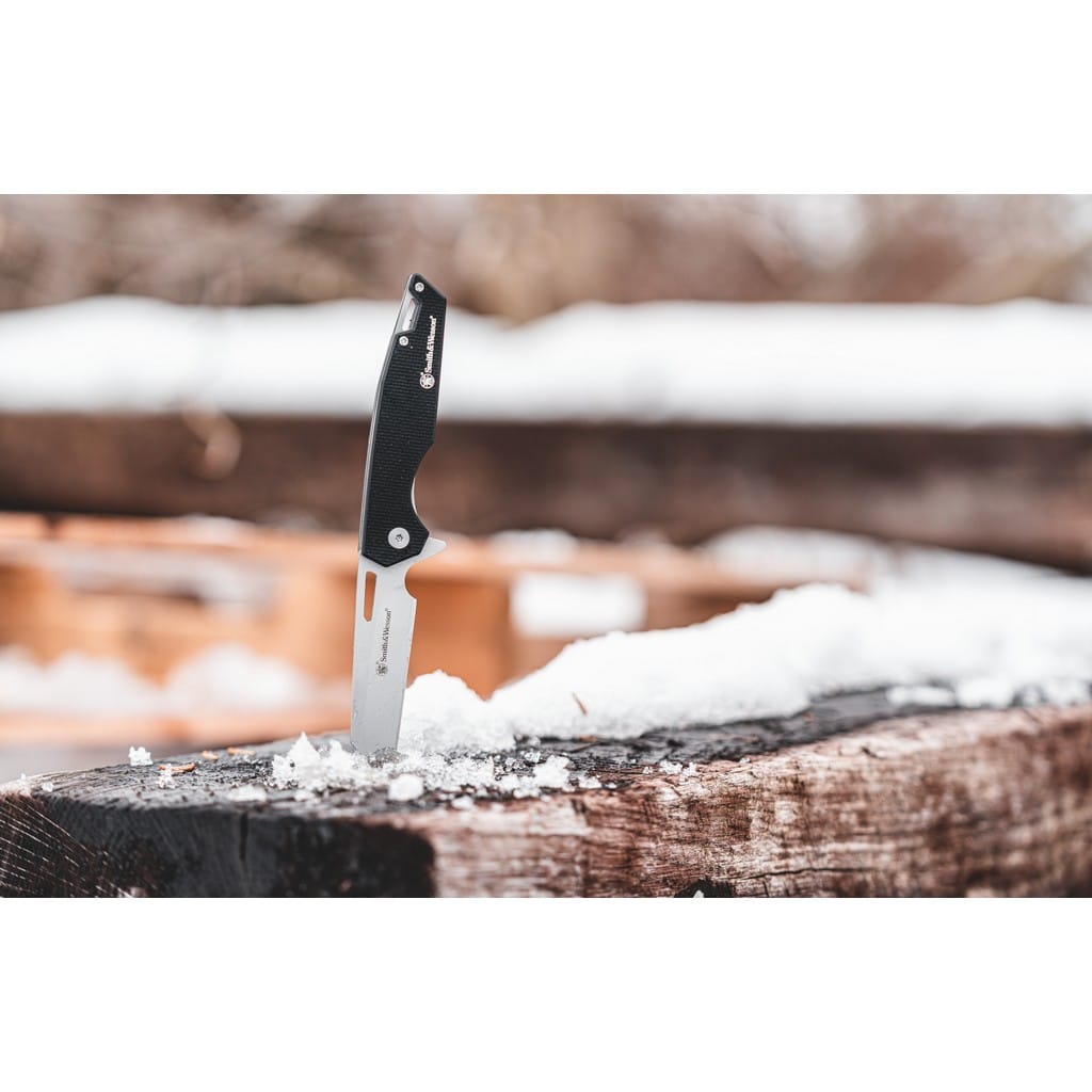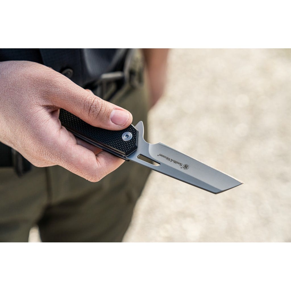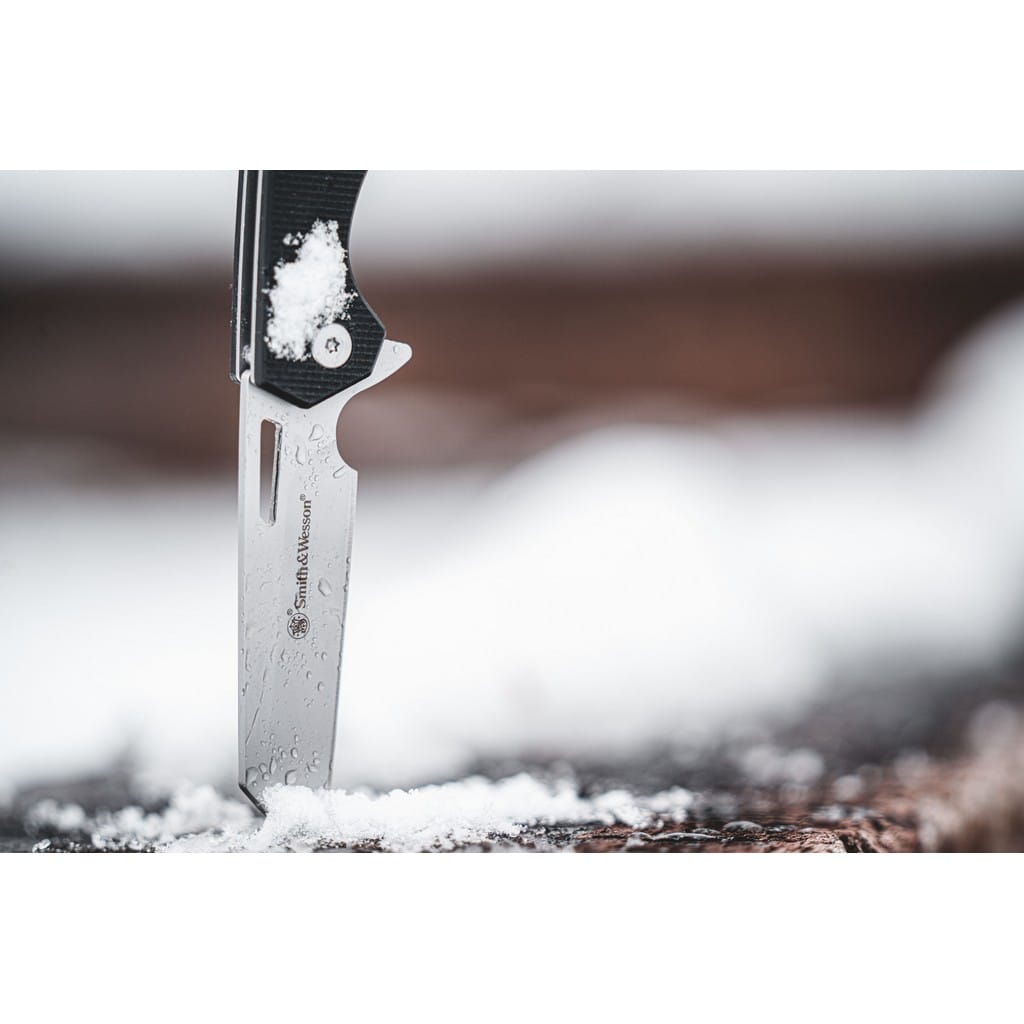 Legendarny producent broni palnej, firma Smith & Wesson zaprojektowała lekki nóż EDC o nazwie Sideburn. Model posiada ostrze o profilu Wharncliffe wykonane ze stali nierdzewnej 8Cr13MoV z matowym wykończeniem uzyskanym dzięki metodzie beadblast. Użytkownik może wysunąć klingę jedną ręką przy wykorzystaniu otworu na głowni lub flippera pełniącego jednocześnie funkcję jelca, chroniącego dłoń przed jej przypadkowym zsunięciem się na krawędź tnącą. Mechanizm łożysk kulkowych Ultra Glide wpływa na płynną pracę narzędzia. Nad bezpieczeństwem pracy, gdy folder jest w użyciu czuwa blokada Liner Lock. Rękojeść z tworzywa G10 z głębokim wyprofilowaniem pod palec pozwala na pewny chwyt. Na zakończeniu znajduje się sporych rozmiarów otwór na linkę umożliwiający przełożenie paracordu lub breloka ozdobnego. Konstrukcję uzupełnia klips mocujący do wygodnego przenoszenia noża w kieszeni spodni lub przy wyposażeniu.