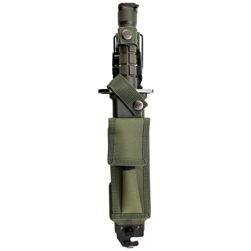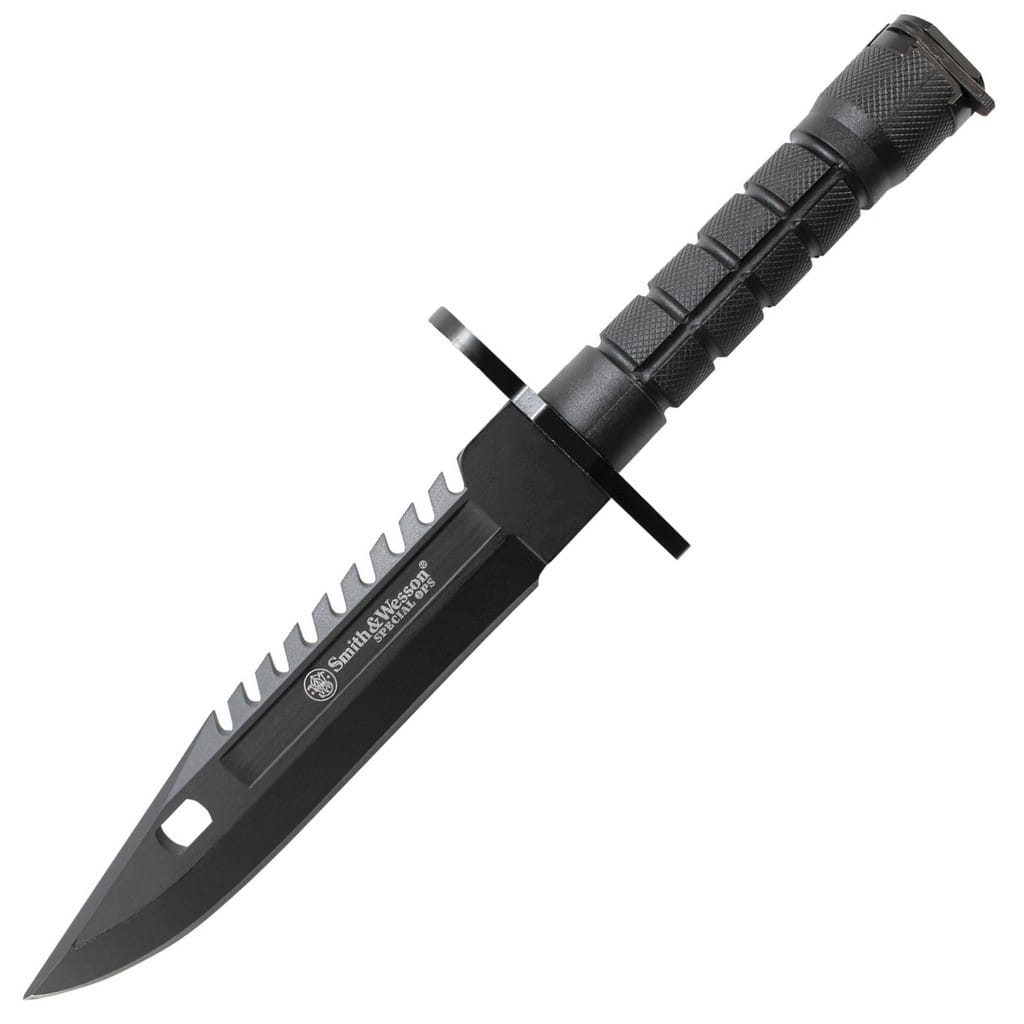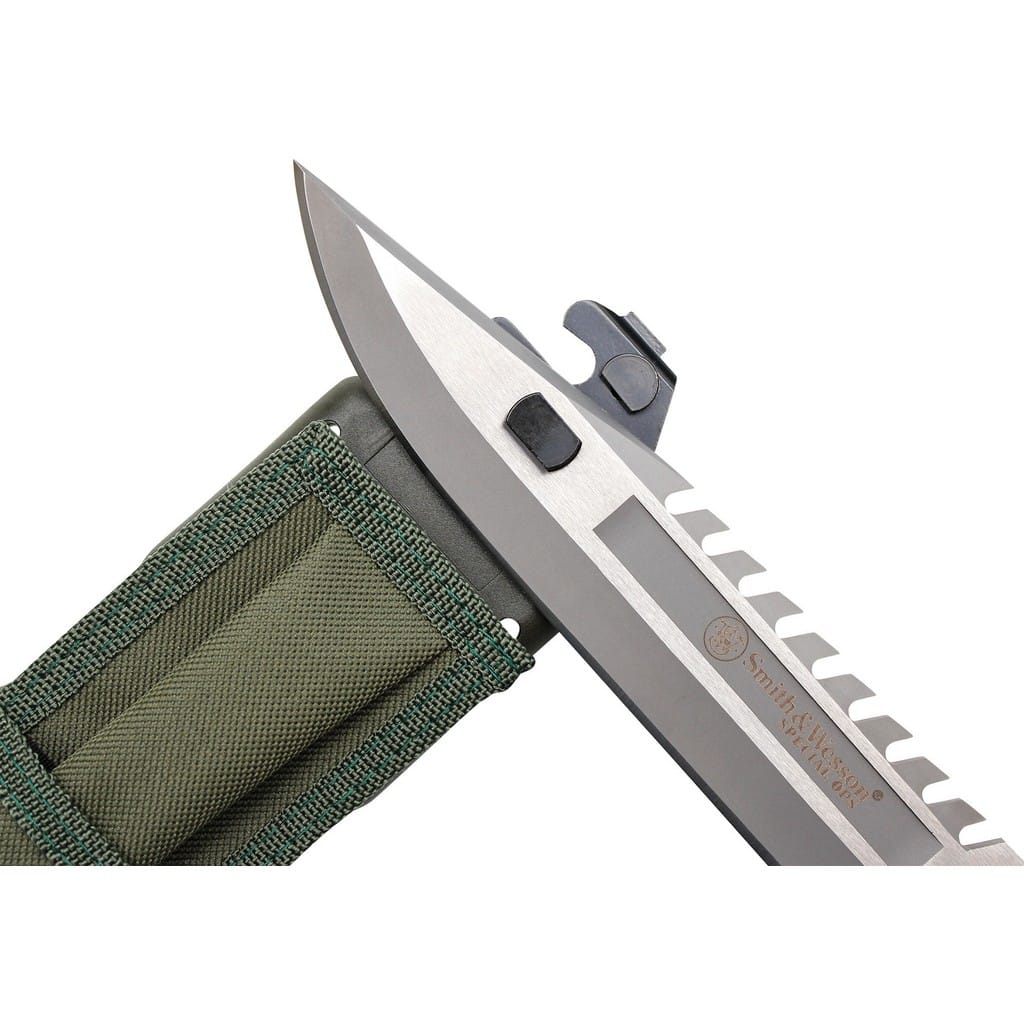 Bagnet M9 firmy Smith & Wesson to duży nóż taktyczny na trudne warunki i wymagające czasy. Model został zaprojektowany przez jedną z najbardziej rozpoznawalnych firm na całym świecie zajmującą się produkcją broni palnej. Dlatego doskonale trafia w potrzeby użytkowników poszukujących tego typu narzędzia, które współpracuje z karabinem maszynowym AR15/M16. Ostrze o uniwersalnym profilu Clip Point wykonano ze stali nierdzewnej 420J2 o bardzo dobrej odporności na korozję. Wykończenie jej metodą Satin pozostawia drobne ryski lekko matujące powierzchnię, co daje efekt niedokładnego wypolerowania. Na grzbiecie klingi znajdują się zęby tworzące piłę, co zwiększa możliwości wykorzystania noża w terenie. Duży, obustronny jelec poprawia bezpieczeństwo pracy zapobiegając przypadkowemu zsunięciu się palców na krawędź tnącą. Rękojeść z nylonu wzmocnionego włóknem szklanym, dzięki antypoślizgowej fakturze i charakterystycznym rowkom, gwarantuje pewny chwyt, nawet gdy dłoń jest mokra lub w rękawicy. W zestawie znajduje się kompatybilna z systemem Molle pochwa wyposażona w odczepianą kieszeń. Kabura posiada specjalną metalową wypustkę, która w połączeniu z ostrzem tworzy narzędzie do cięcia drutu. Dodatkowo bagnet jest zgodny z wojskową specyfikacją, co oznacza, że możemy zamocować go na broni AR15/M16.