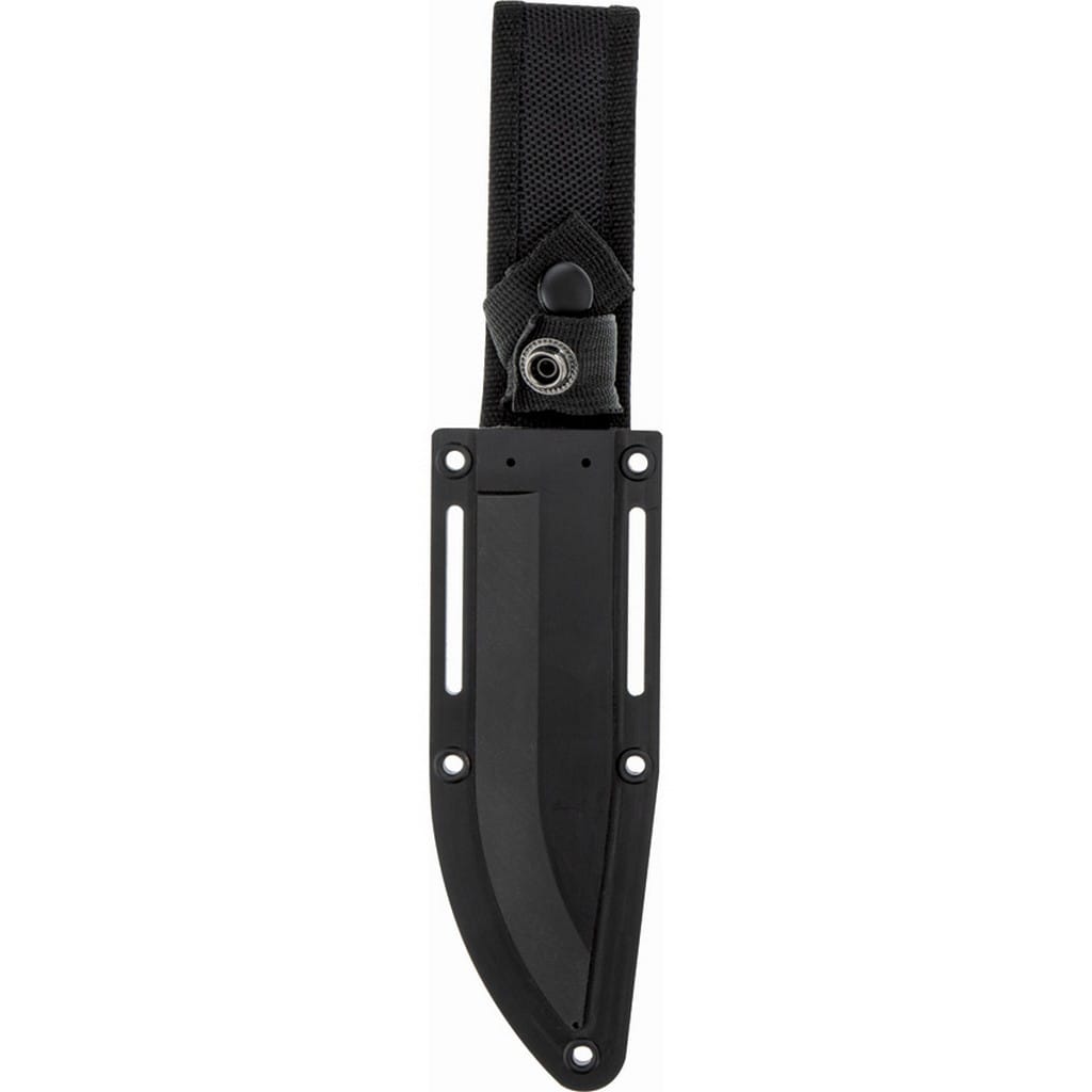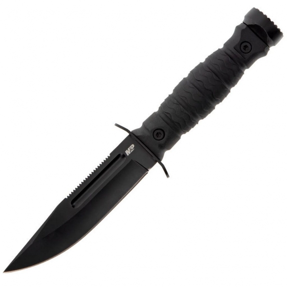 Nóż taktyczny wyprodukowany przez legendarnego, amerykańskiego producenta broni palnej, firmę Smith & Wesson. Model przygotowany do ciężkich zadań, a dla zapewnienia odpowiedniej wytrzymałości wykonany w konstrukcji full tang, czyli z jednego kawałka stali nierdzewnej 8Cr13MoV. Charakterystyczną cechą jest piła znajdująca się na grzbiecie klingi, co podnosi jego walory użytkowe w terenie. Ostrze o profilu Bowie, o bardzo dobrych właściwości tnących, pokryto czarną oksydą, zabezpieczającą przed korozją i odblaskami. Duży, obustronny jelec wspomaga bezpieczeństwo pracy chroniąc palce przed ich przypadkowym zsunięciem się na krawędź tnącą. Polimerową rękojeść w celu poprawy komfortu chwytu pokryto antypoślizgową, gumową warstwą, dzięki której nóż pewnie leży w dłoni. Zakończenie w postaci stalowej głowicy pozwala na wykorzystanie narzędzia w awaryjnej i kryzysowej sytuacji jako młotka lub zbijaka do szyb. W zestawie znajduje się kompatybilna z systemem Molle pochwa z twardego tworzywa wyposażona w szlufkę mocującą na pasek bo bezpiecznego transportowania zestawu blisko ciała.
