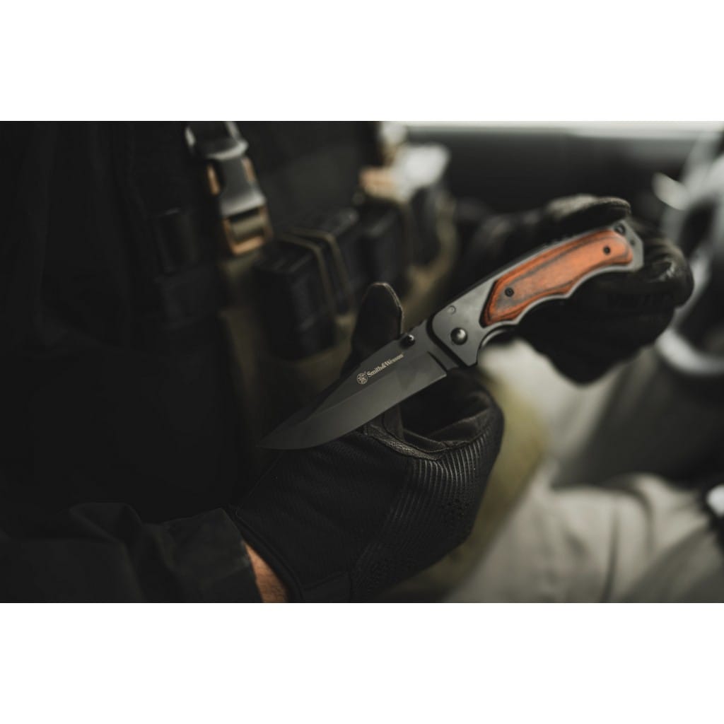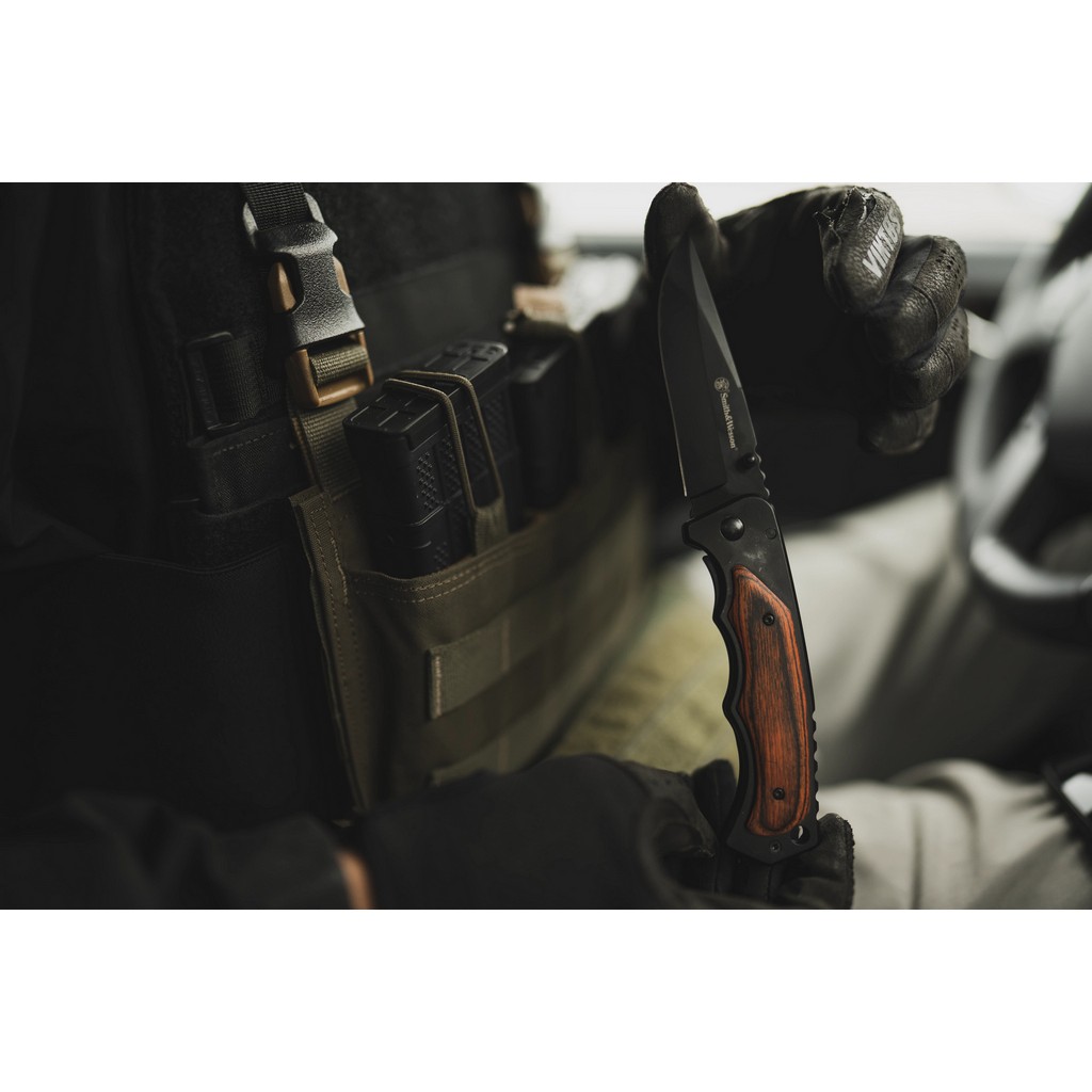 Funkcjonalny nóż składany do codziennej pracy zaprojektowany przez popularnego producenta broni palnej, firmę Smith & Wesson. Model stanowiący połączenie klasyki i taktycznego wyglądu będzie idealną propozycją dla pasjonatów militariów i tradycji. Ostrze o uniwersalnym profilu Drop Point zostało zrobione ze stali nierdzewnej 8Cr13MoV pokrytej czarną powłoką chroniącą przed korozją i odblaskami. Szybkie i sprawne rozłożenie noża jedną ręką umożliwia obustronny kołek znajdujący się na głowni. Bezpieczeństwo użytkowania, gdy narzędzie jest w użyciu zapewnia solidny i niezawodny mechanizm Frame Lock. Karbowany grzbiet ostrza daje stabilne podparcie dla kciuka, co ułatwia wykonywanie zadań wymagających większej precyzji. Do stalowej ramy przymocowano okładziny z drewna, co zadowoli fanów naturalnych materiałów. Wyprofilowanie rękojeści pod zaciskającą się dłoń gwarantując pewny chwyt w każdej sytuacji. Na zakończeniu znajduje się otwór na linkę umożliwiający przełożenie paracordu lub breloka ozdobnego. Konstrukcję uzupełnia klips mocujący do wygodnego przenoszenia foldera w kieszeni spodni lub przy wyposażeniu.
