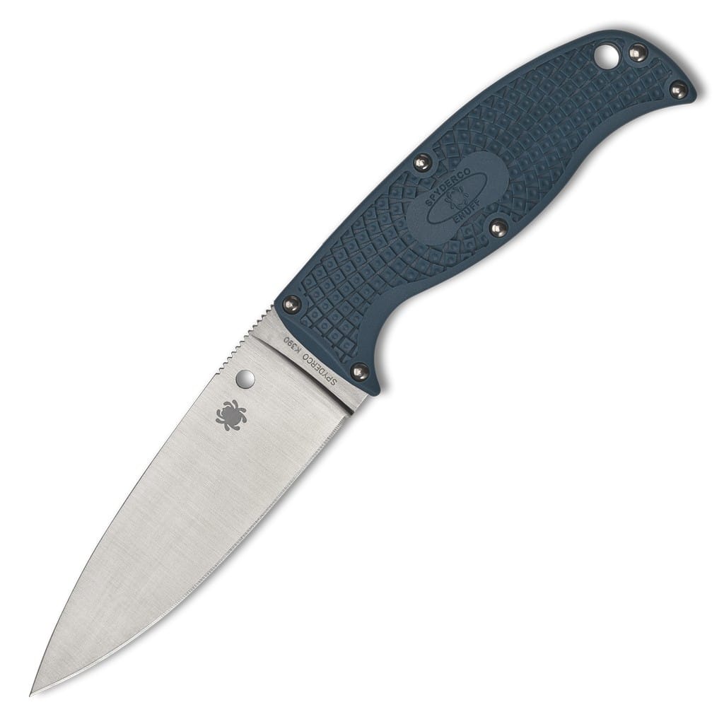 Enuff 2 amerykańskiej firmy Spyderco to nowy standard wydajności kompaktowego noża z ostrzem stałym. Głownia o profilu Leaf Shaped, wykształconym i dopracowanym przez producenta oraz całkowicie płaskim szlifie, posiada posiada niewielki otwór będący znakiem rozpoznawalnym tej marki. Ostrze o satynowym wykończeniu wykonano z najnowocześniejszej stali narzędziowej K390 MICROCLEAN pochodzącej z fabryki Bӧhler-Uddeholm, która stanowi bardzo dobry wybór dla wszystkich koneserów stali i miłośników ostrych zabawek. Zaawansowany skład stopu bogaty w duże ilości wanadu, wolframu i kobaltu zapewnia sztywność i wyjątkowo długo utrzymuje właściwą ostrość krawędzi tnącej. Model charakteryzuje się konstrukcją full tang, czyli z jednego kawałka stali, co dodatkowo zwiększa wytrzymałość narzędzia podczas wykonywania ciężkich i wymagających prac. Do stalowego szkieletu przymocowano wyprofilowane okładziny chwytu zrobione z nylonu wzmocnionego włóknem szklanym w niebieskim kolorze. Rękojeść posiada specjalną, antypoślizgową strukturę Bi-Directional zwiększającą przyczepność do dłoni i gwarantującą komfort pracy. Na jej zakończeniu znajduje się otwór umożliwiający zamocowanie linki i stworzenie oplotu na nadgarstek. Bezpieczeństwo użytkownika poprawia karbowany grzbiet głowni stanowiący stabilne podparcie dla kciuka. W zestawie znajduje się pochwa z tworzywa wraz z klipsem mocującym pozwalającym na kilka opcji przenoszenia noża przy pasie lub wyposażeniu.