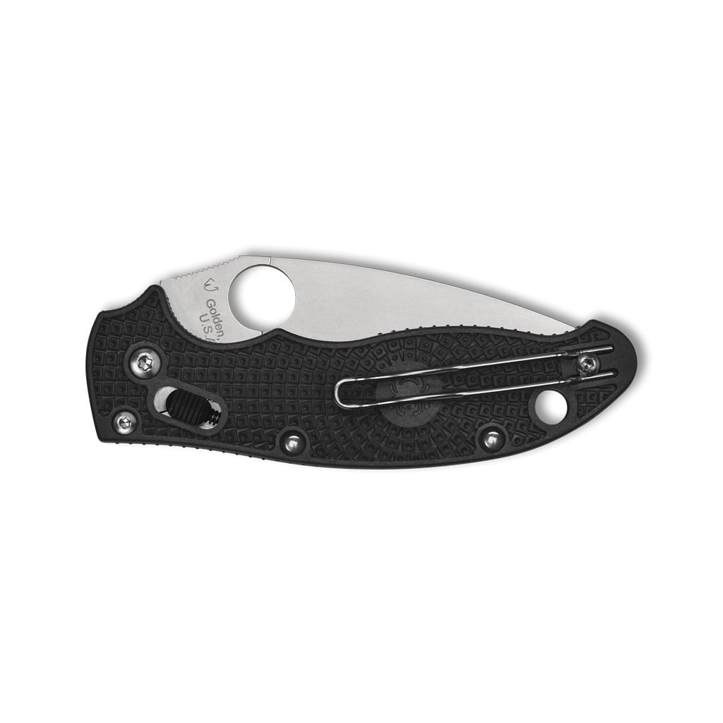 Oryginalny Manix 2 Lightweight firmy Spyderco w 2010 roku zdobył upragnioną nagrodę popularnego magazynu Blade jako najbardziej innowacyjny amerykański produkt. Ta wersja Manix 2 nie różni się niczym od nagrodzonego noża, jedynie kolorem rękojeści. Łączy pełną wydajność cięcia z rewolucyjną i niezwykle lekką rękojeścią. Model posiada głownię o profilu Leaf Shaped wykształconym i dopracowanym przez producenta oraz całkowicie płaskim szlifie, wykonaną z amerykańskiej stali nierdzewnej klasy premium, CTS BD1N. Wykończenie jej metodą Satin pozostawia drobne ryski lekko matujące powierzchnię, co daje efekt niedokładnego wypolerowania. Folder charakteryzuje się opatentowanym systemem zamykania „Ball Bearing Lock”. Jest to łożysko zrobione z hartowanej kulki zamkniętej w polimerowej obudowie. Okrągła kulka pozwala zamkowi na samoistne ustawienie się wzdłuż dużej powierzchni oraz łagodne i pewne zamknięcie. Ostrze posiada duży otwór, który umożliwia szybkie i wygodne rozłożenie noża jedną ręką, nawet w przypadku osób posiadających duże dłonie. Bezpieczeństwu pracy sprzyja ząbkowane oparcie dla kciuka na górnej krawędzi klingi. Ergonomicznie wyprofilowana rękojeść pod zaciskającą się dłoń użytkownika została wykonana z polimeru wzmocnionego włóknem szklanym (FRCP) w czarnym kolorze. Jej antypoślizgowa, dwukierunkowa tekstura i karbowane brzegi poprawiają kontrolę nad narzędziem, a także gwarantują pewny chwyt w każdych warunkach. Konstrukcję uzupełnia otwór na linkę oraz dwupozycyjny klips mocujący o drucianej budowie, dzięki któremu możemy wygodnie przenosić folder w kieszeni lub przy wyposażeniu.