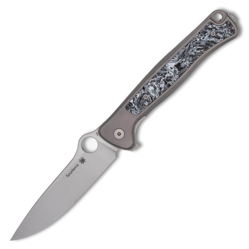 Folder Spyderco Slym został wyprodukowany we Włoszech przez firmę Lion Steel. Model charakteryzuje się starannym wykonaniem z najwyższej jakości materiałów. Zadowoli niejednego malkontenta poszukującego niezawodnego i elitarnego noża do kolekcji. Ostrze o uniwersalnym profilu Drop Point zrobiono z austriackiej stali nierdzewnej klasy premium Bohler M390 oferującej doskonałą odporność na korozję i ścieranie. Odpowiednia kompozycja wanadu, molibdenu i wolframu sprawia, że krawędź tnąca utrzymuje ostrość stosunkowo przez długi czas. Wykończenie głowni metodą Stonewash pozostawia nieregularną powłokę dobrze maskującą rysy i zadrapania powstające podczas eksploatacji. Klingę osadzono na łożyskach kulkowych, która przy wykorzystaniu perfekcyjnie umiejscowionego okrągłego otworu lub demontowanego flippera, wysuwa się płynnie i gładko. Bezpieczeństwo użytkowania zapewnia solidny i niezawodny mechanizm Reeve Integral Lock (R.I.L.). Stanowi on wersję blokady Frame Lock, wzmocnioną o utwardzoną, stalową wkładkę, skutecznie blokującą ostrze podczas pracy. Tytanową rękojeść pokryto szarą powłoką PVD oraz na jednej ze stron wzbogacono o element ozdobny z unikalnego materiału Fat Carbon. Na zakończeniu umieszczono oczko umożliwiające przełożenie breloka lub paracordu, ułatwiających chwytanie narzędzia. Konstrukcję uzupełnia dwupozycyjny klips mocujący do wygodnego przenoszenia noża w kieszeni spodni.
