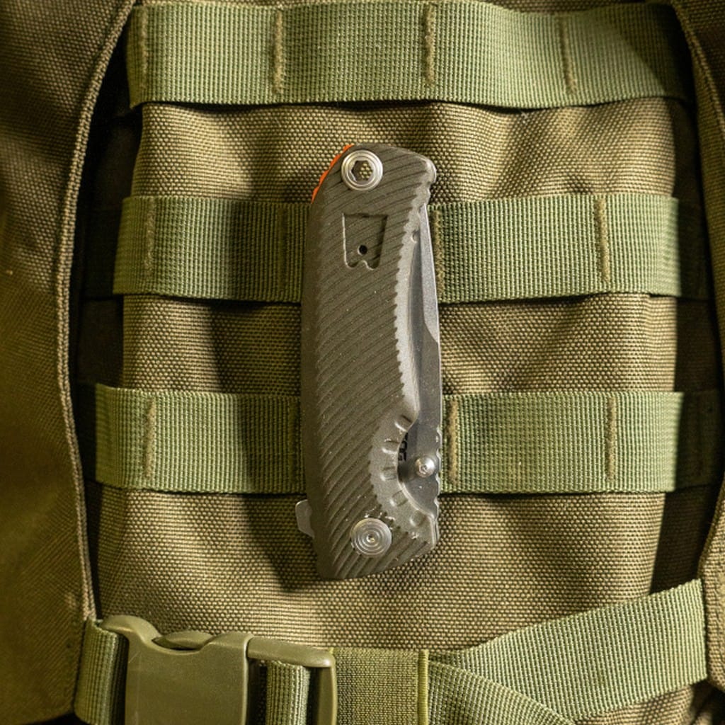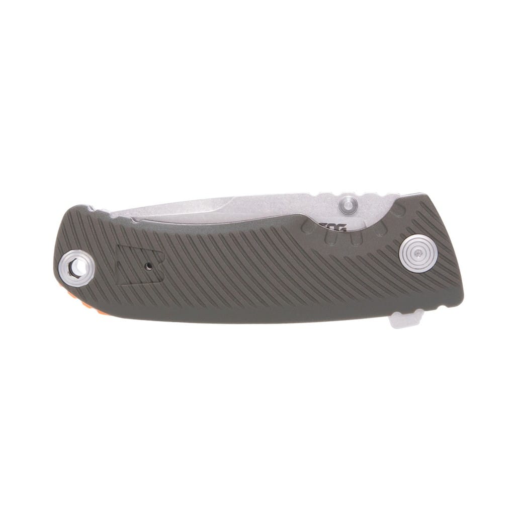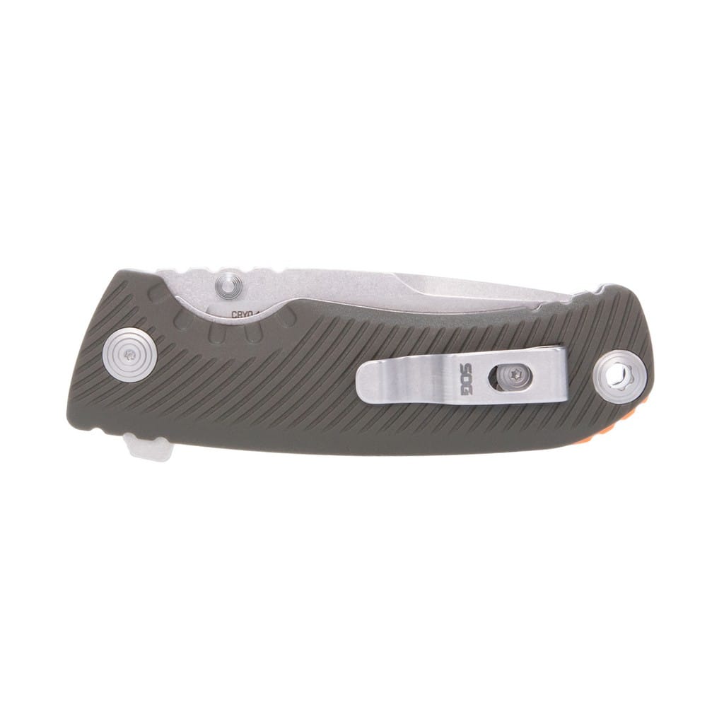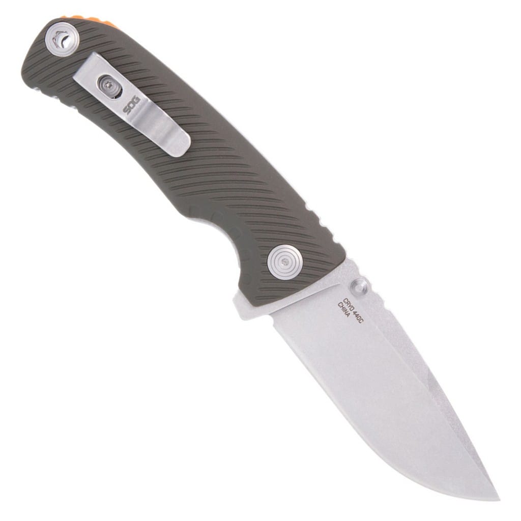 Tellus to świetny nóż outdoorowy zaprojektowany przez renomowaną firmę SOG z myślą o codziennych zadaniach w terenie. Jego otwarta konstrukcja ułatwia czyszczenie noża z brudu, błota oraz innych zanieczyszczeń powstałych w wyniku pracy w terenie. Ostrze o uniwersalnym profilu Clip Point zostało wykonane ze stali nierdzewnej CRYO 440C poddanej kriogenicznej obróbce cieplnej, dzięki czemu zyskała ona wyjątkową odporność na korozję i zużycie. Wykończenie głowni metodą Stonewash pozostawia nieregularną powłokę dobrze maskującą rysy powstające podczas eksploatacji. Do szybkiego rozłożenia klingi służy obustronny kołek lub flipper pełniący także funkcję jelca, wzmacniając w ten sposób bezpieczeństwo użytkowania. Blokada Liner Lock chroni przed przypadkowym złożeniem się narzędzia gdy jest w użyciu, a karbowany grzbiet ostrza stanowi stabilne podparcie dla kciuka. Ergonomicznie wyprofilowana rękojeść z wytrzymałego tworzywa GRN w zielonym kolorze, dzięki antypoślizgowej fakturze zapewnia dobrą przyczepność do dłoni i gwarantuje pewny chwyt w każdych warunkach. Ozdobny, pomarańczowy backspacer, łączący obie okładziny, dodaje charakteru konstrukcji. Na zakończeniu znajduje się stalowy otwór, dzięki któremu możemy doczepić linkę lub ogonek z paracordu. Całość uzupełnia dwupozycyjny klips mocujący do wygodnego przenoszenia noża w kieszeni spodni lub przy wyposażeniu.