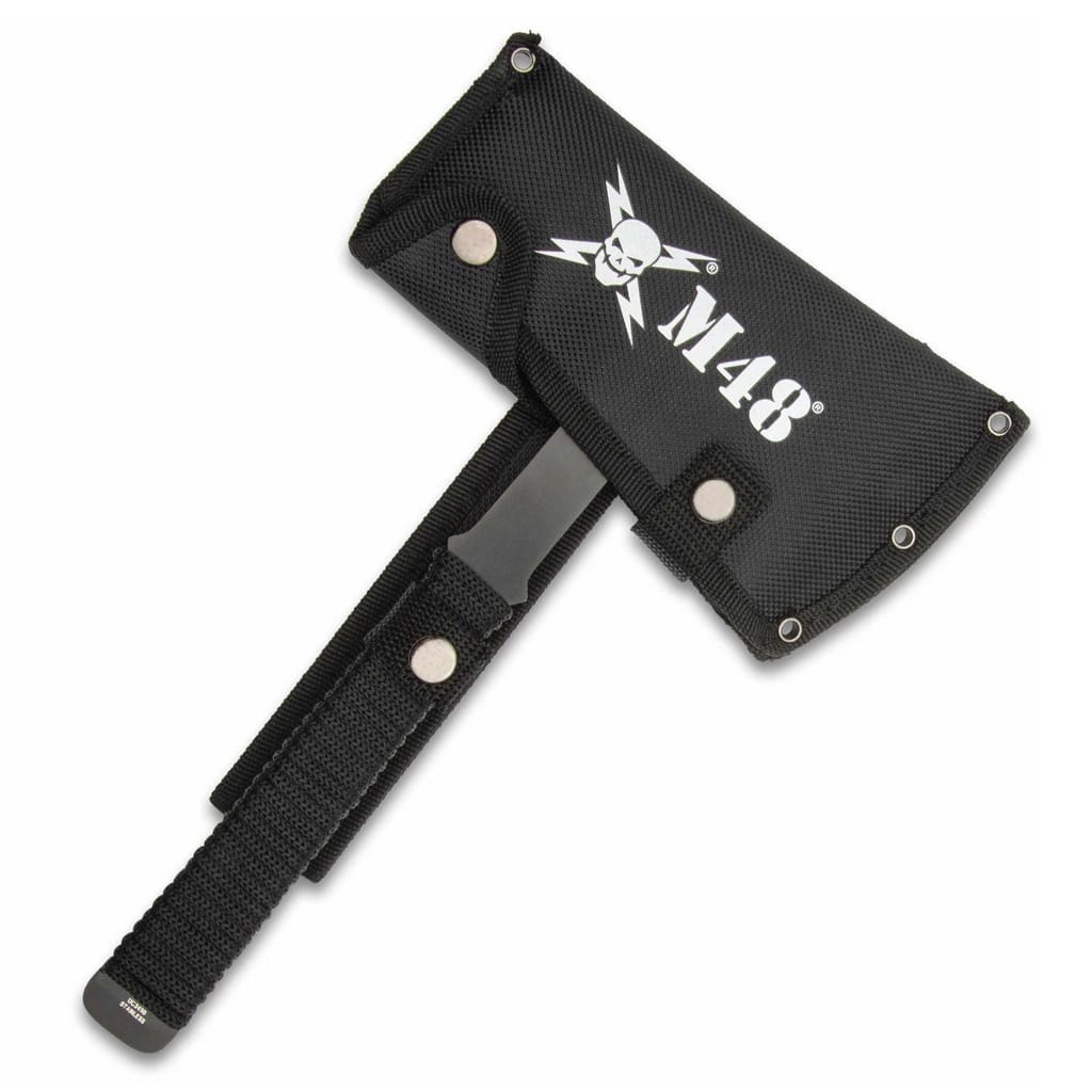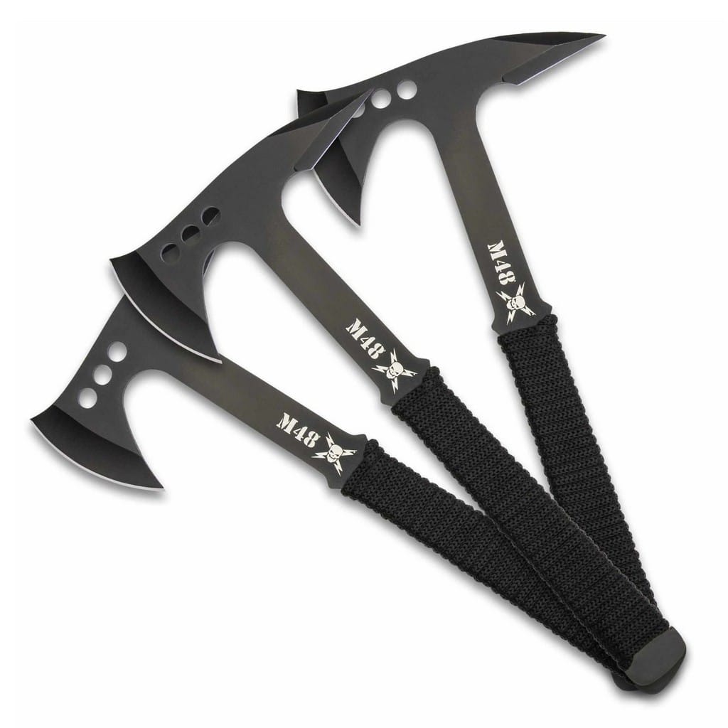 Zestaw trzech kompaktowych toporków do rzucania należących do popularnej serii M48 producenta United Cutlery. Zostały wykonane z jednego, solidnego kawałka stali nierdzewnej 3Cr13, co zwiększa ich wytrzymałość. W celu zabezpieczenia przed negatywnym działaniem czynników zewnętrznych pokryto je czarną i antyodblaskową powłoką ochronną. Otwory na głowicy zmniejszają wagę konstrukcji sprawiając, że rzuca się nimi łatwo i precyzyjnie. Dodatkowo ostre zakończenie po przeciwległej stronie klingi może służyć do przebijania i dziurawienia. Każdą z rękojeści opleciono linką dla poprawy komfortu chwytu i zwiększenia przyczepności do dłoni użytkownika. Do zestawu dołączono nylonową pochwę pozwalającą na przymocowanie jej do pasa i bezpieczne transportowanie całego zestawu blisko ciała.