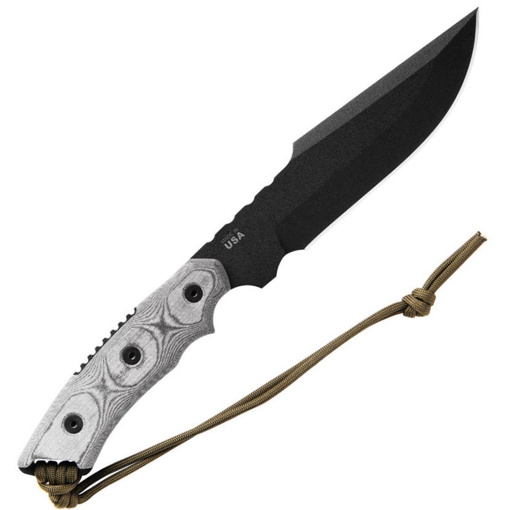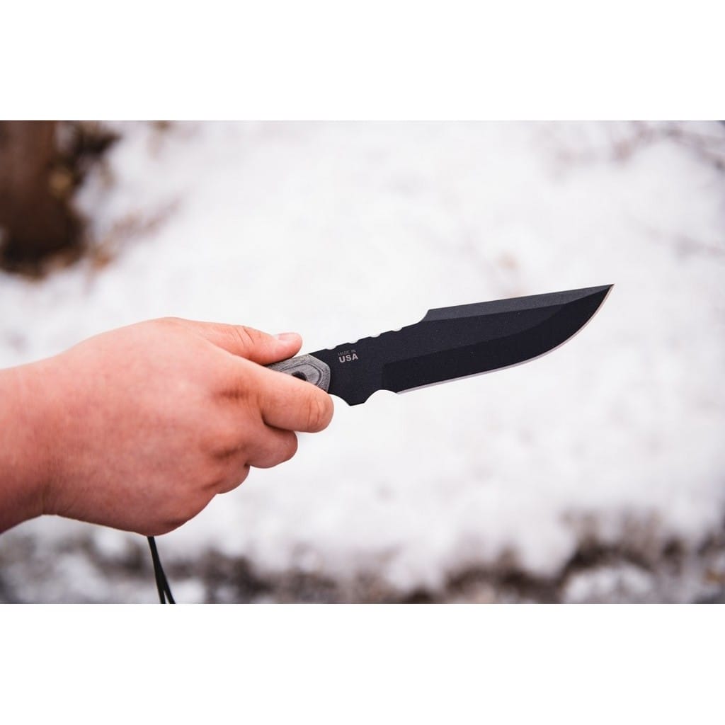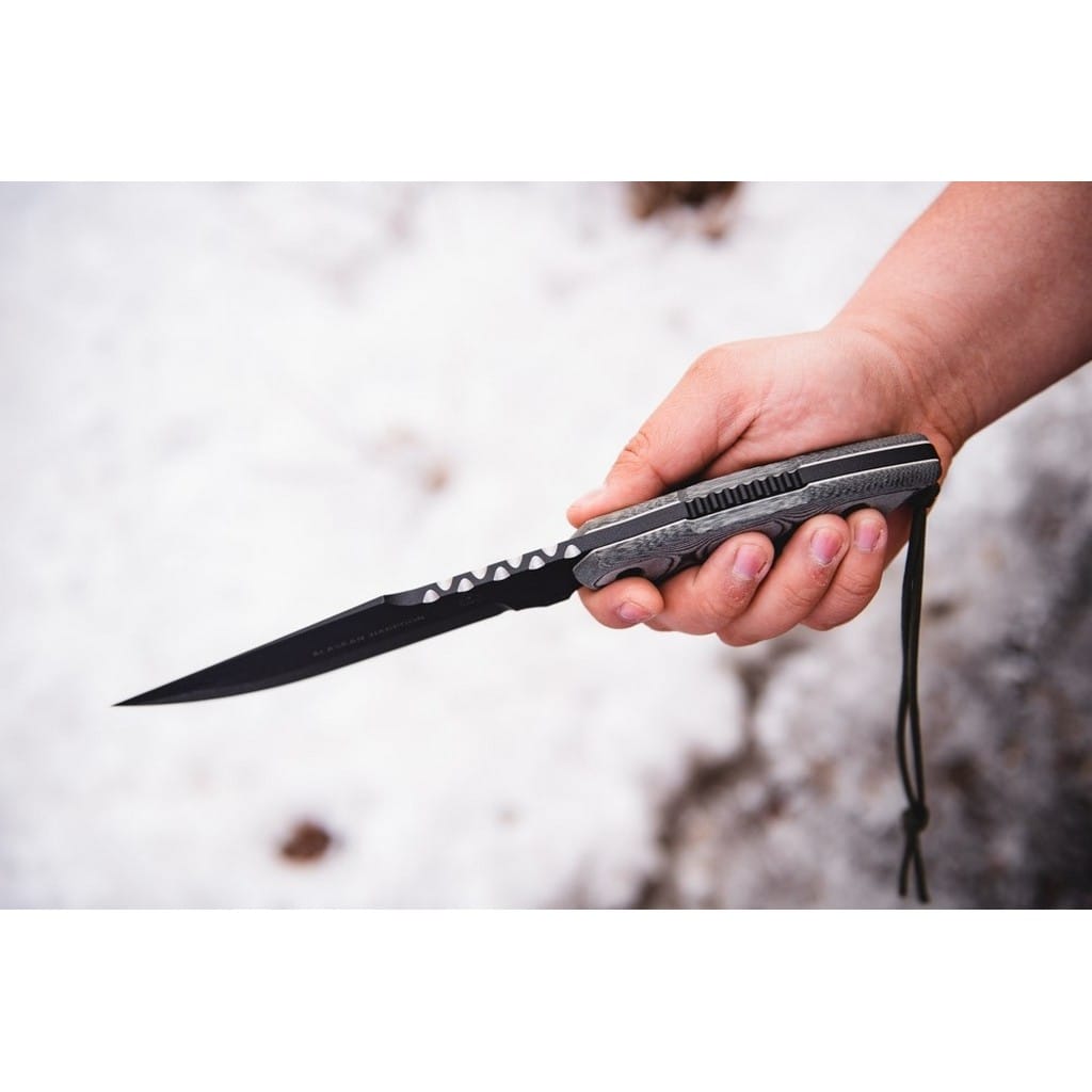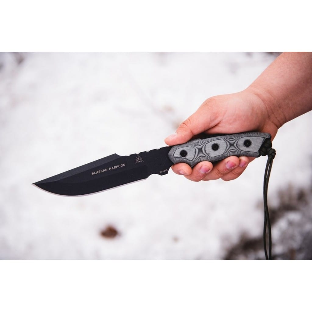 Alaskan Harpoon amerykańskiej firmy TOPS Knives to model cieszący się dużą popularnością zarówno wśród żołnierzy, jak i entuzjastów outdooru. Głownia o profilu Clip Point została wykonana ze stali węglowej 1095 odpornej na wykruszenia i pęknięcia oraz niesprawiającej trudności w ostrzeniu. W celu zabezpieczenia przed korozją i negatywnym działaniem czynników zewnętrznych pokryto ją antyodblaskową powłoką Black Traction. Jest to zastrzeżona nazwa wykończenia stosowana przez producenta, składającą się z hybrydowej bazy epoksydowej z dodatkiem poliestru. Nakłada się ją proszkowo na klingę i zapieka w piecu przez kilkanaście minut, w temperaturze około 210 stopni Celsjusza. Karbowany grzbiet klingi stanowi stabilne wsparcie dla kciuka i poprawia kontrolę nad nożem. Model cechuje się konstrukcją full tang, co zwiększa jego wytrzymałość i możliwości cięcia. Wyprofilowane okładziny chwytu z Micarty o fakturze płótna pewnie układają się w dłoni gwarantując komfort użytkowania. Na zakończeniu umieszczono otwór z przełożonym paracordem służącym do stworzenia oplotu na nadgarstek. Zestaw dopełnia czarna pochwa z nylonu balistycznego, kompatybilna z systemem Molle, umożliwiajaca wygodne przenoszenie całości na pasku spodni blisko ciała. Pokrowiec zawiera również zapasową linkę i kieszonkę na drobne akcesoria EDC, takie jak ostrzałka czy krzesiwo. W komplecie znajduje się także gwizdek survivalowy o mocy 116 decybeli, który z powodzeniem możemy zamocować w formie breloka przy kluczach lub innym wyposażeniu. Misją TOPS Knives jest produkowanie noży najwyższej jakości, charakteryzujących się wydajnością i funkcjonalnością podczas pracy. Firma współpracuje z projektantami posiadającymi odpowiednie doświadczenie militarne i survivalowe. Ich produkty tworzą osoby z różnych środowisk, żołnierze Navy Seals, Rangersi, instruktorzy sztuk walki, członkowie zespołu SWAT, a nawet indiańscy eksperci od broni. Wszystkie narzędzia są wytwarzane i ręcznie wykańczane w fabryce w USA, w sercu gór skalistych.