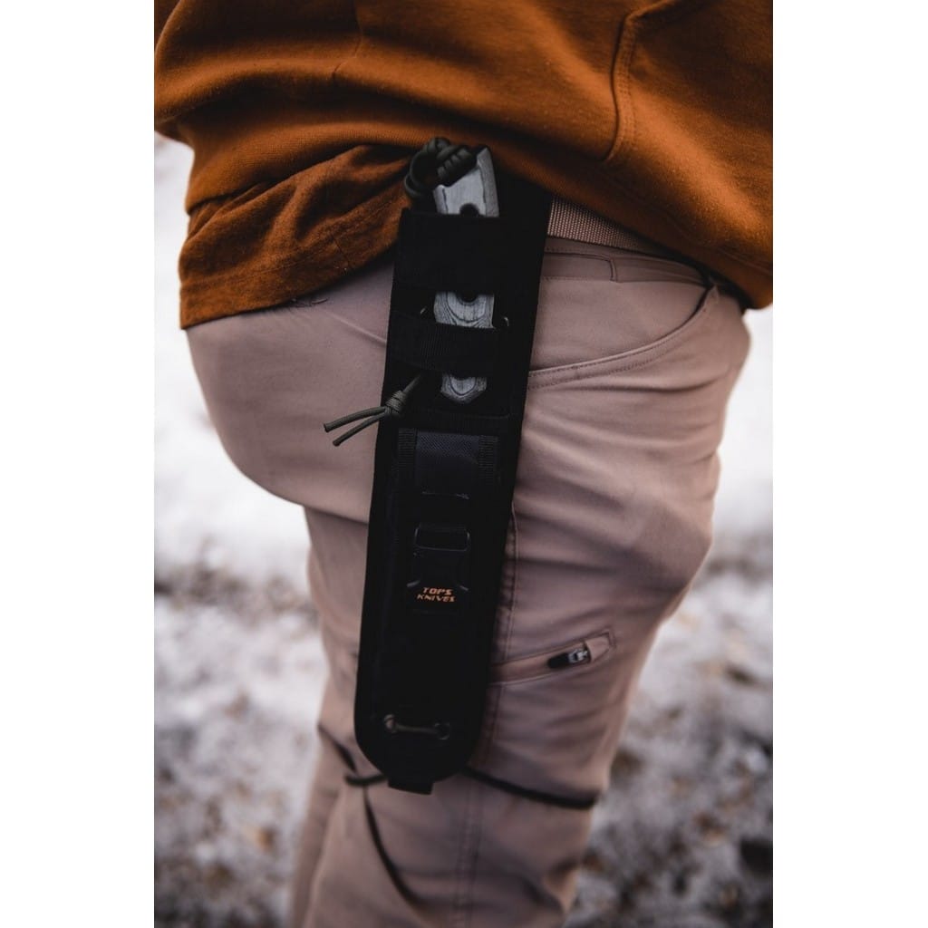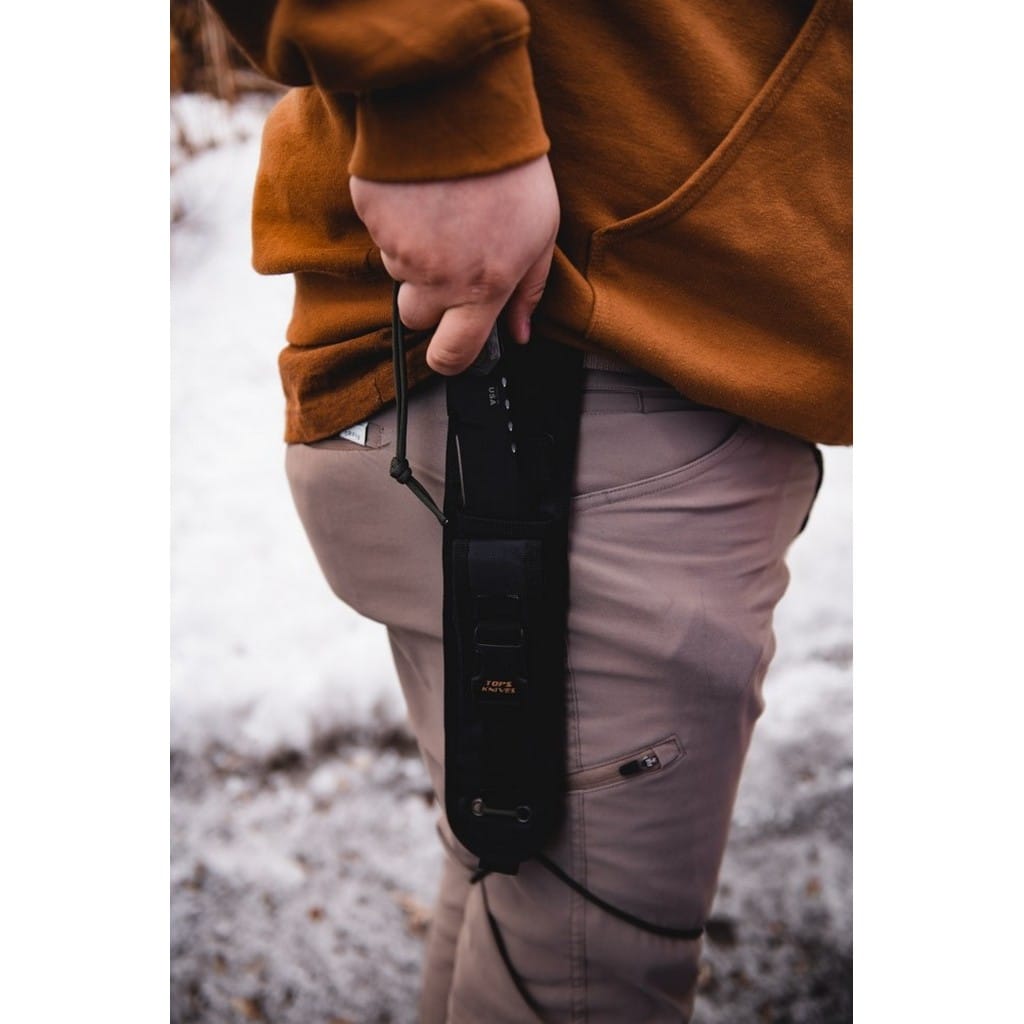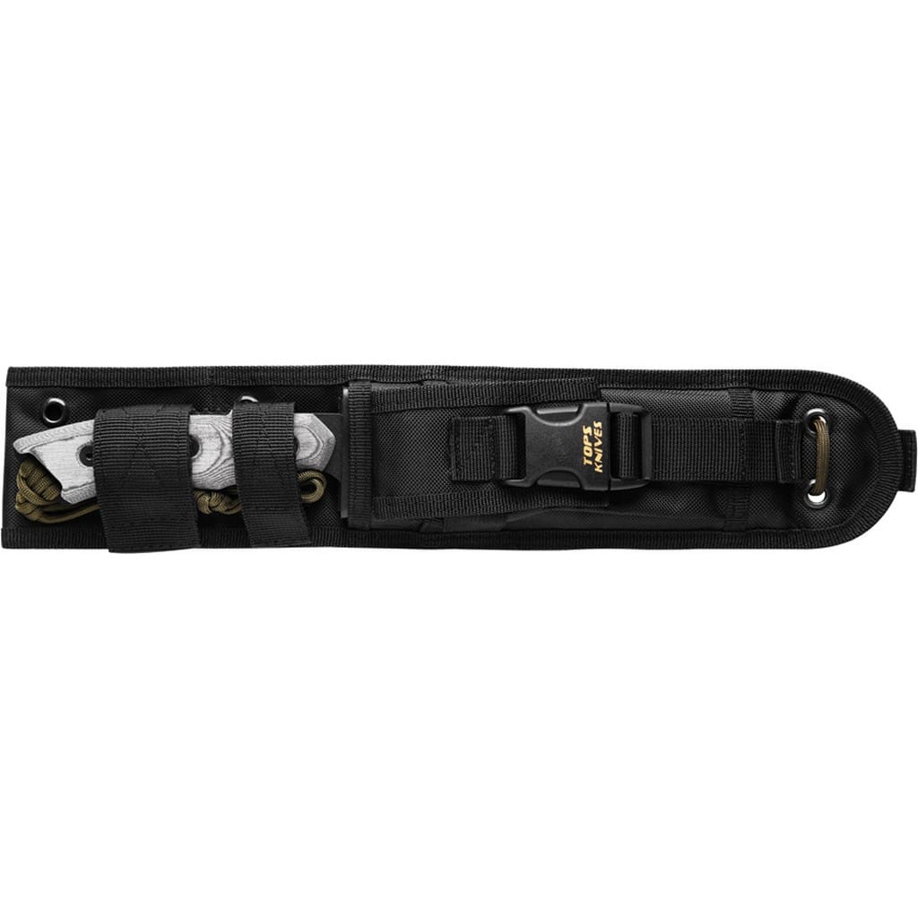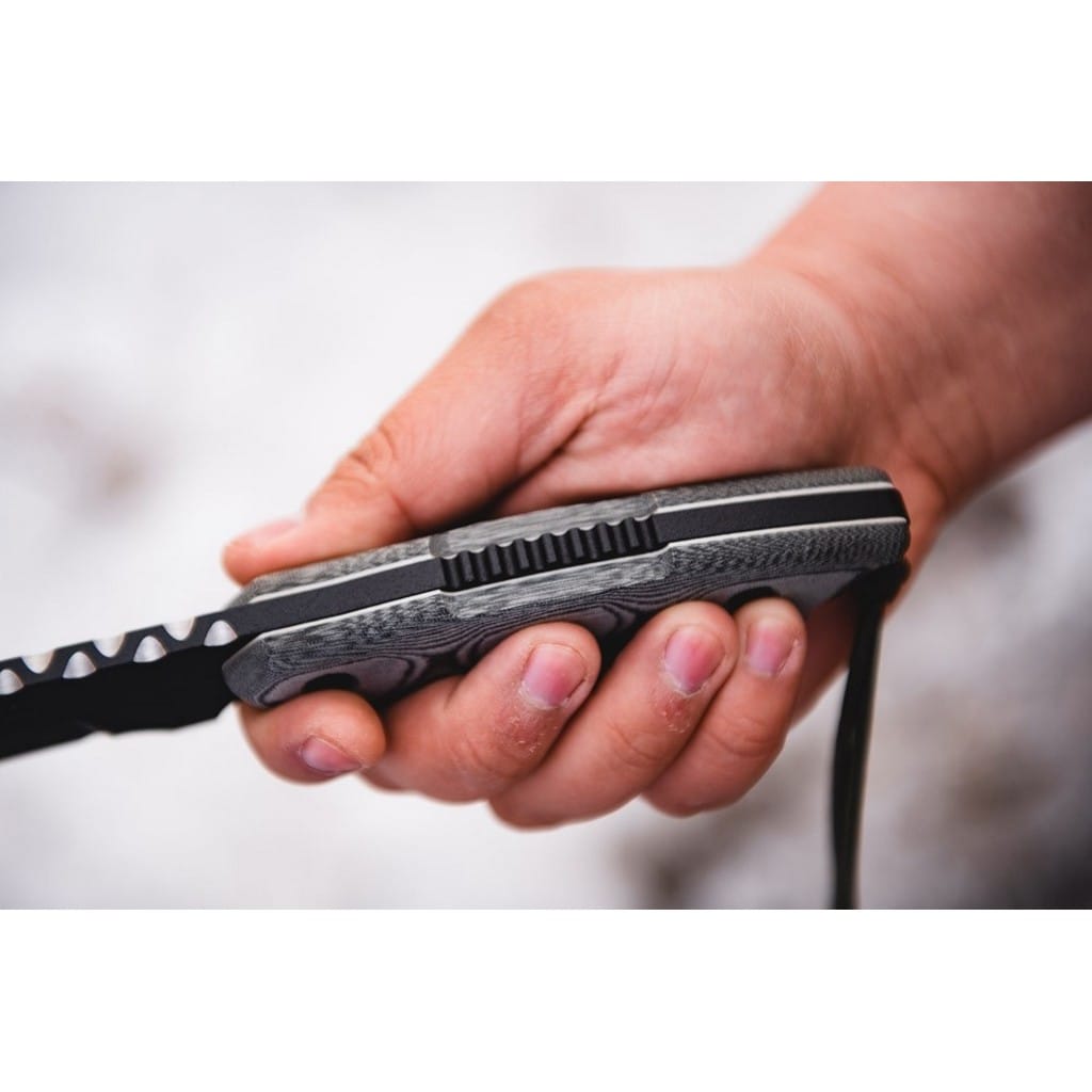 Alaskan Harpoon amerykańskiej firmy TOPS Knives to model cieszący się dużą popularnością zarówno wśród żołnierzy, jak i entuzjastów outdooru. Głownia o profilu Clip Point została wykonana ze stali węglowej 1095 odpornej na wykruszenia i pęknięcia oraz niesprawiającej trudności w ostrzeniu. W celu zabezpieczenia przed korozją i negatywnym działaniem czynników zewnętrznych pokryto ją antyodblaskową powłoką Black Traction. Jest to zastrzeżona nazwa wykończenia stosowana przez producenta, składającą się z hybrydowej bazy epoksydowej z dodatkiem poliestru. Nakłada się ją proszkowo na klingę i zapieka w piecu przez kilkanaście minut, w temperaturze około 210 stopni Celsjusza. Karbowany grzbiet klingi stanowi stabilne wsparcie dla kciuka i poprawia kontrolę nad nożem. Model cechuje się konstrukcją full tang, co zwiększa jego wytrzymałość i możliwości cięcia. Wyprofilowane okładziny chwytu z Micarty o fakturze płótna pewnie układają się w dłoni gwarantując komfort użytkowania. Na zakończeniu umieszczono otwór z przełożonym paracordem służącym do stworzenia oplotu na nadgarstek. Zestaw dopełnia czarna pochwa z nylonu balistycznego, kompatybilna z systemem Molle, umożliwiajaca wygodne przenoszenie całości na pasku spodni blisko ciała. Pokrowiec zawiera również zapasową linkę i kieszonkę na drobne akcesoria EDC, takie jak ostrzałka czy krzesiwo. W komplecie znajduje się także gwizdek survivalowy o mocy 116 decybeli, który z powodzeniem możemy zamocować w formie breloka przy kluczach lub innym wyposażeniu. Misją TOPS Knives jest produkowanie noży najwyższej jakości, charakteryzujących się wydajnością i funkcjonalnością podczas pracy. Firma współpracuje z projektantami posiadającymi odpowiednie doświadczenie militarne i survivalowe. Ich produkty tworzą osoby z różnych środowisk, żołnierze Navy Seals, Rangersi, instruktorzy sztuk walki, członkowie zespołu SWAT, a nawet indiańscy eksperci od broni. Wszystkie narzędzia są wytwarzane i ręcznie wykańczane w fabryce w USA, w sercu gór skalistych.
