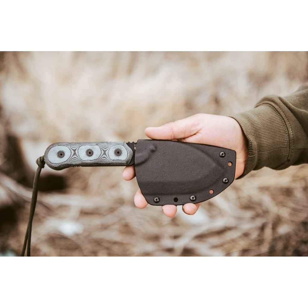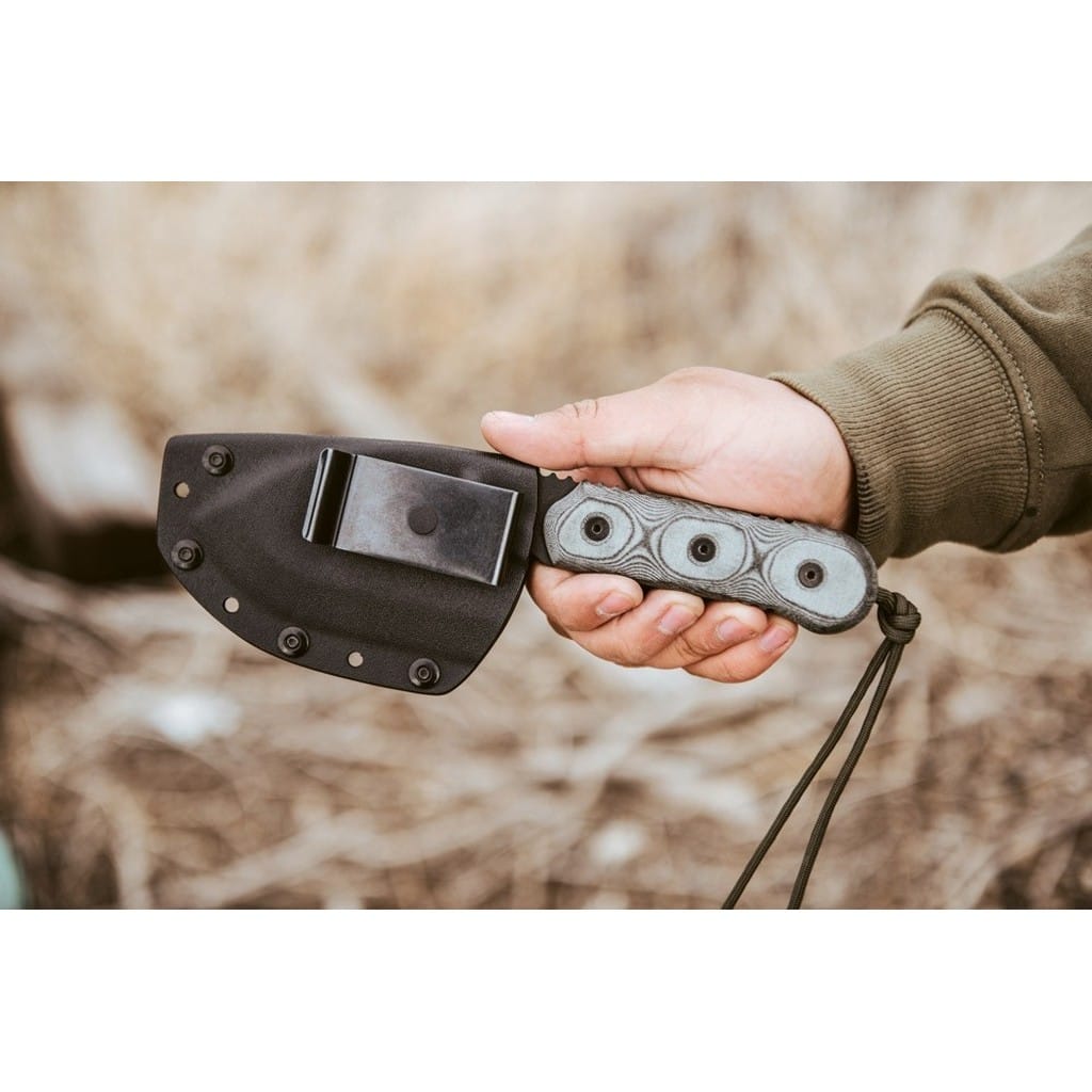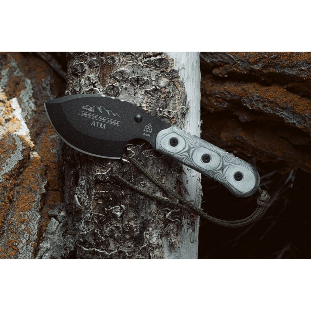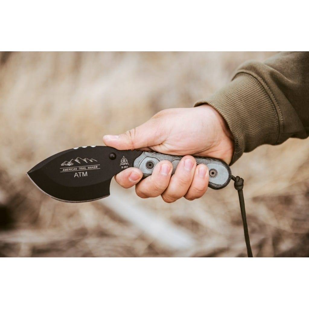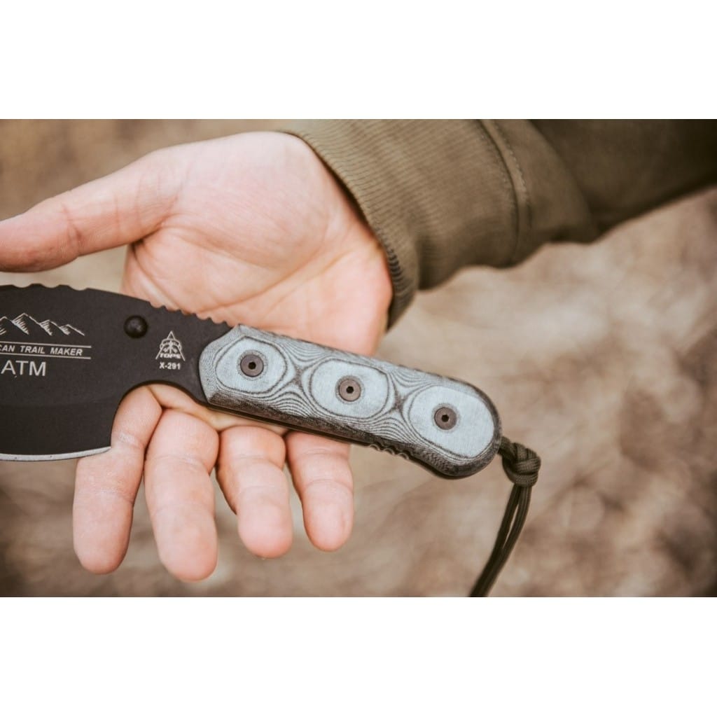 Model ATM, czyli American Trail Maker to świetny wybór dla wszystkich miłośników outdooru i survivalu. Model charakteryzuje się wysoką wydajnością i funkcjonalnością w terenie. Został wyprodukowany z najwyższej jakości materiałów przez amerykańską firmę TOPS Knives. Unikatowa konstrukcja ostrza doskonale sprawdzi się do różnorodnych zastosowań, począwszy od wycinania dziur w drewnie, na precyzyjnych pracach kończąc. Głownię o profilu Drop Point wykonano ze stali węglowej 1095 odpornej na wykruszenia i pęknięcia oraz niesprawiającej trudności w ostrzeniu. W celu zabezpieczenia przed korozją i negatywnym działaniem czynników zewnętrznych pokryto ją antyodblaskową powłoką Black Traction. Jest to zastrzeżona nazwa wykończenia stosowana przez producenta, składającą się z hybrydowej bazy epoksydowej z dodatkiem poliestru. Nakłada się ją proszkowo na klingę i zapieka w piecu przez kilkanaście minut, w temperaturze około 210 stopni Celsjusza. Karbowany grzbiet ostrza stanowi stabilne wsparcie dla kciuka, co poprawia kontrolę nad narzędziem. Model cechuje się budową full tang, do której w miejscu chwytu przymocowano śrubami okładziny z Micarty o fakturze płótna. Rękojeść gwarantuje dobrą przyczepność do dłoni i zapewnia komfort użytkowania. Na zakończeniu umieszczono dyskretny otwór z przełożonym paracordem służącym do stworzenia oplotu na nadgarstek. Zestaw dopełnia pochwa z kydexu wraz z obrotowym klipsem pozwalającym na bezpieczne przenoszenie całości blisko ciała i pod dowolnym kątem. W komplecie znajduje się także gwizdek survivalowy o mocy 116 decybeli, który z powodzeniem możemy zamocować przy kluczach w formie breloka lub schować do kieszeni. TOPS Knives współpracuje z projektantami posiadającymi odpowiednie doświadczenie militarne i survivalowe. Ich produkty tworzą osoby z różnych środowisk, komandosi Navy Seals, Rangersi, instruktorzy sztuk walki, członkowie zespołu SWAT, a nawet indiańscy eksperci od broni. Wszystkie narzędzia są wytwarzane i ręcznie wykańczane w fabryce w USA, w sercu gór skalistych.