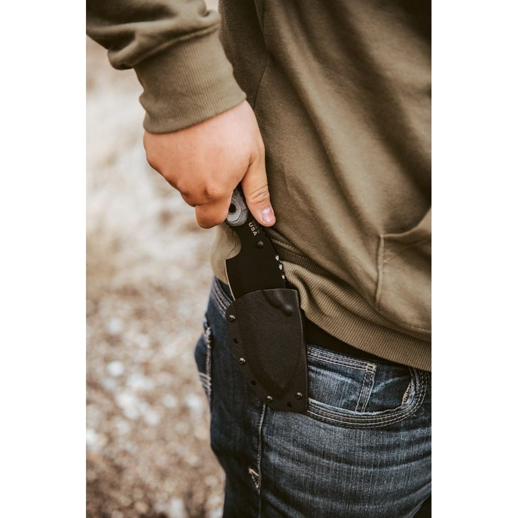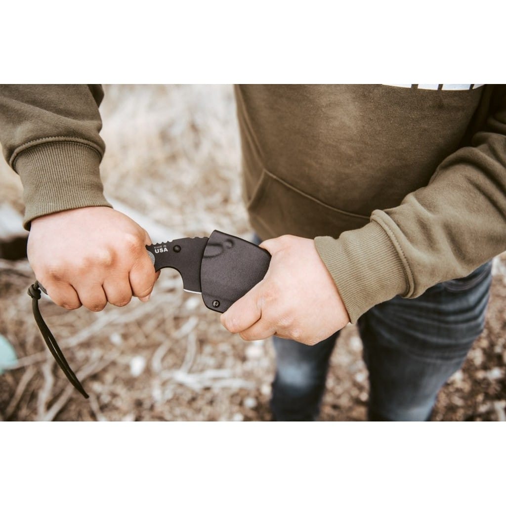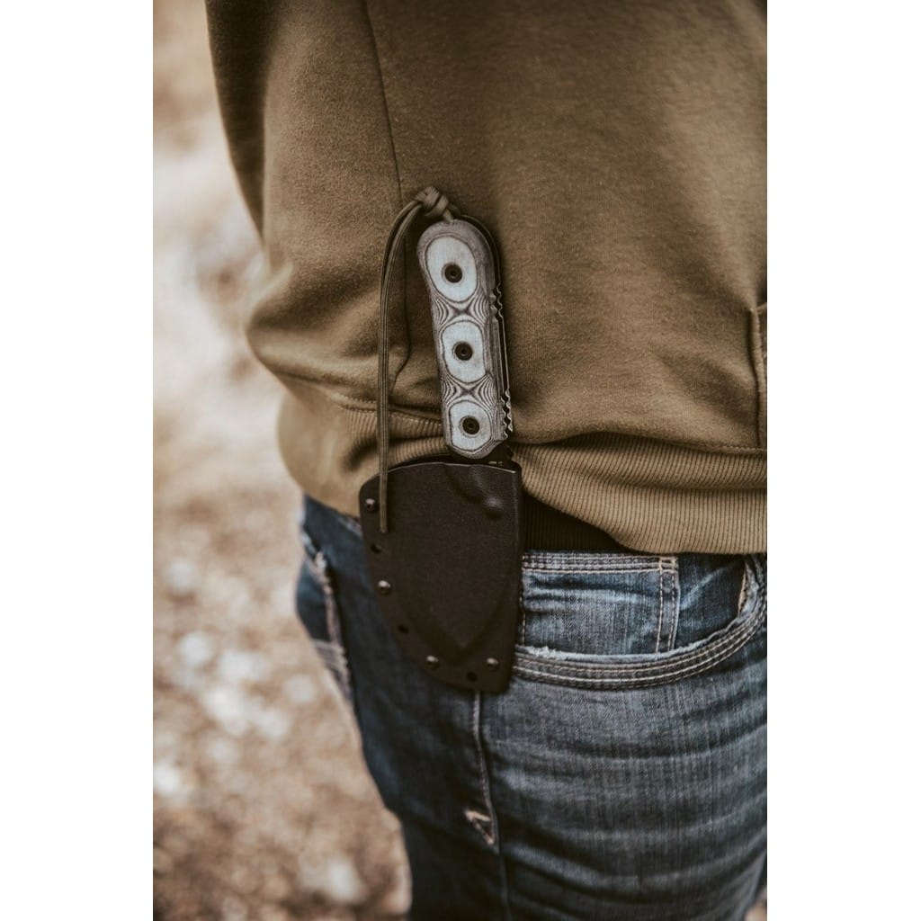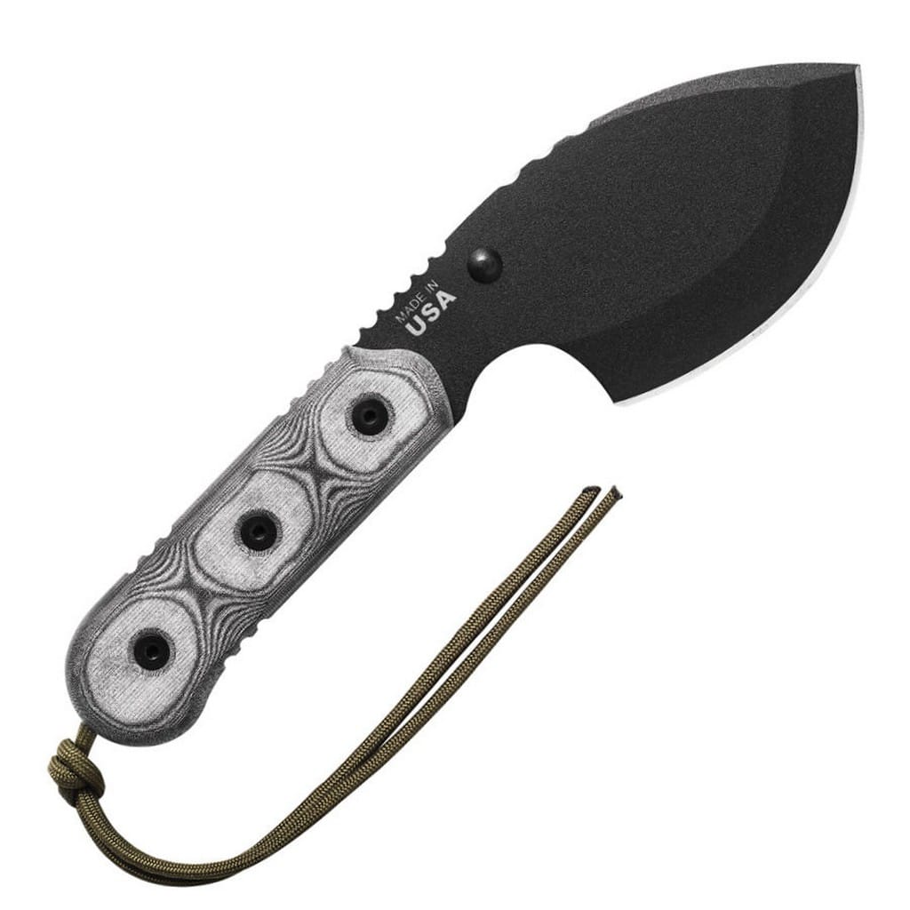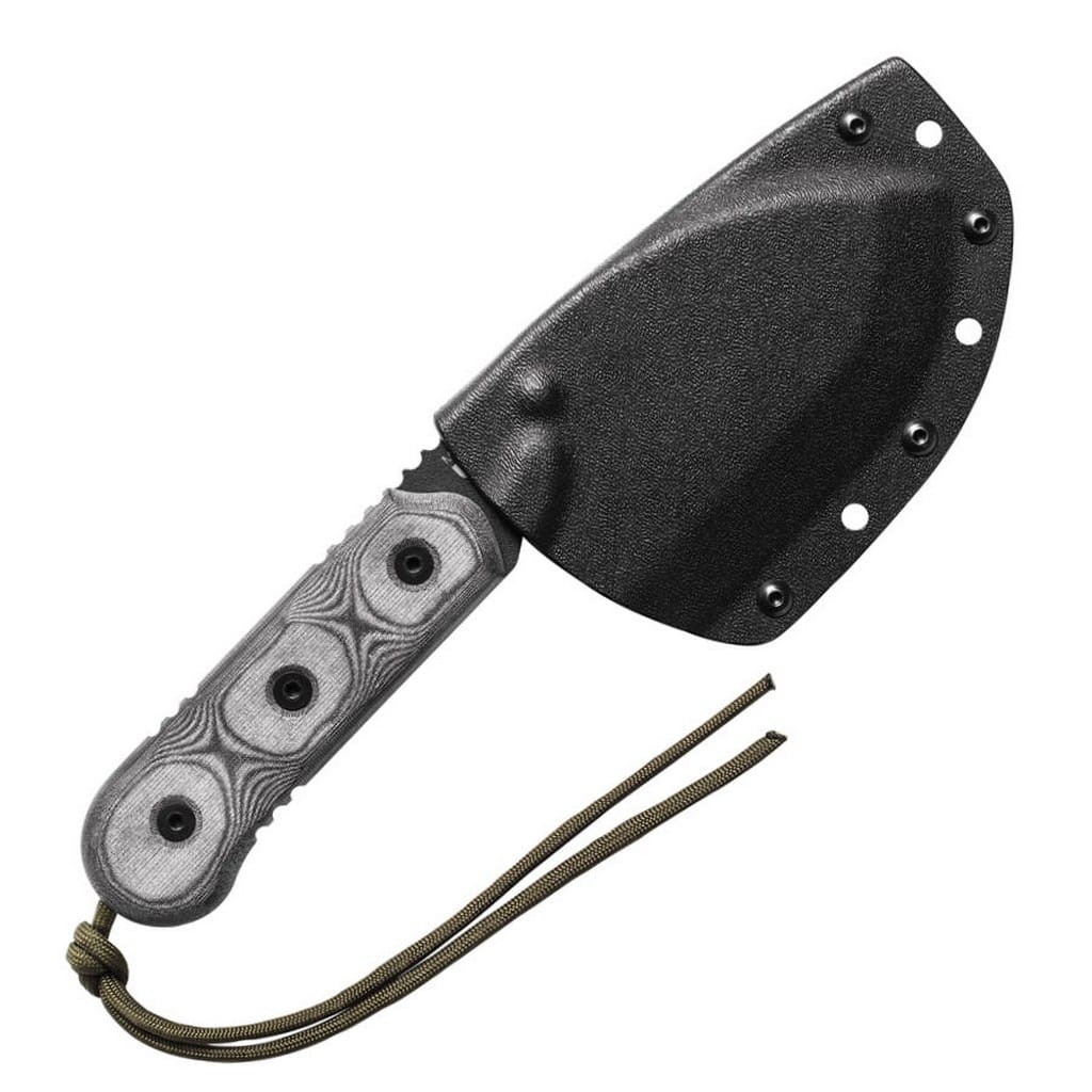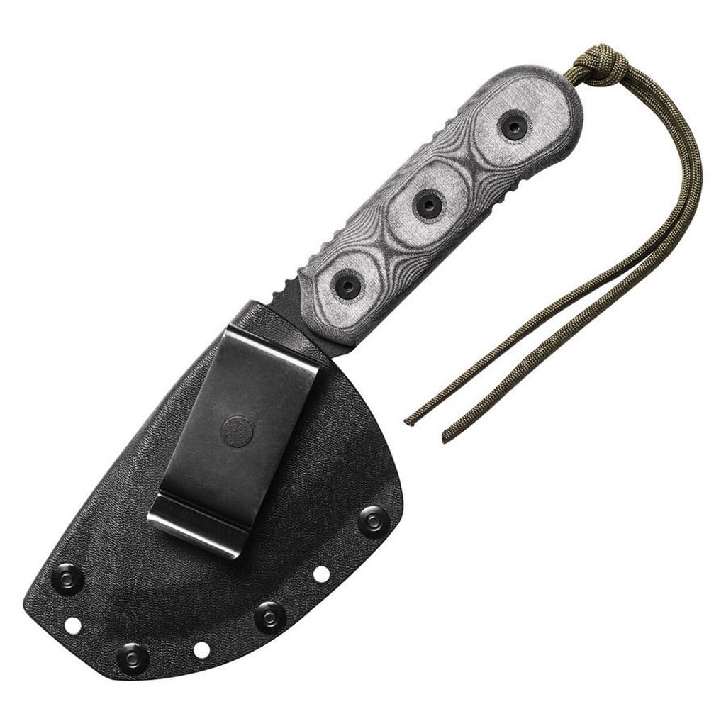 Model ATM, czyli American Trail Maker to świetny wybór dla wszystkich miłośników outdooru i survivalu. Model charakteryzuje się wysoką wydajnością i funkcjonalnością w terenie. Został wyprodukowany z najwyższej jakości materiałów przez amerykańską firmę TOPS Knives. Unikatowa konstrukcja ostrza doskonale sprawdzi się do różnorodnych zastosowań, począwszy od wycinania dziur w drewnie, na precyzyjnych pracach kończąc. Głownię o profilu Drop Point wykonano ze stali węglowej 1095 odpornej na wykruszenia i pęknięcia oraz niesprawiającej trudności w ostrzeniu. W celu zabezpieczenia przed korozją i negatywnym działaniem czynników zewnętrznych pokryto ją antyodblaskową powłoką Black Traction. Jest to zastrzeżona nazwa wykończenia stosowana przez producenta, składającą się z hybrydowej bazy epoksydowej z dodatkiem poliestru. Nakłada się ją proszkowo na klingę i zapieka w piecu przez kilkanaście minut, w temperaturze około 210 stopni Celsjusza. Karbowany grzbiet ostrza stanowi stabilne wsparcie dla kciuka, co poprawia kontrolę nad narzędziem. Model cechuje się budową full tang, do której w miejscu chwytu przymocowano śrubami okładziny z Micarty o fakturze płótna. Rękojeść gwarantuje dobrą przyczepność do dłoni i zapewnia komfort użytkowania. Na zakończeniu umieszczono dyskretny otwór z przełożonym paracordem służącym do stworzenia oplotu na nadgarstek. Zestaw dopełnia pochwa z kydexu wraz z obrotowym klipsem pozwalającym na bezpieczne przenoszenie całości blisko ciała i pod dowolnym kątem. W komplecie znajduje się także gwizdek survivalowy o mocy 116 decybeli, który z powodzeniem możemy zamocować przy kluczach w formie breloka lub schować do kieszeni. TOPS Knives współpracuje z projektantami posiadającymi odpowiednie doświadczenie militarne i survivalowe. Ich produkty tworzą osoby z różnych środowisk, komandosi Navy Seals, Rangersi, instruktorzy sztuk walki, członkowie zespołu SWAT, a nawet indiańscy eksperci od broni. Wszystkie narzędzia są wytwarzane i ręcznie wykańczane w fabryce w USA, w sercu gór skalistych.