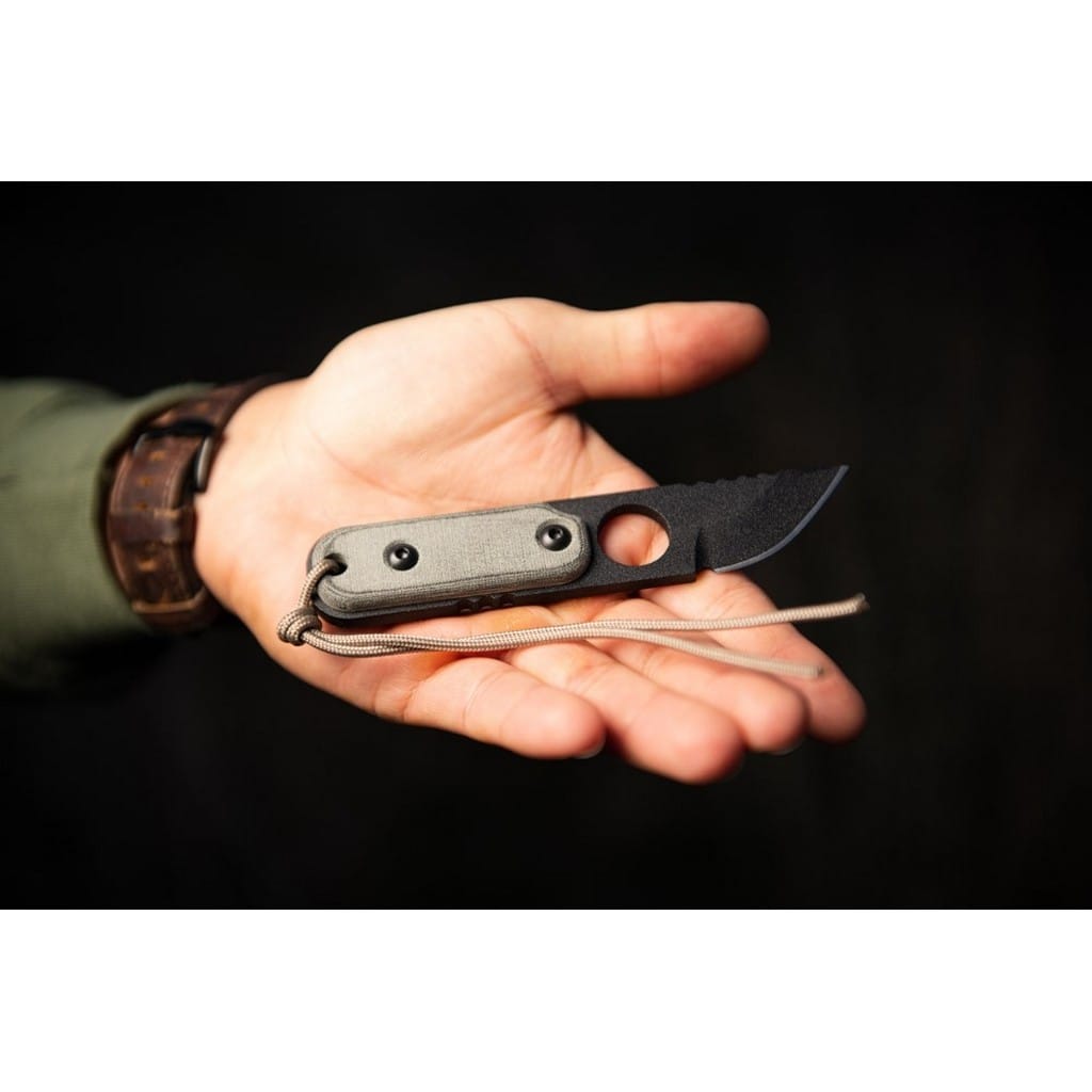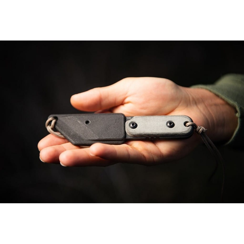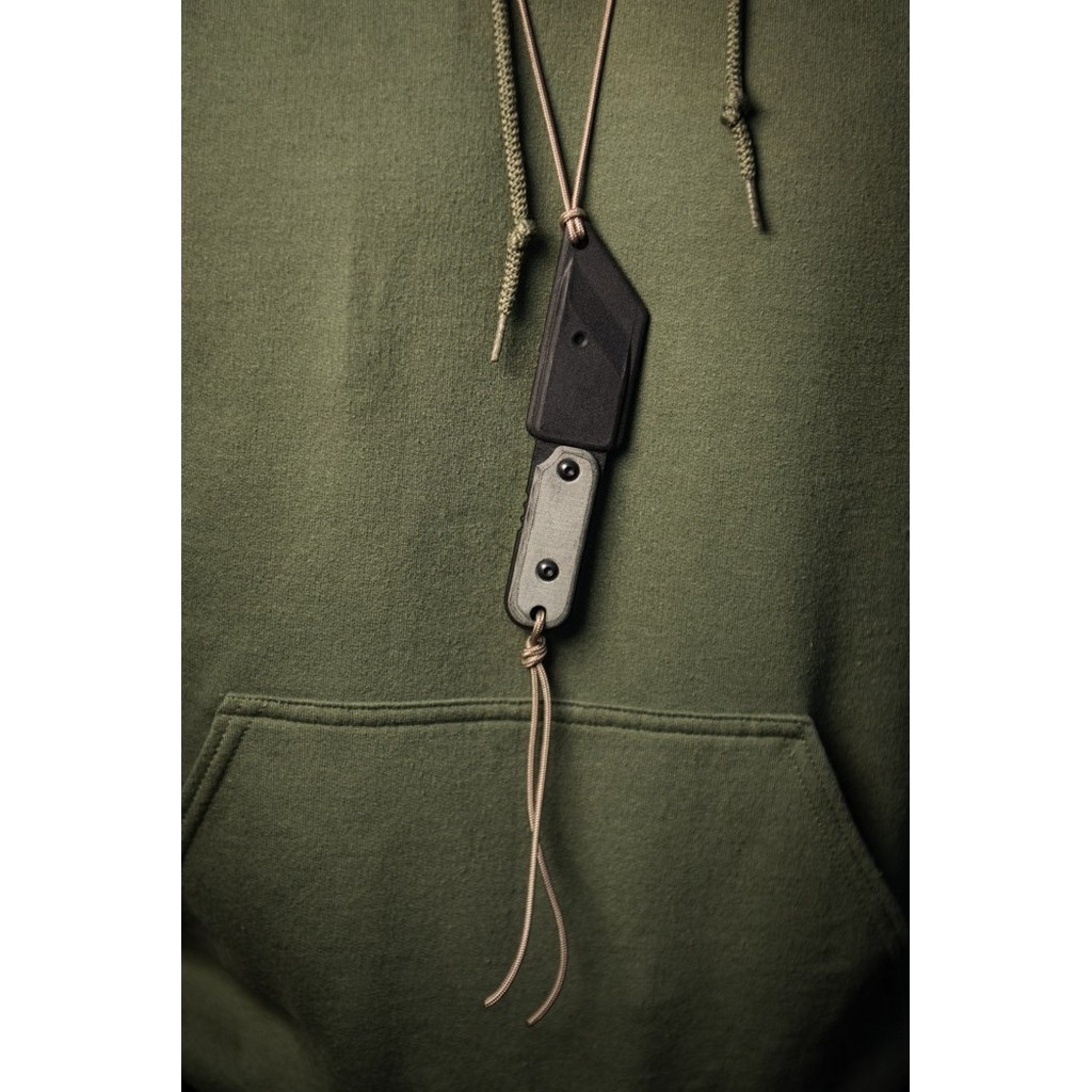 ALRT w wersji XL (Anywhere Last Resort) to kompaktowe, niezawodne i wyjątkowo wytrzymałe narzędzie zaprojektowane do codziennego użytku. Model możemy wygodnie przenosić na szyi, dzięki dołączonej do zestawu pochwie z kydexu wraz z linką paracord i zapięciem. Głownia o uniwersalnym profilu Drop Point została wykonana ze stali węglowej 1095 odpornej na wykruszenia i pęknięcia oraz niesprawiającej trudności w ostrzeniu. Pokryto ją powłoką Black Traction, która jest zastrzeżoną nazwą wykończenia stosowaną przez TOPS, składającą się z hybrydowej bazy epoksydowej z dodatkiem poliestru. Nakłada się ją proszkowo na ostrze i zapieka w piecu przez kilkanaście minut, w temperaturze około 210 stopni Celsjusza. Karbowane krawędzie i duży otwór na klindze ułatwiają chwytanie noża i sprawne posługiwanie się nim, a także poprawiają bezpieczeństwo pracy. Przymocowane śrubami do stalowej konstrukcji full tang okładziny rękojeści zrobiono z Micarty o fakturze płótna. Na zakończeniu znajduje się niewielka dziurka z zamocowaną linką ułatwiającą wyciąganie narzędzia z pochwy. Dodatkowo do zestawu dołączono gwizdek survivalowy o mocy 116 decybeli, który z powodzeniem możemy przytroczyć przy kluczach w formie breloka lub schować w kieszeni. ALRT XL to doskonały model EDC, który sprawdzi się w sytuacjach, gdy potrzebujemy szybko sięgnąć po ostrze i coś przeciąć. Misją TOPS Knives jest produkowanie noży najwyższej jakości, charakteryzujących się wydajnością i niezawodnością w terenie. Firma współpracuje z projektantami posiadającymi odpowiednie doświadczenie militarne i survivalowe. Ich produkty tworzą osoby z różnych środowisk, żołnierze Navy Seals, Rangersi, instruktorzy sztuk walki, członkowie zespołu SWAT, a nawet indiańscy eksperci od broni. Wszystkie narzędzia są wytwarzane i ręcznie wykańczane w zakładzie w USA, w sercu gór skalistych.