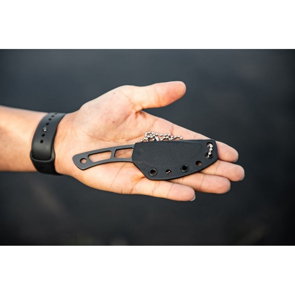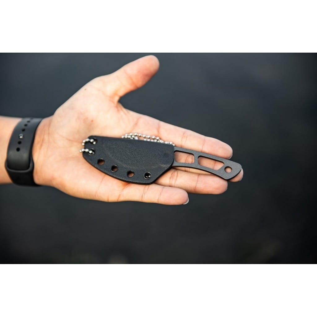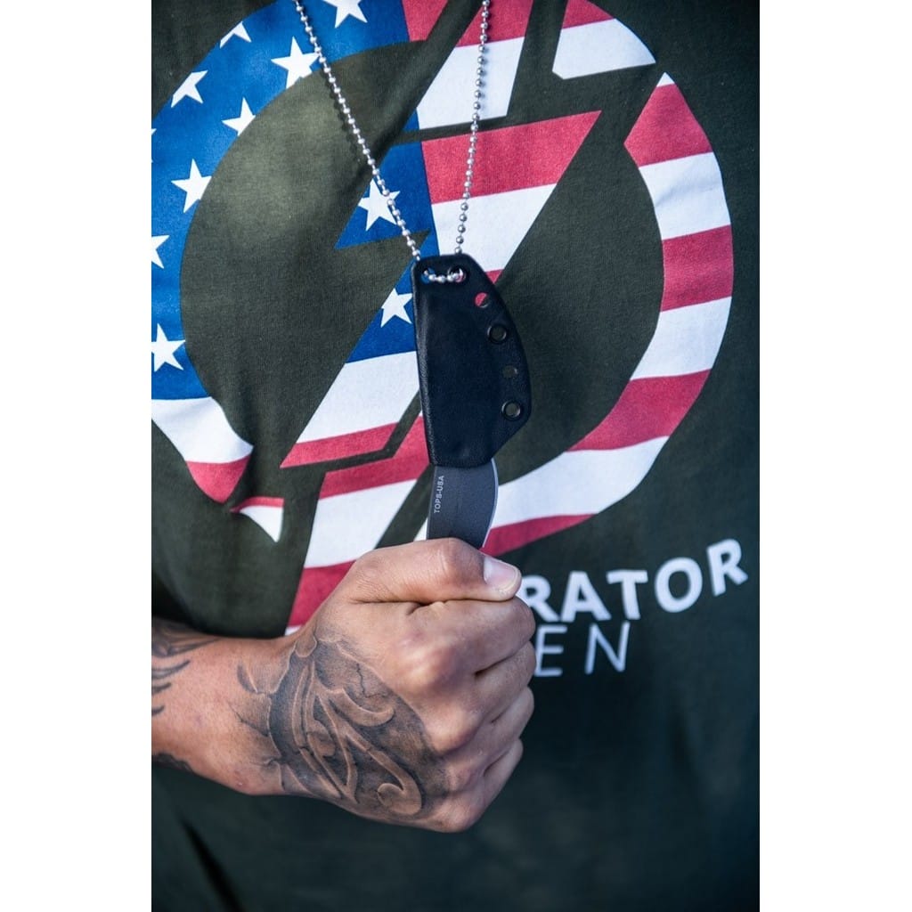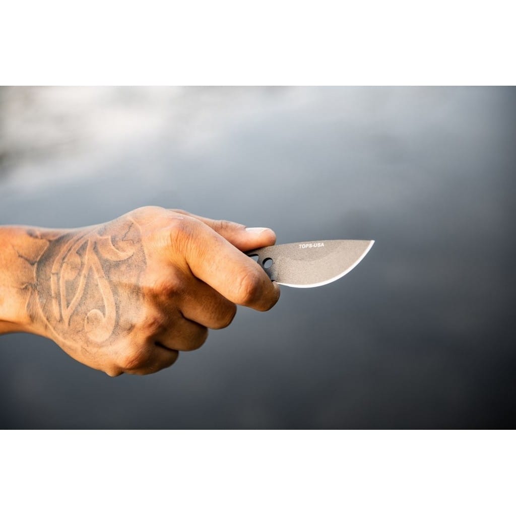 Backup to model, który idealnie sprawdzi się jako zapasowe ostrze do noszenia na co dzień. Jego płaski profil sprawia, że schowany pod koszulą nie zostanie prawie zauważony oraz z łatwością zmieści się nawet w damskiej torebce. Bezpieczne transportowanie narzędzia umożliwia znajdująca się w zestawie pochwa z kydexu. Posiada łańcuszek kulkowy pozwalający na wygodne przenoszenie całości na karku. Został zaprojektowany przez Leo Espinozę, prezesa TOP Knives oraz światowej sławy producenta i projektanta noży, doskonale łączącego funkcjonalność z minimalizmem. Ostrze wykonano ze stali węglowej 1095 odpornej na wykruszenia i pęknięcia oraz niesprawiającej trudności w ostrzeniu. Klingę wykończono matową powłoką Cerakote w szarym kolorze. Jest to ceramiczna i opatentowana formuła na bazie polimerów oferująca odporność na zarysowania, korozję, ciepło i chemikalia. Głownia o uniwersalnym profilu Drop Point bardzo dobrze sprawdzi się do drobnych prac obozowych, zadań EDC, ale również poradzi sobie z małą zwierzyną łowną, rybami, czy ptactwem. Konstrukcja full tang ze szkieletową rękojeścią, dzięki ergonomicznemu wyprofilowaniu świetnie leży w dłoni. Użytkownik dla poprawy komfortu chwytu może owinąć ją linką, wedle potrzeb i indywidualnych preferencji. Dodatkowo na zakończeniu znajduje się otwór na paracord lub brelok ozdobny. Do kompletu dołączono gwizdek survivalowy o mocy 116 decybeli, który z powodzeniem możemy zamocować przy kluczach lub schować do kieszeni. Misją TOPS Knives jest produkowanie noży najwyższej jakości, charakteryzujących się wydajnością i niezawodnością w terenie. Firma współpracuje z projektantami posiadającymi odpowiednie doświadczenie militarne i survivalowe. Ich produkty tworzą osoby z różnych środowisk, żołnierze Navy Seals, Rangersi, instruktorzy sztuk walki, członkowie zespołu SWAT, a nawet indiańscy eksperci od broni. Wszystkie narzędzia są wytwarzane i ręcznie wykańczane w zakładzie w USA, w sercu gór skalistych.