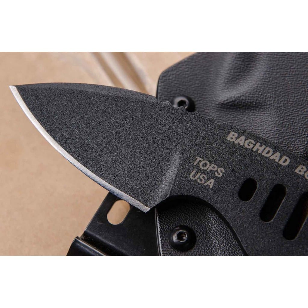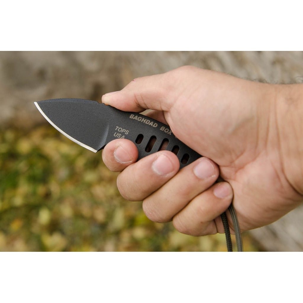 Baghdad Box Cutter to niewielki nóż EDC zaprojektowany przez amerykańską firmę TOPS Knives. Model doskonale sprawdzi się w codziennym użytkowaniu, jakie skuteczne i ostre narzędzie do cięcia. Głownia o profilu Spear Point została wykonana ze stali węglowej 1095 odpornej na wykruszenia i pęknięcia oraz niesprawiającej trudności w ostrzeniu. W celu zabezpieczenia przed korozją i negatywnym działaniem czynników zewnętrznych pokryto ją antyodblaskową powłoką Black Traction. Jest to zastrzeżona nazwa wykończenia stosowana przez producenta, składającą się z hybrydowej bazy epoksydowej z dodatkiem poliestru. Nakłada się ją proszkowo na klingę i zapieka w piecu przez kilkanaście minut, w temperaturze około 210 stopni Celsjusza. Karbowany grzbiet ostrza stanowi stabilne wsparcie dla kciuka, co poprawia kontrolę nad narzędziem. Konstrukcja full tang ze szkieletową rękojeścią, dzięki ergonomicznemu wyprofilowaniu świetnie leży w dłoni mimo niewielkich rozmiarów. Użytkownik dla poprawy komfortu chwytu może owinąć ją paracordem, wedle indywidualnych potrzeb i preferencji. Na zakończeniu umieszczono otwór z przełożoną linką do wygodnego wyciągania noża. Zestaw dopełnia pochwa z kydexu pozwalająca na bezpieczne przenoszenie całości blisko ciała. W komplecie znajduje się również gwizdek survivalowy o mocy 116 decybeli, który z powodzeniem możemy zamocować przy kluczach w formie breloka lub schować do kieszeni. Misją TOPS Knives jest produkowanie noży najwyższej jakości, charakteryzujących się wydajnością i niezawodnością w terenie. Firma współpracuje z projektantami posiadającymi odpowiednie doświadczenie militarne i survivalowe. Ich produkty tworzą osoby z różnych środowisk, żołnierze Navy Seals, Rangersi, instruktorzy sztuk walki, członkowie zespołu SWAT, a nawet indiańscy eksperci od broni. Wszystkie narzędzia są wytwarzane i ręcznie wykańczane w fabryce w USA, w sercu gór skalistych.