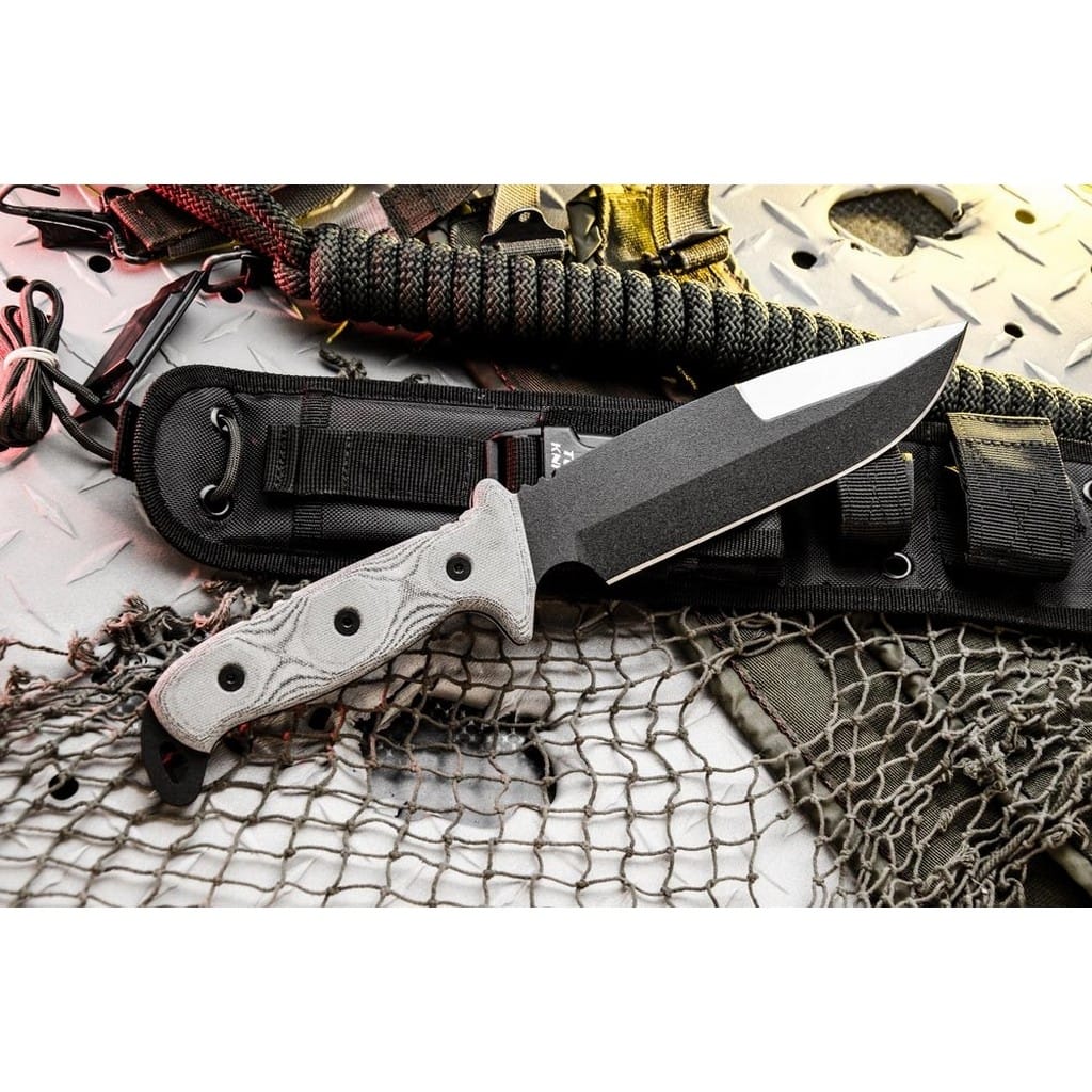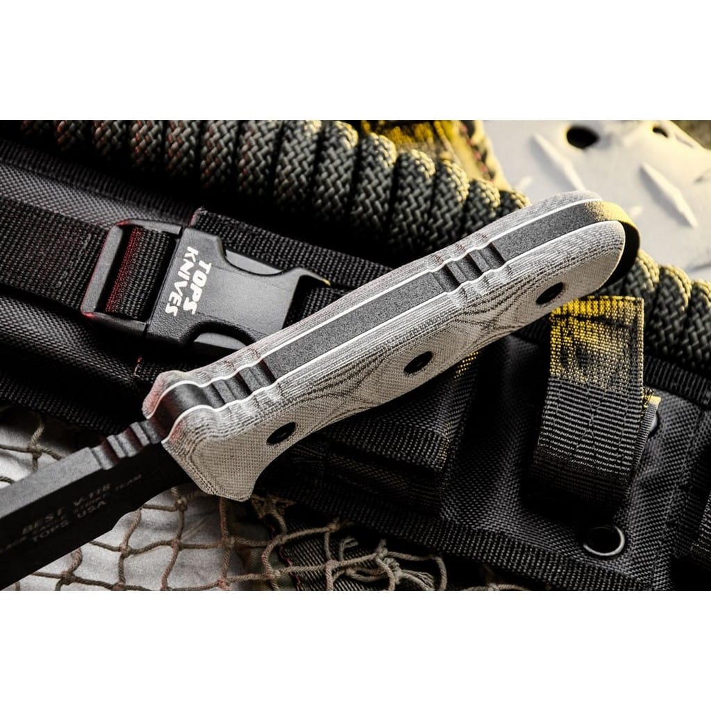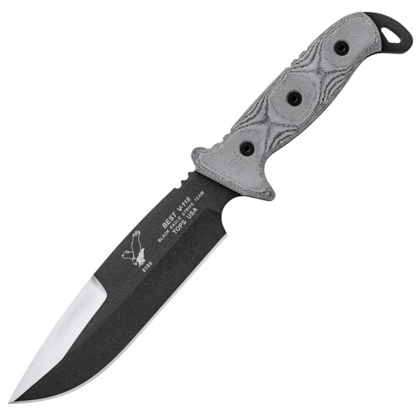 Model B.E.S.T. czyli Black Eagle Strike Team to duży i masywny nóż survivalowo-taktyczny zaprojektowany przez amerykańską firmę TOPS Knives. Narzędzie poradzi sobie z niejednym wymagającym zadaniem jakie pojawi się na jego drodze podczas aktywności w terenie. Szeroka głownia o profilu Drop Point została wykonana ze stali węglowej 1095 odpornej na wykruszenia i pęknięcia oraz niesprawiającej trudności w ostrzeniu. W celu zabezpieczenia przed korozją i negatywnym działaniem czynników zewnętrznych pokryto ją antyodblaskową powłoką Black Traction. Jest to zastrzeżona nazwa wykończenia stosowana przez producenta, składającą się z hybrydowej bazy epoksydowej z dodatkiem poliestru. Nakłada się ją proszkowo na klingę i zapieka w piecu przez kilkanaście minut, w temperaturze około 210 stopni Celsjusza. Bezpieczeństwo zapewnia obustronny jelec chroniący palce przed ich przypadkowym zsunięciem się na krawędź tnącą. Model cechuje się konstrukcją full tang zwiększającą wytrzymałość i możliwości eksploatacji noża na świeżym powietrzu. Wyprofilowane okładziny chwytu z Micarty o fakturze płótna pewnie układają się w dłoni gwarantując komfort użytkowania. Na zakończeniu umieszczono duży otwór pozwalający na przełożenie paracordu i stworzenie oplotu na nadgarstek. Zestaw dopełnia czarna pochwa z nylonu balistycznego, kompatybilna z systemem Molle, umożliwiajaca wygodne przenoszenie narzędzia na pasku spodni blisko ciała. Pokrowiec zawiera również paracord i kieszonkę na drobne akcesoria EDC, takie jak ostrzałka czy krzesiwo. W komplecie znajduje się także gwizdek survivalowy o mocy 116 decybeli, który z powodzeniem możemy zamocować przy kluczach w formie breloka lub schować do kieszeni. Misją TOPS Knives jest produkowanie noży najwyższej jakości, charakteryzujących się wydajnością i funkcjonalnością podczas pracy. Firma współpracuje z projektantami posiadającymi odpowiednie doświadczenie militarne i survivalowe. Ich produkty tworzą osoby z różnych środowisk, żołnierze Navy Seals, Rangersi, instruktorzy sztuk walki, członkowie zespołu SWAT, a nawet indiańscy eksperci od broni. Wszystkie narzędzia są wytwarzane i ręcznie wykańczane w fabryce w USA, w sercu gór skalistych.