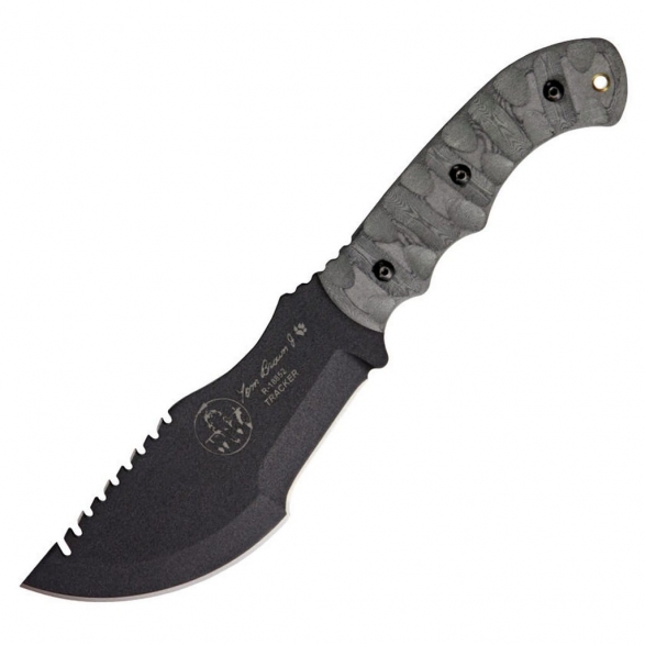 Tom Brown Tracker amerykańskiej firmy TOPS to duży i wytrzymały nóż survivalowy o drapieżnym wyglądzie, zaprojektowany do aktywności na świeżym powietrzu. Model został wykorzystany w filmie Nożownik (The Hunted) z 2003 roku, w roli głównej z Tommy Lee Jones. Niebywałą zaletą narzędzia jest piła umieszczona na grzbiecie szerokiej głowni Clip Point. Dzięki niej poradzimy sobie z cięciem gałęzi, czy kości. Ostrze wykonano ze stali węglowej 1095 odpornej na wykruszenia i pęknięcia oraz niesprawiającej trudności w ostrzeniu. W celu zabezpieczenia przed korozją i negatywnym działaniem czynników zewnętrznych pokryto ją antyodblaskową powłoką Black Traction. Jest to zastrzeżona nazwa wykończenia stosowana przez producenta, składającą się z hybrydowej bazy epoksydowej z dodatkiem poliestru. Nakłada się ją proszkowo na klingę i zapieka w piecu przez kilkanaście minut, w temperaturze około 210 stopni Celsjusza. Karbowana górna krawędź głowni stanowi stabilne wsparcie dla kciuka, co poprawia bezpieczeństwo podczas pracy. Do stalowej konstrukcji full tang przymocowano śrubami okładziny z Micarty o fakturze płótna. Ergonomicznie wyprofilowana rękojeść, z poprawiającymi przyczepność nierównościami, gwarantuje pewny chwyt w każdej sytuacji. Na zakończeniu umieszczono otwór umożliwiający przełożenie paracordu i stworzenie oplotu na nadgarstek. Całość dopełnia pochwa z kydexu wraz z dwoma obrotowymi klipsami. Pozwalają na bezpieczne przenoszenie narzędzia blisko ciała lub przy wyposażeniu oraz pod dowolnym kątem. Do kompletu dołączono także gwizdek survivalowy o mocy 116 decybeli, który z powodzeniem możemy zamocować przy kluczach w formie breloka lub schować do kieszeni. Misją TOPS Knives jest produkowanie noży najwyższej jakości, charakteryzujących się wydajnością i niezawodnością w terenie. Firma współpracuje z projektantami posiadającymi odpowiednie doświadczenie militarne i survivalowe. Ich produkty tworzą osoby z różnych środowisk, żołnierze Navy Seals, Rangersi, instruktorzy sztuk walki, członkowie zespołu SWAT, a nawet indiańscy eksperci od broni. Wszystkie narzędzia są wytwarzane i ręcznie wykańczane w zakładzie w USA, w sercu gór skalistych.