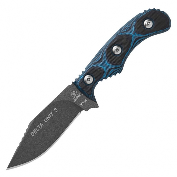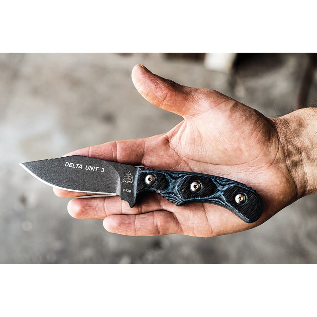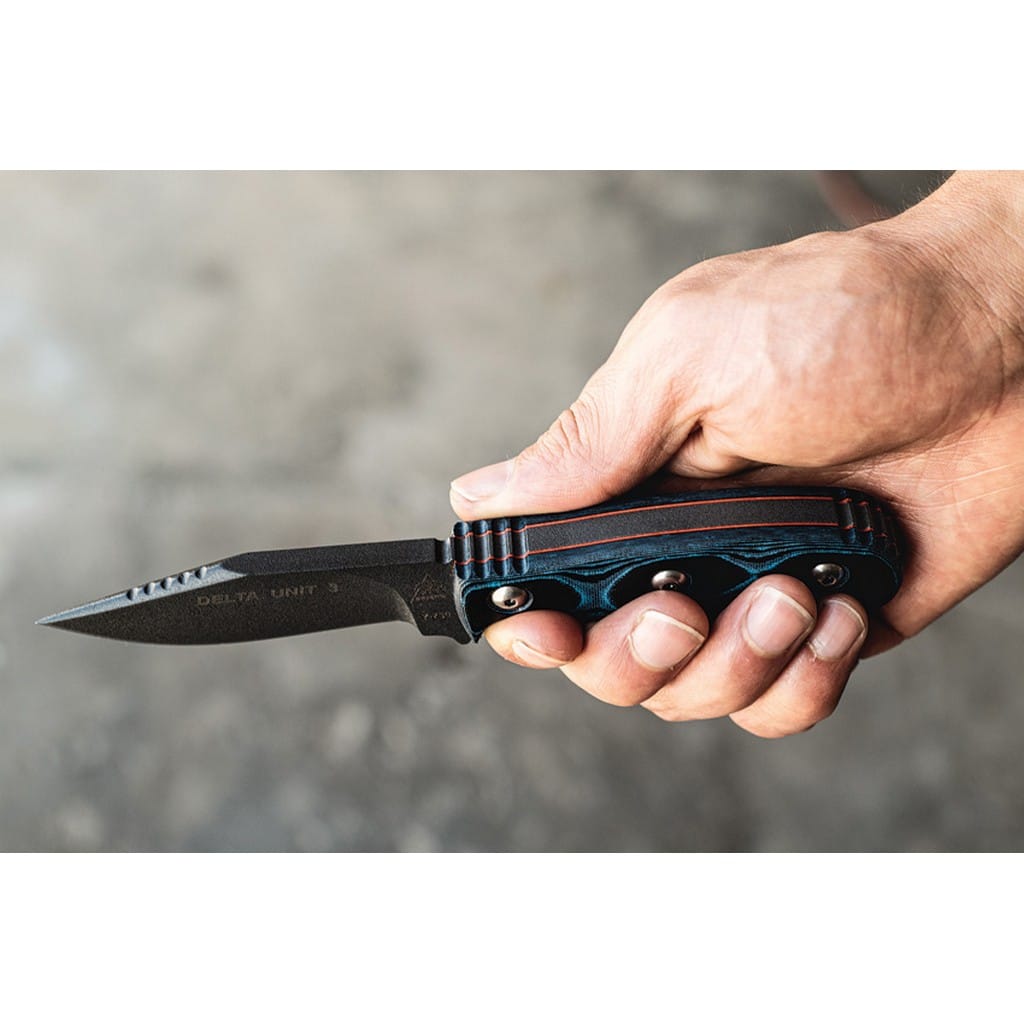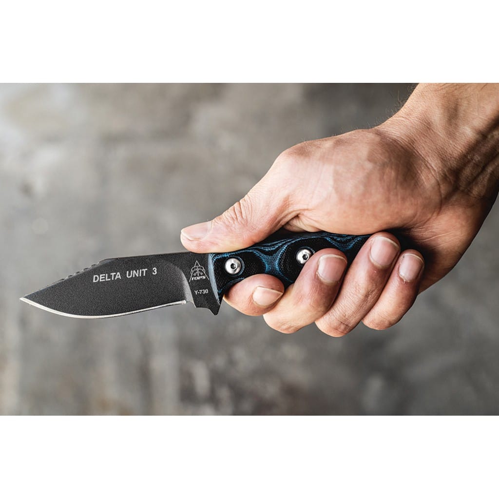 Delta Unit 3 to kompaktowy model zaprojektowany przez amerykańską firmę TOPS Knives do skutecznej i zwinnej pracy w terenie. Głownia o profilu Clip Point została wykonana ze stali węglowej 1095 odpornej na wykruszenia i pęknięcia oraz niesprawiającej trudności w ostrzeniu. W celu zabezpieczenia przed korozją i negatywnym działaniem czynników zewnętrznych pokryto ją szarą i antyodblaskową powłoką ochronną. Karbowany grzbiet klingi stanowi stabilne wsparcie dla kciuka i poprawia kontrolę nad narzędziem. Jelec czuwa przed przypadkowym zsunięciem się palców na krawędź tnącą i skaleczeniem. Model cechuje się konstrukcją full tang, co zwiększa jego wytrzymałość i możliwości podczas aktywności outdoorowych. Wyprofilowana rękojeść z odpornego na warunki atmosferyczne materiału G10 w czarno-niebieskim kolorze gwarantuje pewny chwyt w każdej sytuacji. Całość dopełnia pochwa z kydexu wraz z obrotowym klipsem. Pozwala na wygodne przenoszenie narzędzia blisko ciała lub przy wyposażeniu oraz pod dowolnym kątem. Do kompletu dołączono także gwizdek survivalowy o mocy 116 decybeli, który z powodzeniem możemy zamocować przy kluczach w formie breloka lub schować do kieszeni. Misją TOPS Knives jest produkowanie noży najwyższej jakości, charakteryzujących się wydajnością i niezawodnością podczas użytkowania. Firma współpracuje z projektantami posiadającymi odpowiednie doświadczenie militarne i survivalowe. Ich produkty tworzą osoby z różnych środowisk, żołnierze Navy Seals, Rangersi, instruktorzy sztuk walki, członkowie zespołu SWAT, a nawet indiańscy eksperci od broni. Wszystkie narzędzia są wytwarzane i ręcznie wykańczane w zakładzie w USA, w sercu gór skalistych.
