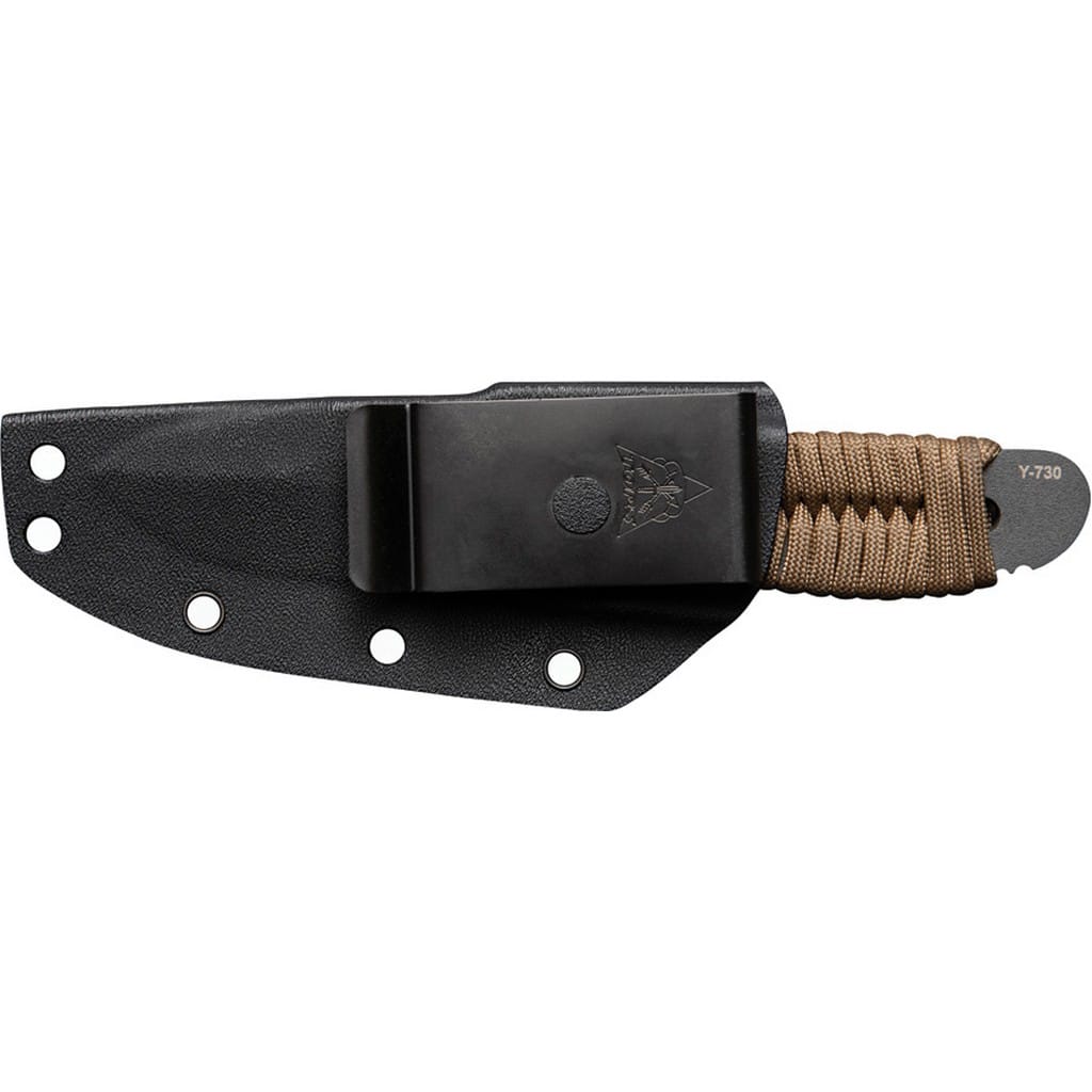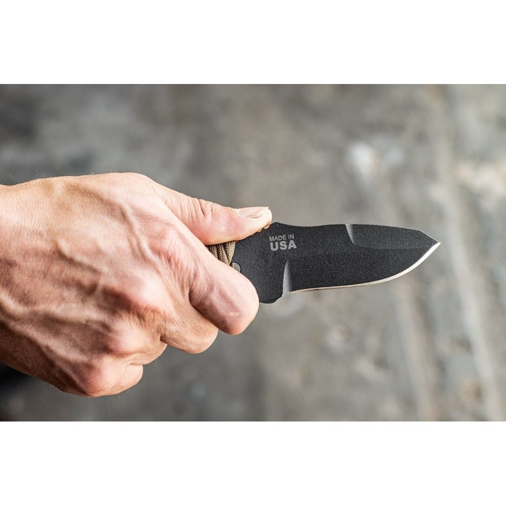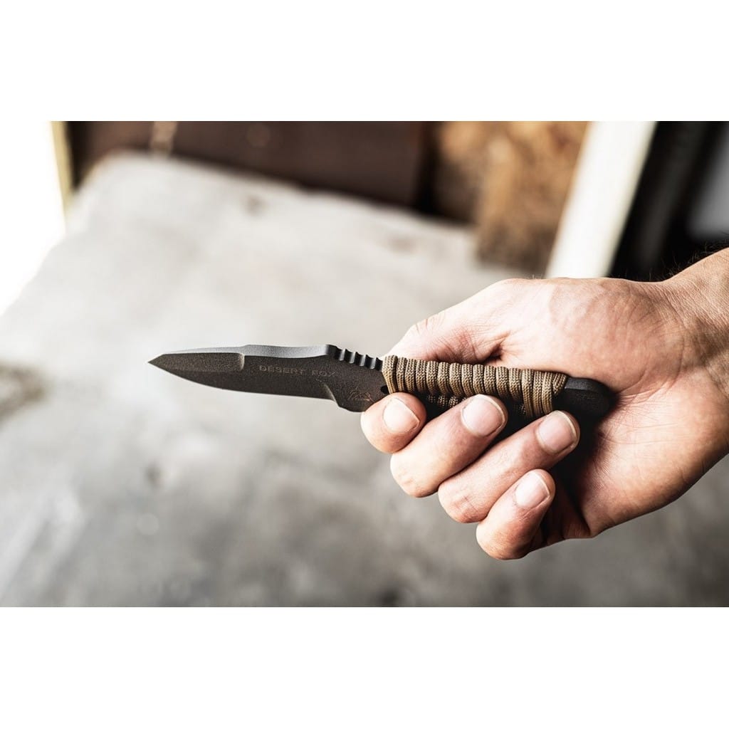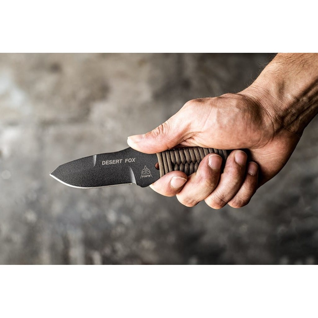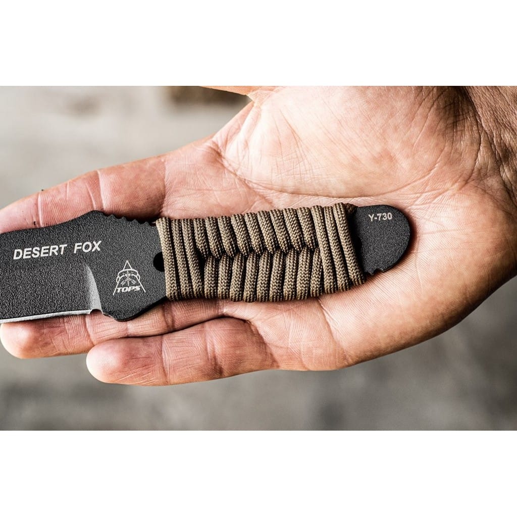 Desert Fox to kompaktowy nóż EDC zaprojektowany przez amerykańską firmę TOPS Knives. Model doskonale sprawdzi się do zadań na świeżym powietrzu takich jak skórowanie zwierzyny, obróbka drewna lub prace obozowe. Ostrze o profilu Clip Point zostało wykonane ze stali węglowej 1095 odpornej na wykruszenia i pęknięcia oraz niesprawiającej trudności w ostrzeniu. W celu zabezpieczenia przed korozją i negatywnym działaniem czynników zewnętrznych pokryto je szarą i antyodblaskową powłoką ochronną. Karbowany grzbiet klingi stanowi stabilne wsparcie dla kciuka poprawiając kontrolę nad narzędziem. Model cechuje się konstrukcją full tang, co zwiększa jego wytrzymałość i możliwości podczas aktywności outdoorowych. Szkieletową rękojeść dla poprawy komfortu chwytu owinięto paracordem, który w awaryjnej sytuacji może okazać się bardzo przydatny. Zestaw dopełnia pochwa z kydexu wraz z obrotowym klipsem pozwalającym na bezpieczne przenoszenie całości blisko ciała i pod dowolnym kątem. W komplecie znajduje się również gwizdek survivalowy o mocy 116 decybeli, który z powodzeniem możemy zamocować przy kluczach w formie breloka lub schować do kieszeni. Misją TOPS Knives jest produkowanie noży najwyższej jakości, charakteryzujących się wydajnością i niezawodnością w terenie. Firma współpracuje z projektantami posiadającymi odpowiednie doświadczenie militarne i survivalowe. Ich produkty tworzą osoby z różnych środowisk, komandosi Navy Seals, Rangersi, instruktorzy sztuk walki, członkowie zespołu SWAT, a nawet indiańscy eksperci od broni. Wszystkie narzędzia są wytwarzane i ręcznie wykańczane w fabryce w USA, w sercu gór skalistych.
