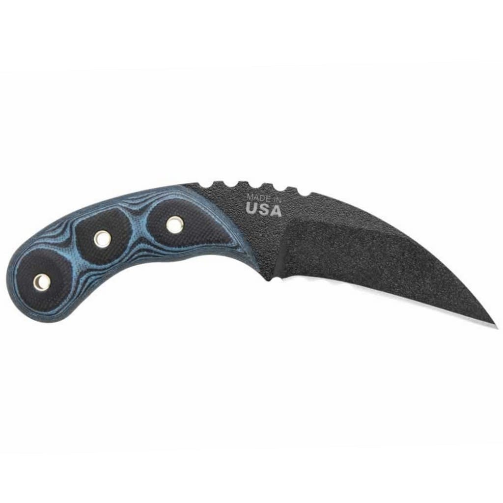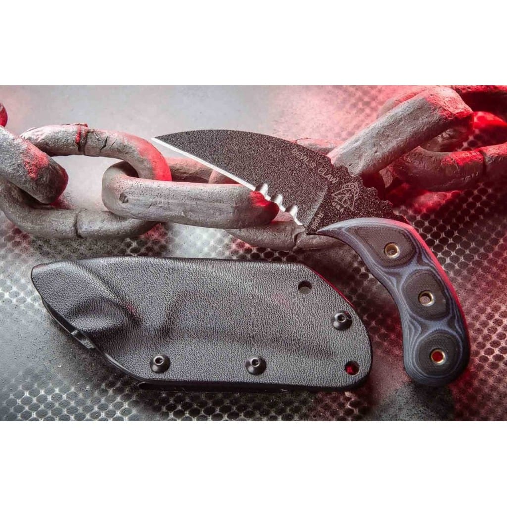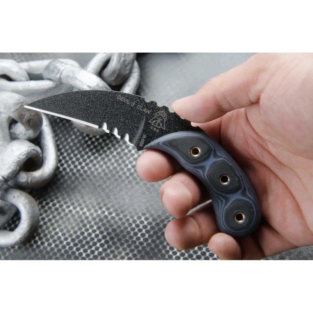 Devil's Claw zosał zaprojektowany przez Leo Espinozę, prezesa TOP Knives oraz światowej sławy knifemakera. Ten taktyczny model doskonale sprawdzi się w ręku profesjonalisty jako skuteczne narzędzie do zadań w terenie. Głownia, o zakrzywionym do dołu profilu Hawkbill, łączy zalety i uniwersalność gładkiej powierzchni z ząbkowaną. Umożliwia skuteczne cięcie zarówno miękkich przedmiotów, jak i twardych sznurów, taśm oraz innych włóknistych materiałów. Klingę wykonano ze stali węglowej 1095 odpornej na wykruszenia i pęknięcia, niesprawiającej trudności w ostrzeniu. W celu zabezpieczenia przed korozją i negatywnym działaniem czynników zewnętrznych pokryto ją antyodblaskową powłoką Black Traction. Jest to zastrzeżona nazwa wykończenia stosowana przez producenta, składającą się z hybrydowej bazy epoksydowej i poliestru. Nakłada się ją proszkowo i zapieka w piecu przez kilkanaście minut, w temperaturze około 210 stopni Celsjusza. Karbowany grzbiet ostrza stanowi stabilne wsparcie dla kciuka i poprawia kontrolę nad nożem. Model cechuje się konstrukcją full tang, co zwiększa jego wytrzymałość i możliwości podczas aktywności outdoorowych. Wyprofilowana rękojeść z odpornego na warunki atmosferyczne materiału G10 w czarno-niebieskim kolorze gwarantuje pewny chwyt w każdej sytuacji. Całość dopełnia pochwa z kydexu wraz z wielopozycyjnym klipsem z metalu, pozwalającym na wygodne przenoszenie narzędzia blisko ciała. Do kompletu dołączono także gwizdek survivalowy o mocy 116 decybeli, który z powodzeniem możemy zamocować przy kluczach w formie breloka lub schować do kieszeni. Misją TOPS Knives jest produkowanie noży najwyższej jakości, charakteryzujących się wydajnością i niezawodnością podczas użytkowania. Firma współpracuje z projektantami posiadającymi odpowiednie doświadczenie militarne i survivalowe. Ich produkty tworzą osoby z różnych środowisk, żołnierze Navy Seals, Rangersi, instruktorzy sztuk walki, członkowie zespołu SWAT, a nawet indiańscy eksperci od broni. Wszystkie narzędzia są wytwarzane i ręcznie wykańczane w zakładzie w USA, w sercu gór skalistych.