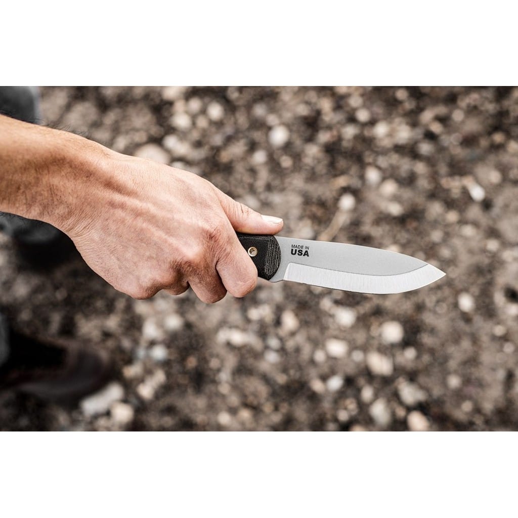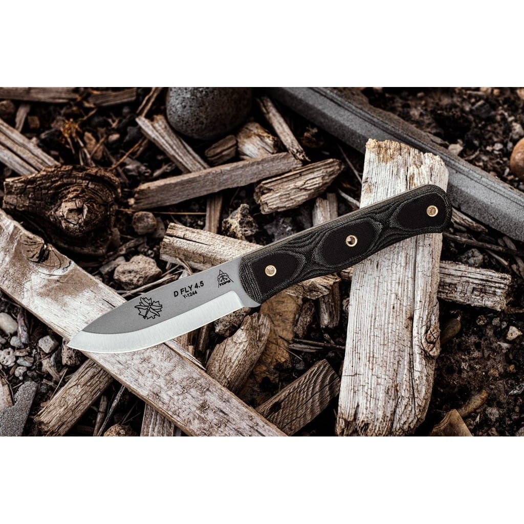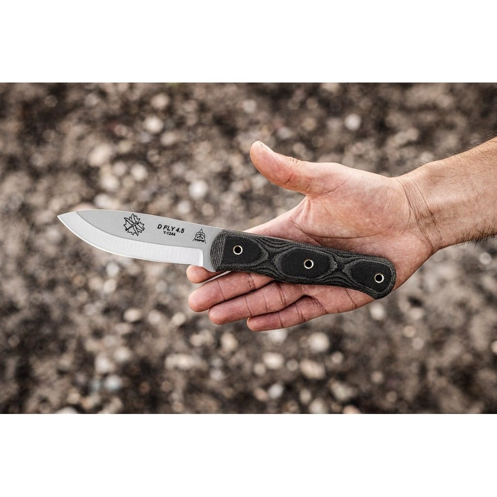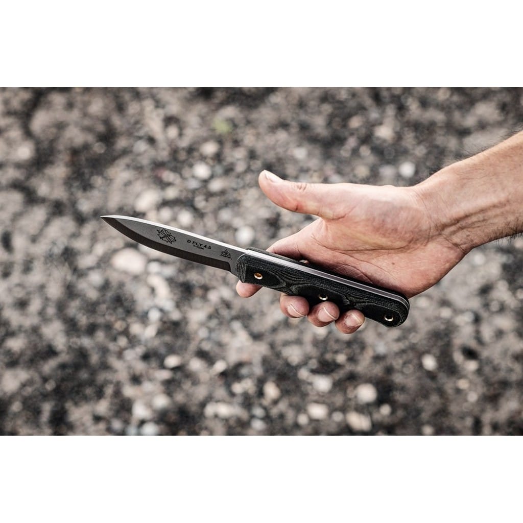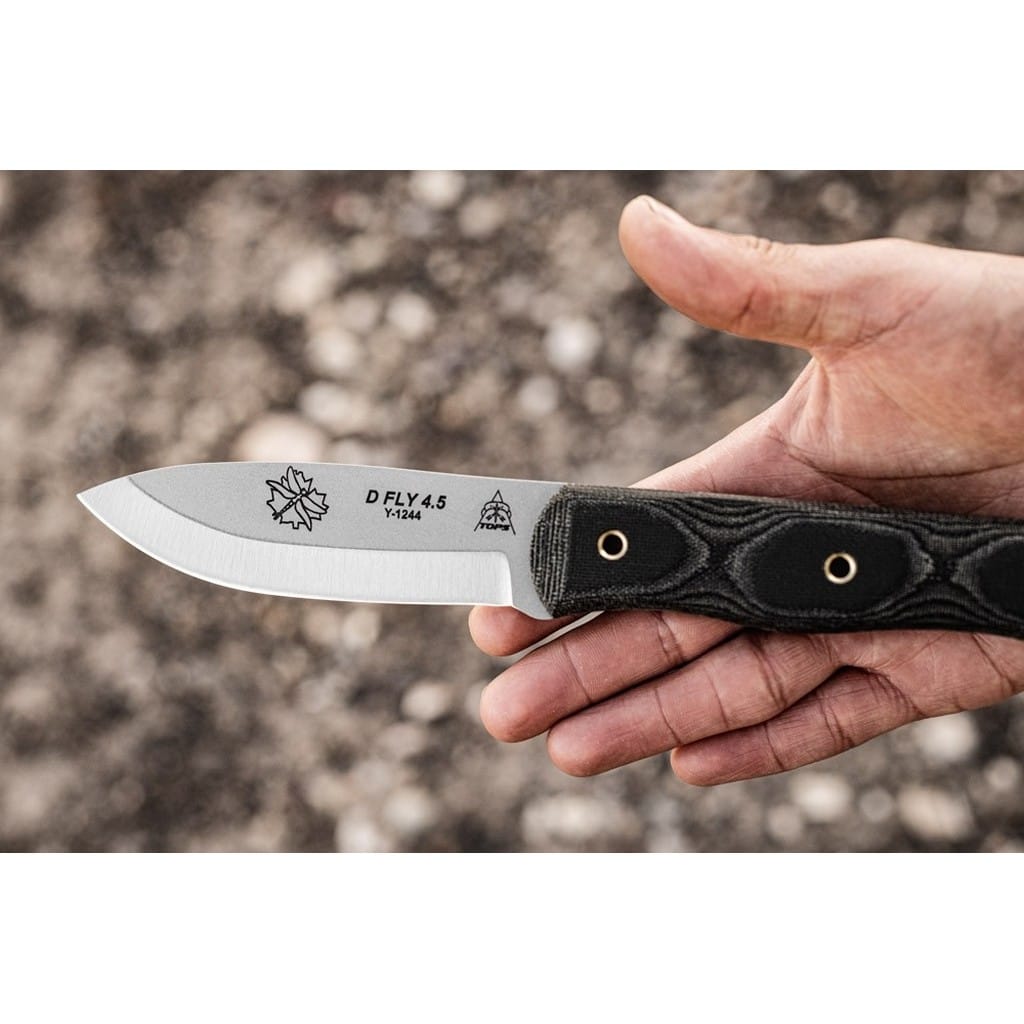 D Fly 4.5 amerykańskiej firmy TOPS Knives to nóż bushcraftowy zaprojektowany do wszelkiej aktywności na świeżym powietrzu. Klinga o zmodyfikowanym skandynawskim szlifie jest wyjątkowo skuteczna do skórowania zwierzyny oraz do pracy w drewnie. Model doskonale sprawdzi się zarówno na polowaniu, jaki i na wyprawie survivalowej do budowania schronienia. Ostrze o uniwersalnym profilu Drop Point zostało wykonane ze stali węglowej 1095 odpornej na wykruszenia i pęknięcia oraz niesprawiającej trudności w ostrzeniu. W celu zabezpieczenia przed korozją i negatywnym działaniem czynników zewnętrznych głownię pokryto szarą i antyodblaskową powłoką ochronną. Do stalowej konstrukcji full tang przymocowano okładziny z Micarty o fakturze płótna. Delikatnie wyprofilowana rękojeść dobrze układa się w dłoni gwarantując pewny chwyt. Całość dopełnia czarna pochwa ze skóry naturalnej, dzięki której możemy bezpiecznie i wygodnie przenosić narzędzie na pasku, blisko ciała. W komplecie znajduje się także krzesiwo do rozpalania ognia oraz gwizdek survivalowy o mocy 116 decybeli, który z powodzeniem możemy zamocować przy kluczach w formie breloka lub schować do kieszeni. Misją TOPS Knives jest produkowanie noży najwyższej jakości, charakteryzujących się wydajnością i niezawodnością podczas użytkowania. Firma współpracuje z projektantami posiadającymi odpowiednie doświadczenie militarne i survivalowe. Ich produkty tworzą osoby z różnych środowisk, żołnierze Navy Seals, Rangersi, instruktorzy sztuk walki, członkowie zespołu SWAT, a nawet indiańscy eksperci od broni. Wszystkie narzędzia są wytwarzane i ręcznie wykańczane w zakładzie w USA, w sercu gór skalistych.