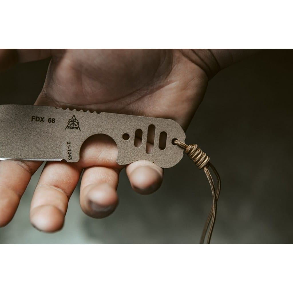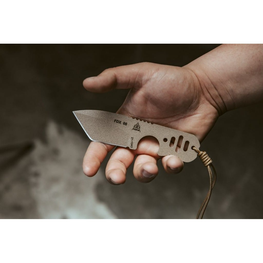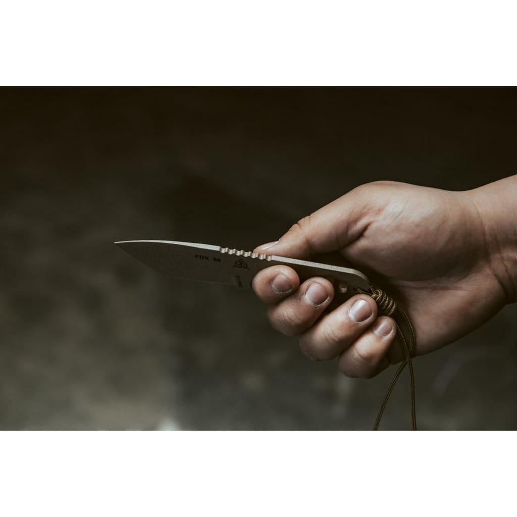 Field Duty Extreme, a w skrócie FDX, to kompaktowy nóż EDC zaprojektowany przez amerykańską firmę TOPS Knives. Model doskonale sprawdzi się do aktywności na świeżym powietrzu, a także w warunkach pustynnych jako dodatkowe wyposażenie żołnierza. Funkcjonalne, szerokie ostrze o profilu Tanto zostało wykonane ze stali węglowej 1095 odpornej na wykruszenia i pęknięcia oraz niesprawiającej trudności w ostrzeniu. W celu zabezpieczenia przed korozją i negatywnym działaniem czynników zewnętrznych pokryto głownię antyodblaskową powłoką ochronną w beżowym kolorze. Karbowany grzbiet klingi stanowi stabilne wsparcie dla kciuka, co poprawia kontrolę nad narzędziem. Konstrukcja full tang ze szkieletową rękojeścią, dzięki głębokiemu wyprofilowaniu pod palec świetnie układa się w dłoni. Użytkownik dla poprawy komfortu chwytu może owinąć ją paracordem, wedle indywidualnych potrzeb i preferencji. Na zakończeniu umieszczono otwór z przełożoną linką do wygodnego wyciągania noża. Model nie sprawia trudności w transportowaniu, gdyż w zestawie znajduje się pochwa z kydexu wraz z dwoma paskami mocującymi. Dzięki nim możemy przytroczyć narzędzie do paska lub wyposażenia i bezpiecznie przenosić blisko ciała. W komplecie znajduje się także gwizdek survivalowy o mocy 116 decybeli, który z powodzeniem możemy doczepić do kluczy w formie breloka lub schować do kieszeni. Misją TOPS Knives jest produkowanie noży najwyższej jakości, charakteryzujących się wydajnością i niezawodnością w terenie. Firma współpracuje z projektantami posiadającymi odpowiednie doświadczenie militarne i survivalowe. Ich produkty tworzą osoby z różnych środowisk, komandosi Navy Seals, Rangersi, instruktorzy sztuk walki, członkowie zespołu SWAT, a nawet indiańscy eksperci od broni. Wszystkie narzędzia są wytwarzane i ręcznie wykańczane w fabryce w USA, w sercu gór skalistych.