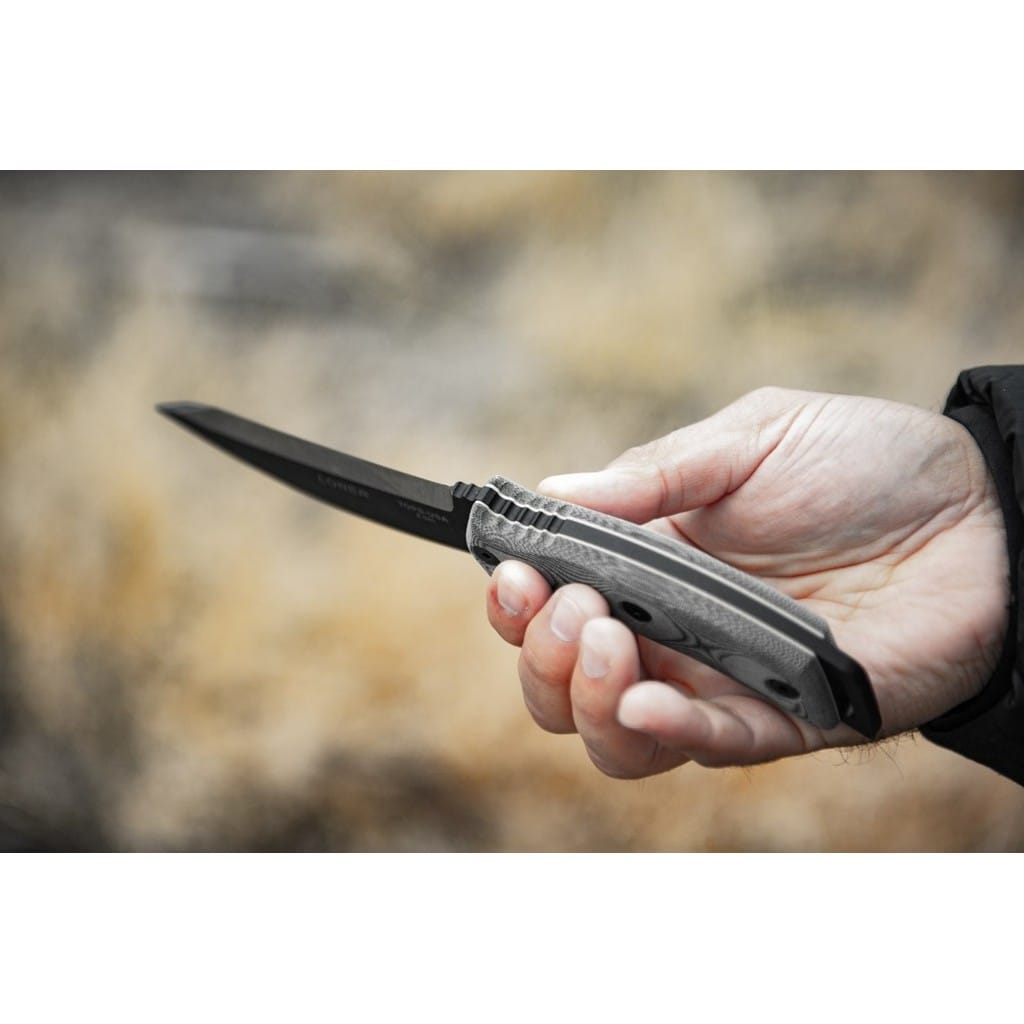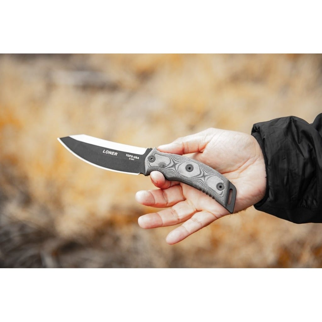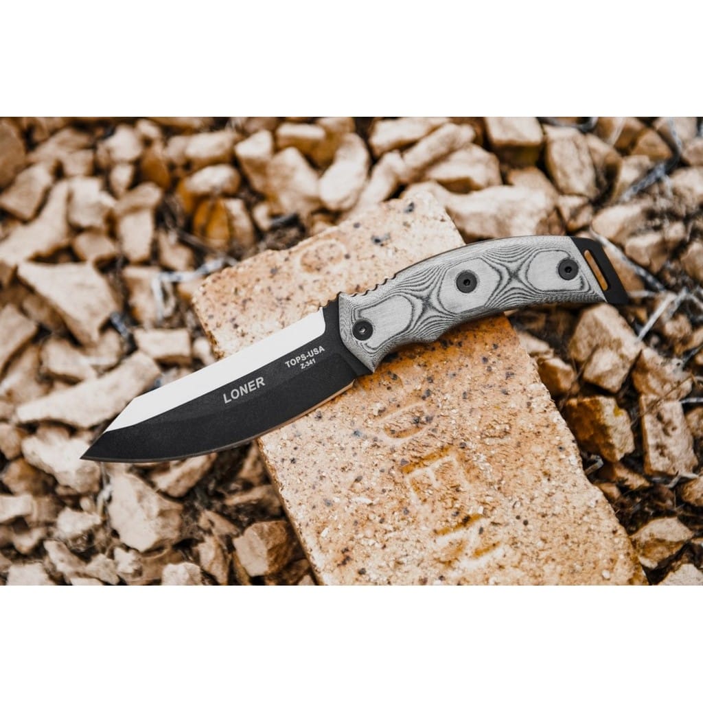 Jerry VanCook, utalentowany instruktor samoobrony, przy współpracy z amerykańską firmą TOPS Knives stworzył taktyczny model Loner. Nóż odznaczają ostrzem, gdzie górna krawędź tnąca jest również naostrzona, co czyni z niego wyjątkowe narzędzie do skutecznego cięcia. Głownia została wykonana ze stali węglowej 1095 odpornej na wykruszenia i pęknięcia oraz niesprawiającej trudności w ostrzeniu. W celu zabezpieczenia przed korozją i negatywnym działaniem czynników zewnętrznych pokryto ją antyodblaskową powłoką Black Traction. Jest to zastrzeżona nazwa wykończenia stosowana przez producenta, składającą się z hybrydowej bazy epoksydowej i poliestru. Nakłada się ją proszkowo na klingę i zapieka w piecu przez kilkanaście minut, w temperaturze około 210 stopni Celsjusza. Model cechuje się konstrukcją full tang zwiększającą wytrzymałość i możliwości eksploatacji noża w terenie. Wyprofilowane okładziny chwytu z Micarty o fakturze płótna pewnie układają się w dłoni gwarantując komfort użytkowania. Na zakończeniu umieszczono duży otwór pozwalający na przełożenie paracordu i stworzenie oplotu na nadgarstek. Całość dopełnia pochwa z kydexu wraz z obrotowym klipsem. Pozwala na wygodne przenoszenie narzędzia blisko ciała lub przy wyposażeniu oraz pod dowolnym kątem. Dodatkowo do kompletu dołączono gwizdek survivalowy o mocy 116 decybeli, który z powodzeniem możemy zamocować przy kluczach w formie breloka lub schować do kieszeni. Misją TOPS Knives jest produkowanie noży najwyższej jakości, charakteryzujących się wydajnością i niezawodnością podczas pracy. Firma współpracuje z projektantami posiadającymi odpowiednie doświadczenie militarne i survivalowe. Ich produkty tworzą osoby z różnych środowisk, żołnierze Navy Seals, Rangersi, instruktorzy sztuk walki, członkowie zespołu SWAT, a nawet indiańscy eksperci od broni. Wszystkie narzędzia są wytwarzane i ręcznie wykańczane w zakładzie w USA, w sercu gór skalistych.