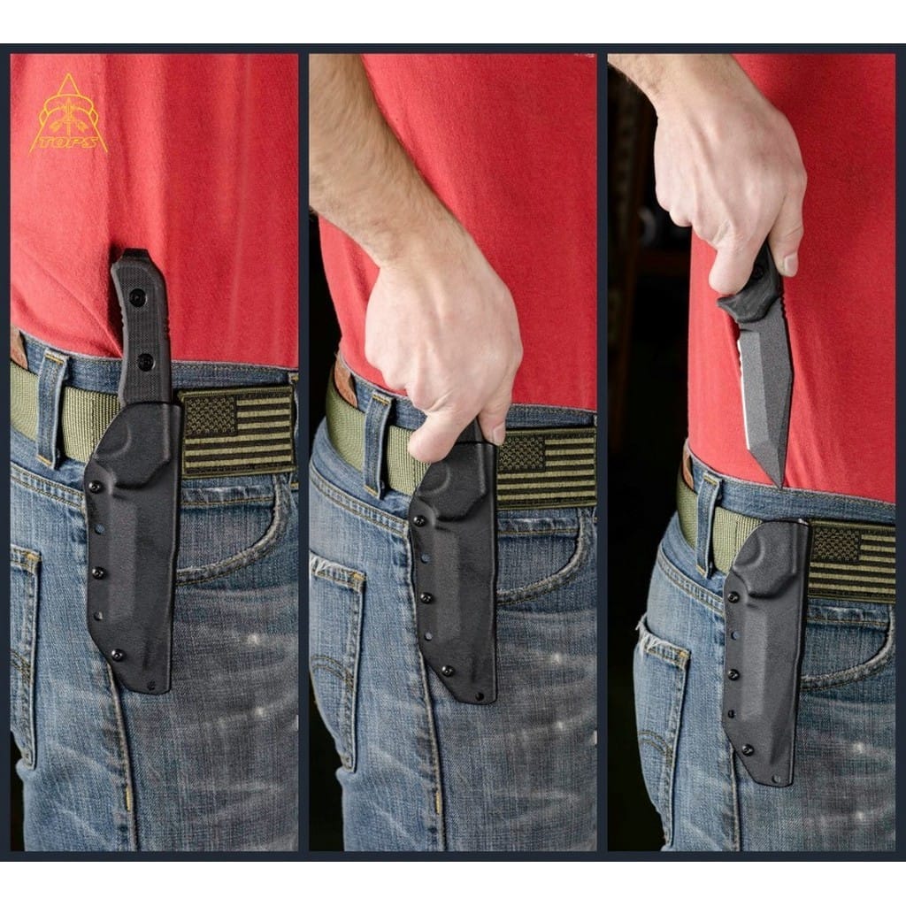Sky Marshall amerykańskiej firmy TOPS Knives to masywny nóż z ostrzem stałym zaprojektowany dla pracowników służb mundurowych. Ostrze o taktycznym profilu Tanto zostało wykonane ze stali węglowej 1095 odpornej na wykruszenia i pęknięcia oraz niesprawiającej trudności w ostrzeniu. W celu zabezpieczenia przed korozją i negatywnym działaniem czynników zewnętrznych głownię pokryto antyodblaskową powłoką Black Traction. Jest to zastrzeżona nazwa wykończenia stosowana przez producenta, składającą się z hybrydowej bazy epoksydowej z dodatkiem poliestru. Nakłada się ją proszkowo na klingę i zapieka w piecu przez kilkanaście minut, w temperaturze około 210 stopni Celsjusza. Ostrze łączy zalety i uniwersalność gładkiej krawędzi tnącej z ząbkowaną. Umożliwia skuteczne cięcie zarówno miękkich przedmiotów, jak i twardych lin, sznurów, taśm oraz innych włóknistych materiałów. Karbowany grzbiet głowni stanowi stabilne wsparcie dla kciuka, pomagając przy zadaniach wymagających większej precyzji. Model cechuje się konstrukcją full tang, co zwiększa jego wytrzymałość i możliwości podczas aktywności outdoorowych. Ergonomicznie wyprofilowana rękojeść z odpornego na warunki atmosferyczne materiału G10 komfortowo układa się w dłoni użytkownika gwarantując pewny chwyt. Na zakończeniu znajduje się stalowa wypustka do kruszenia przedmiotów lub awaryjnego wybijania szyb. Całość dopełnia pochwa z kydexu wraz z obrotowym klipsem. Pozwala na wygodne przenoszenie narzędzia blisko ciała oraz pod dowolnym kątem. Do kompletu dołączono także gwizdek survivalowy o mocy 116 decybeli, który z powodzeniem możemy zamocować przy kluczach w formie breloka lub schować do kieszeni. Misją TOPS Knives jest produkowanie noży najwyższej jakości, charakteryzujących się wydajnością i niezawodnością. Firma współpracuje z projektantami posiadającymi odpowiednie doświadczenie militarne i outdoorowe. Ich produkty tworzą osoby z różnych środowisk, komandosi Navy Seals, Rangersi, instruktorzy sztuk walki, członkowie zespołu SWAT, a nawet indiańscy eksperci od broni. Wszystkie narzędzia są wytwarzane i ręcznie wykańczane w zakładzie w USA, w sercu gór skalistych.