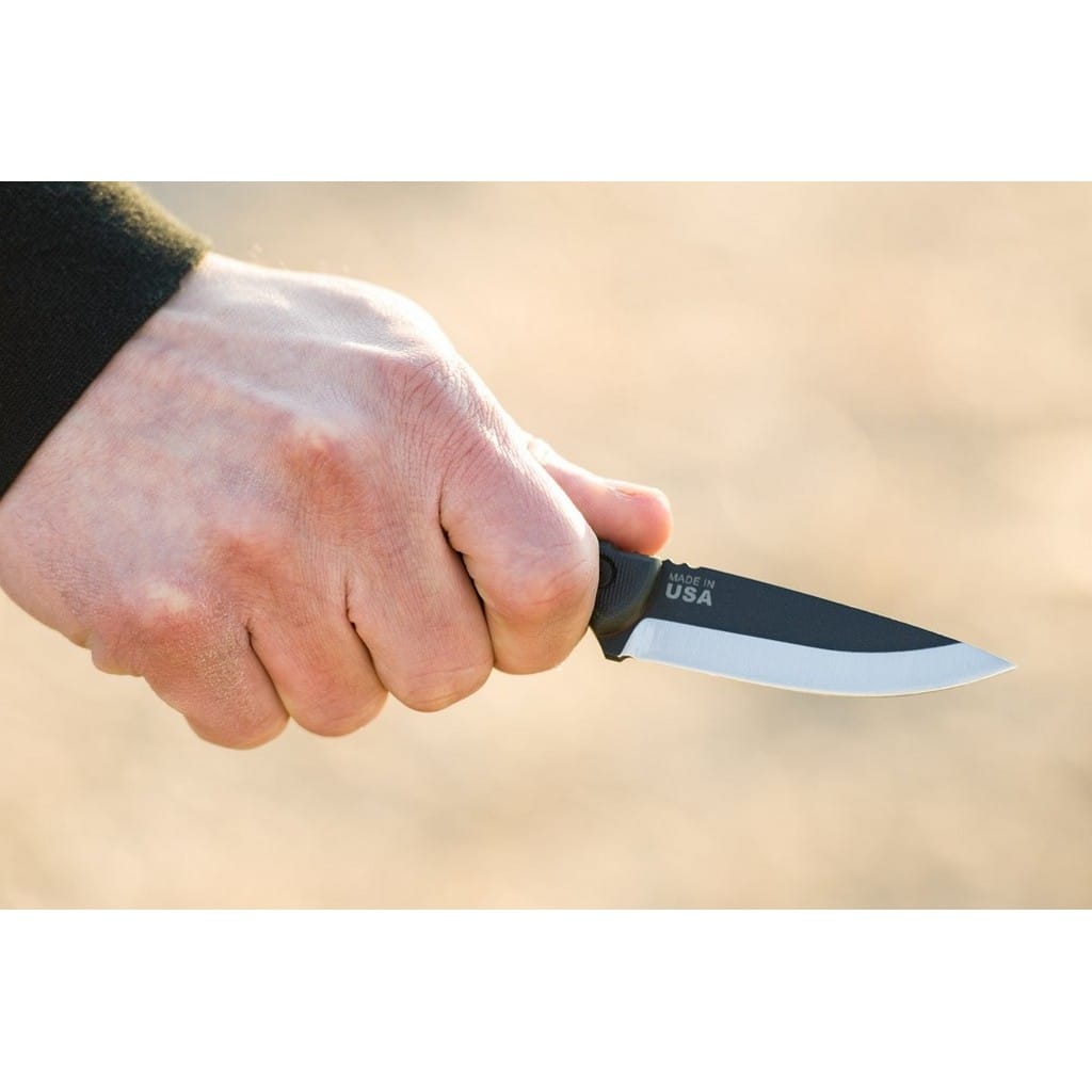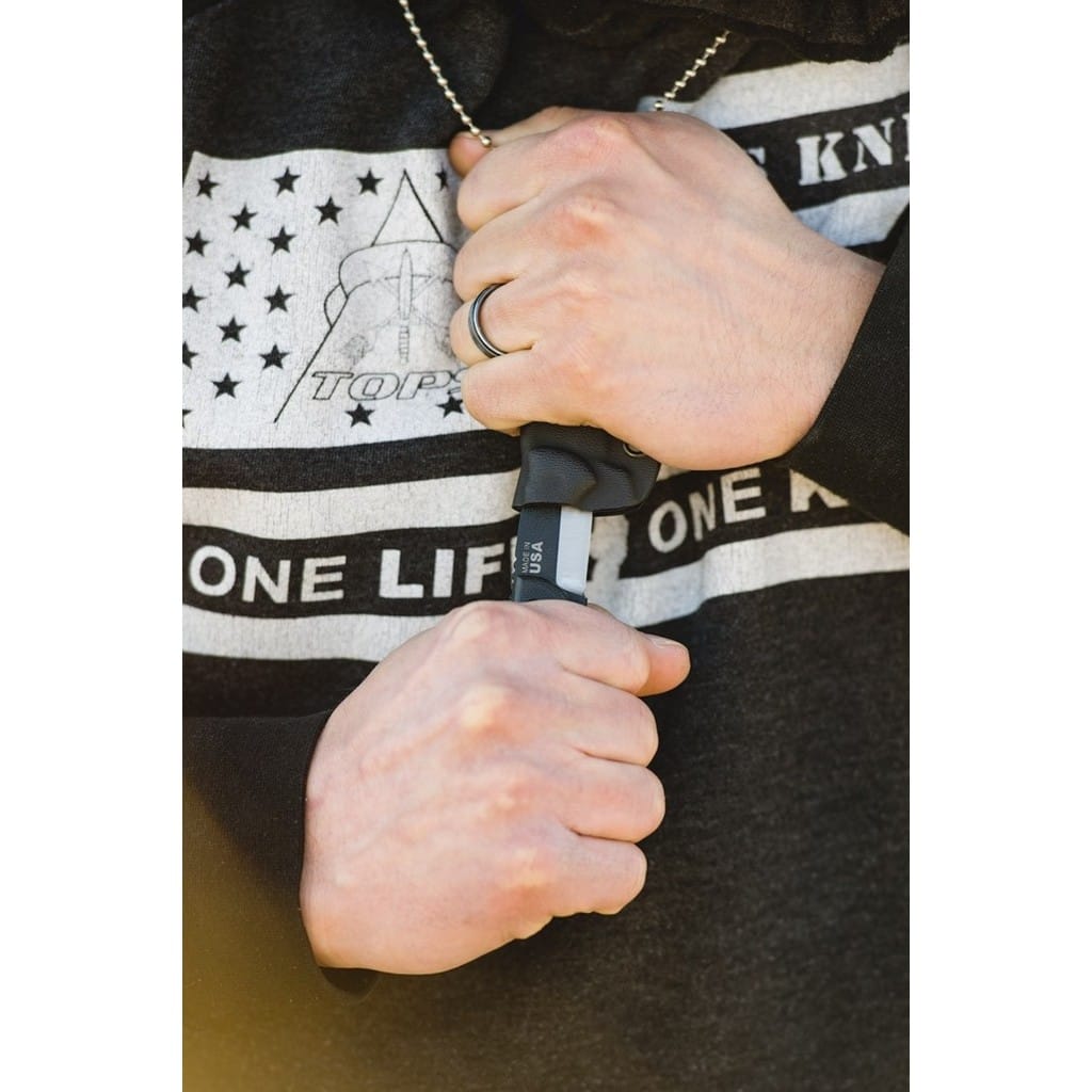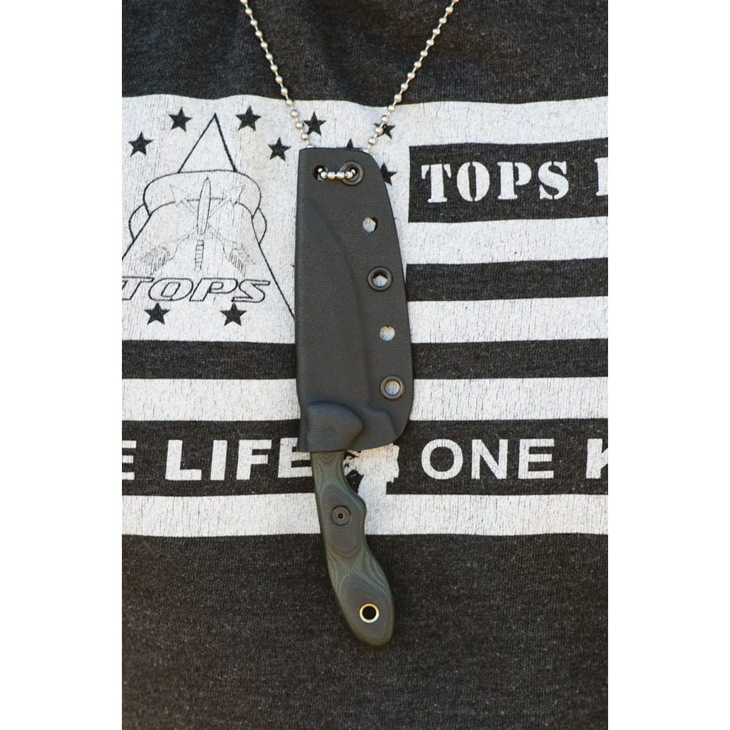 Mini Scandi z ostrzem stałym to kompaktowy model survivalowy do codziennego noszenia. Został stworzony przez Leo Espinozę, prezesa TOP Knives oraz światowej sławy producenta i projektanta noży doskonale łączącego funkcjonalność z minimalizmem. Ostrze o uniwersalnym profilu Drop Point wykonano ze stali węglowej 1095 odpornej na wykruszenia i pęknięcia oraz niesprawiającej trudności w ostrzeniu. Pokryto ją powłoką Black Traction, jest to zastrzeżona nazwa wykończenia stosowana przez TOPS, składająca się z hybrydowej bazy epoksydowej, z dodatkiem poliestru. Nakłada się ją proszkowo na klingę i zapieka w piecu, w temperaturze około 210 stopni Celsjusza, przez kilkanaście minut. Głownia o zmodyfikowanym skandynawskim szlifie jest wyjątkowo skuteczna przy pracach w drewnie, do skórowania zwierzyny oraz do innych zadań bushcraftowych. Odpowiednia twardość i geometria krawędzi tnącej świetnie współgrają ze sobą, tworząc wydajne do cięcia ostrze. Karbowany grzbiet klingi stanowi stabilne podparcie dla kciuka, co jest przydatne do czynności wymagających większej precyzji. Do stalowej konstrukcji full tang przymocowano okładziny chwytu z wytrzymałego tworzywa G10. Ergonomicznie wyprofilowana rękojeść, pomimo jej niewielkich rozmiarów, bardzo dobrze układa się w dłoni gwarantując dobrą przyczepność i komfort w każdych warunkach. Otwór na zakończeniu umożliwia przełożenie paracordu i stworzenie oplotu na nadgarstek. Model posiada w zestawie pochwę z kydexu oraz łańcuszek kulkowy pozwalające na wygodne przenoszenie całości na szyi. Dodatkowo do kompletu dołączono gwizdek survivalowy o mocy 116 decybeli, który z powodzeniem możemy zamocować przy kluczach w formie breloka lub schować do kieszeni. Mini Scandi to idealny towarzysz codziennej przygody zarówno w domu jak i w terenie. Misją TOPS Knives jest produkowanie noży najwyższej jakości, charakteryzujących się wydajnością i niezawodnością w terenie. Firma współpracuje z projektantami posiadającymi odpowiednie doświadczenie militarne i survivalowe. Ich produkty tworzą osoby z różnych środowisk, żołnierze Navy Seals, Rangersi, instruktorzy sztuk walki, członkowie zespołu SWAT, a nawet indiańscy eksperci od broni. Wszystkie narzędzia są wytwarzane i ręcznie wykańczane w zakładzie w USA, w sercu gór skalistych.