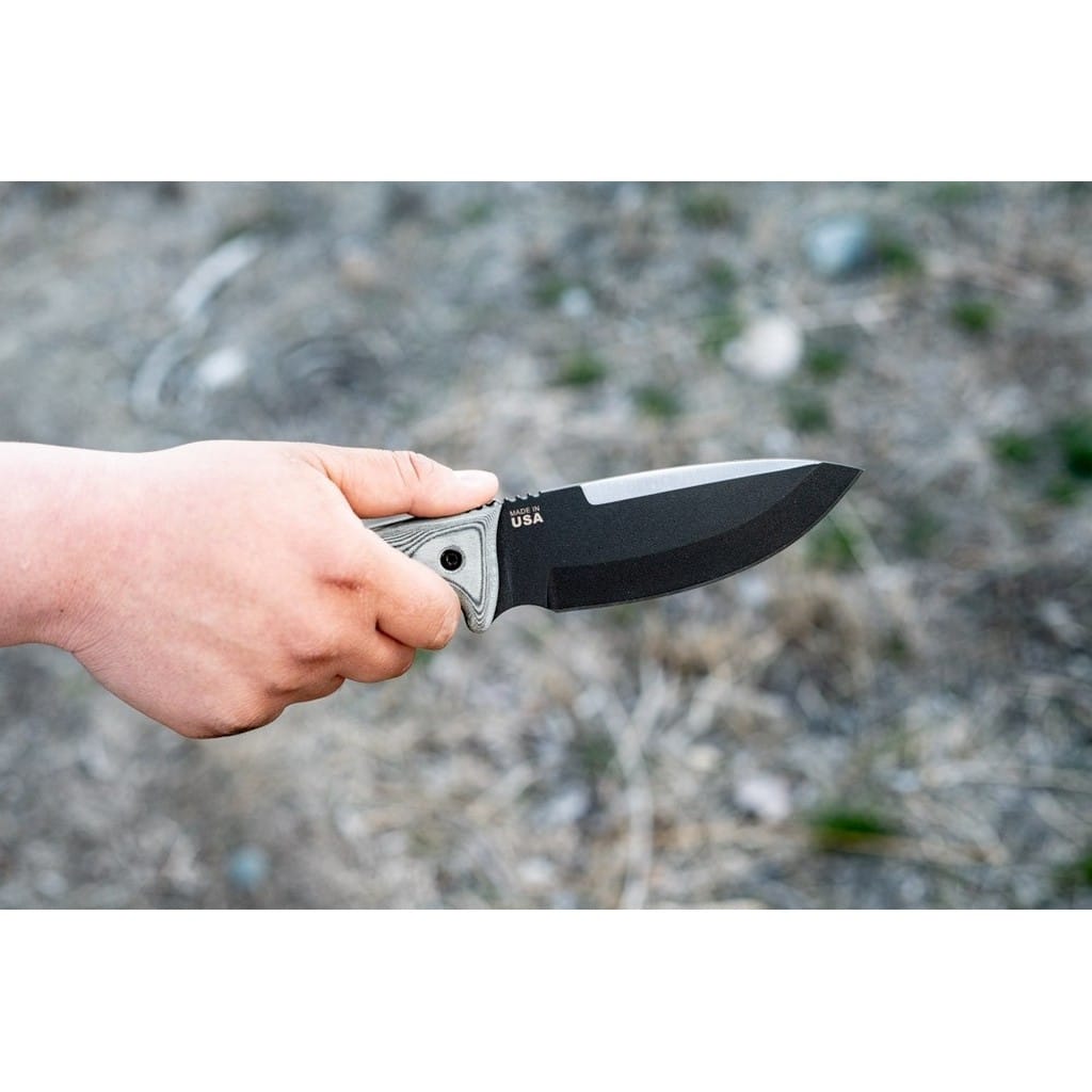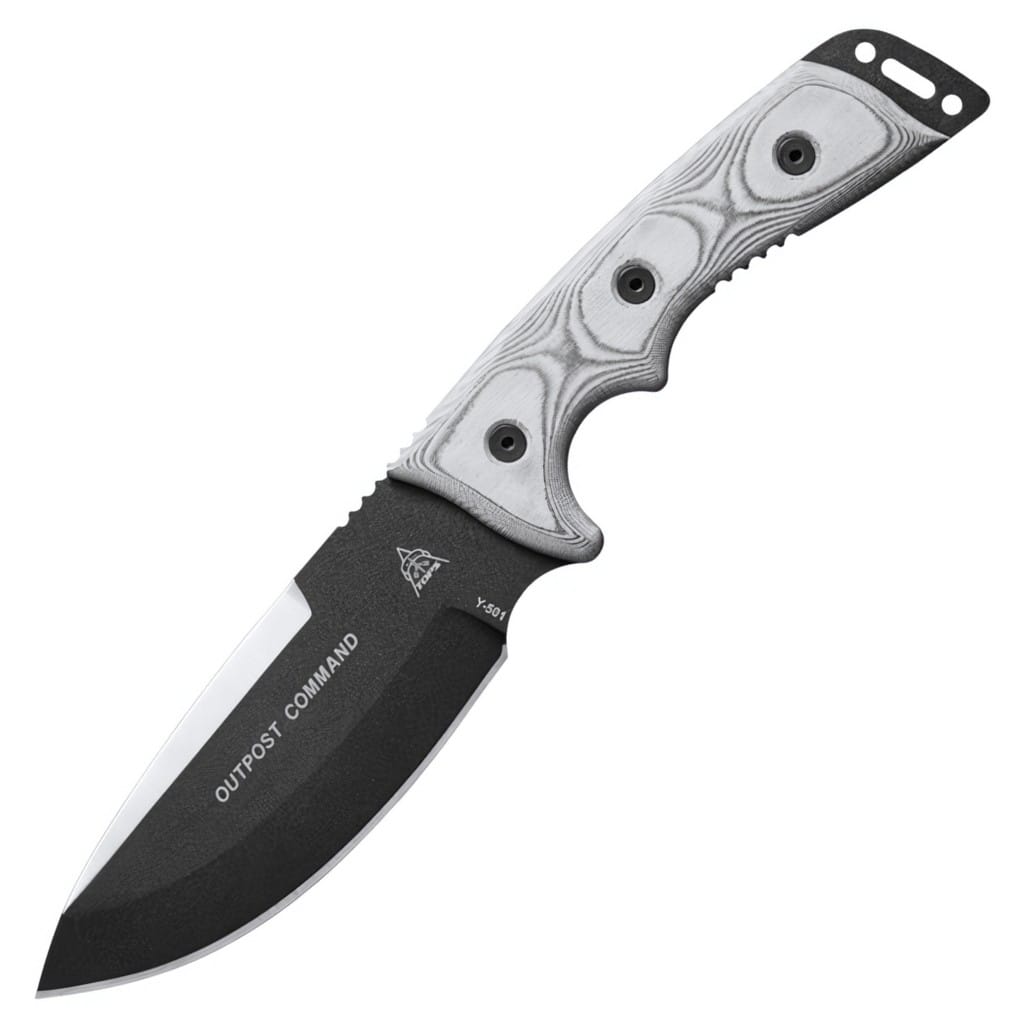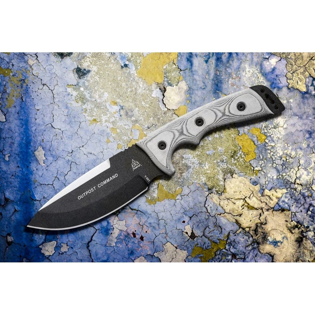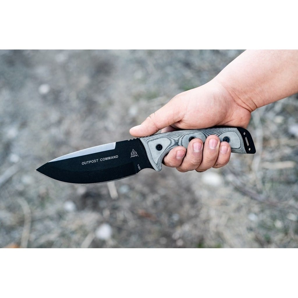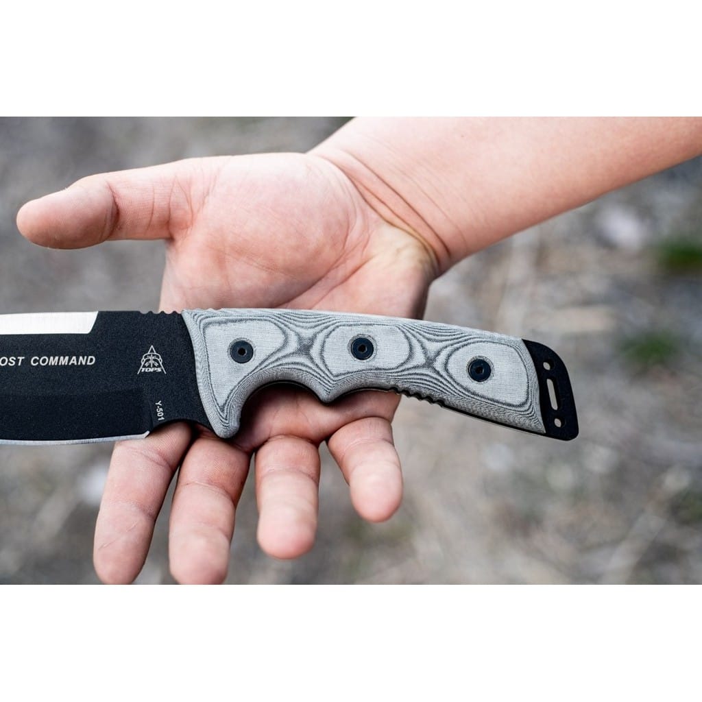Outpost Command to masywny nóż survivalowy zaprojektowany przez amerykańską firmę TOPS Knives. Model idealnie sprawdzi się do ciężkich prac outdoorowych, doskonale poradzi sobie z niejednym wymagającym zadaniem. Szerokie ostrze o profilu Drop Point zostało wykonane ze stali węglowej 1095 odpornej na wykruszenia i pęknięcia oraz niesprawiającej trudności w ostrzeniu. W celu zabezpieczenia przed korozją i negatywnym działaniem czynników zewnętrznych głownię pokryto antyodblaskową powłoką Black Traction. Jest to zastrzeżona nazwa wykończenia stosowana przez producenta, składającą się z hybrydowej bazy epoksydowej i poliestru. Nakłada się ją proszkowo na klingę i zapieka w piecu przez kilkanaście minut, w temperaturze około 210 stopni Celsjusza. Karbowany grzbiet ostrza stanowi stabilne wsparcie dla kciuka i poprawia kontrolę nad narzędziem. Model cechuje się konstrukcją full tang zwiększającą wytrzymałość i możliwości jego eksploatacji w terenie. Ergonomicznie wyprofilowane okładziny chwytu z Micarty o fakturze płótna pewnie układają się w dłoni gwarantując komfort użytkowania. Na zakończeniu umieszczono otwory pozwalające na przełożenie paracordu i stworzenie oplotu na nadgarstek. Zestaw dopełnia czarna pochwa z nylonu balistycznego, kompatybilna z systemem Molle, umożliwiajaca wygodne przenoszenie całości na pasku spodni blisko ciała. Pokrowiec zawiera również zapasową linkę i kieszonkę na drobne akcesoria EDC, takie jak ostrzałka, czy krzesiwo. W komplecie znajduje się także gwizdek o mocy 116 decybeli, który z powodzeniem możemy zamocować w formie breloka przy kluczach lub innym wyposażeniu. Misją TOPS Knives jest produkowanie noży najwyższej jakości, charakteryzujących się wydajnością i funkcjonalnością w każdej sytuacji. Firma współpracuje z projektantami posiadającymi odpowiednie doświadczenie militarne i bushcraftowe. Ich produkty tworzą osoby z różnych środowisk, żołnierze Navy Seals, Rangersi, instruktorzy sztuk walki, członkowie zespołu SWAT, a nawet indiańscy eksperci od broni. Wszystkie narzędzia są wytwarzane i ręcznie wykańczane w fabryce w USA, w sercu gór skalistych.