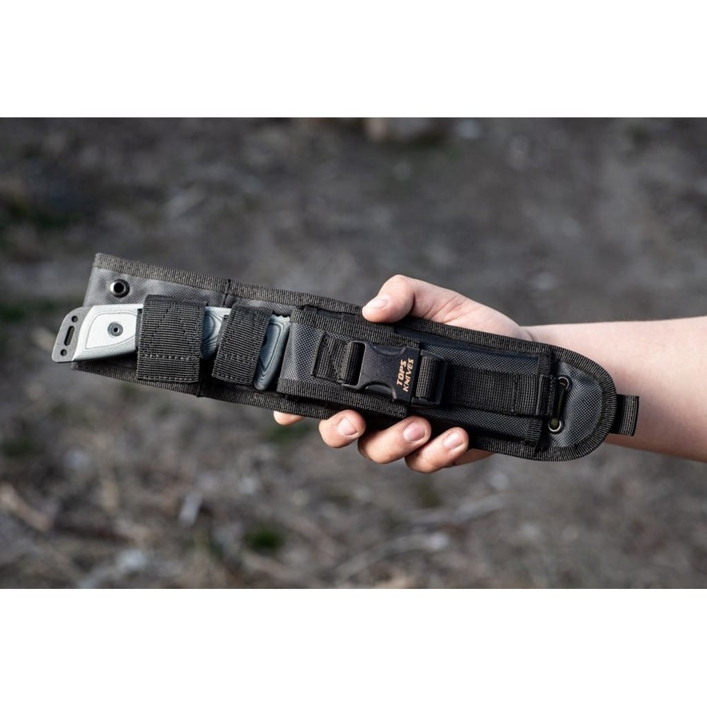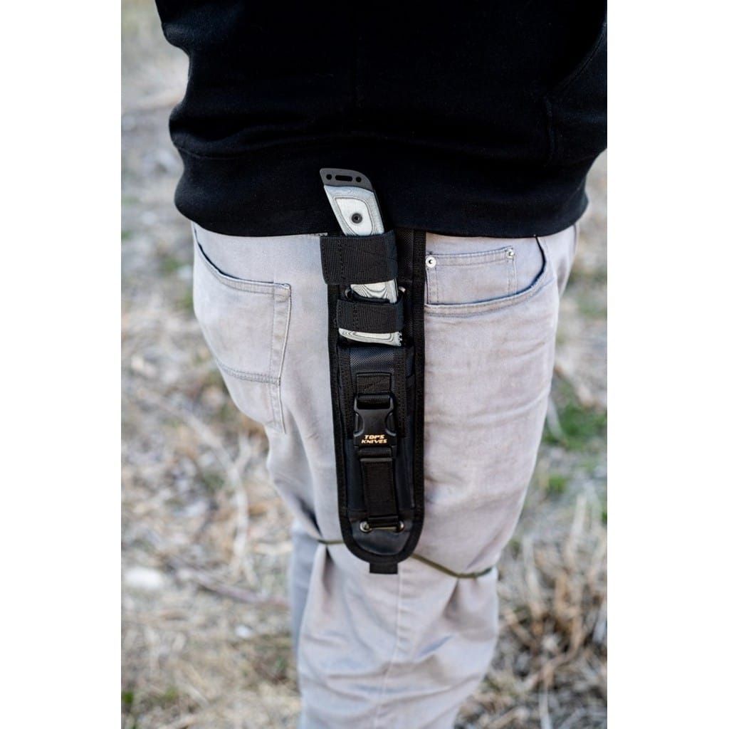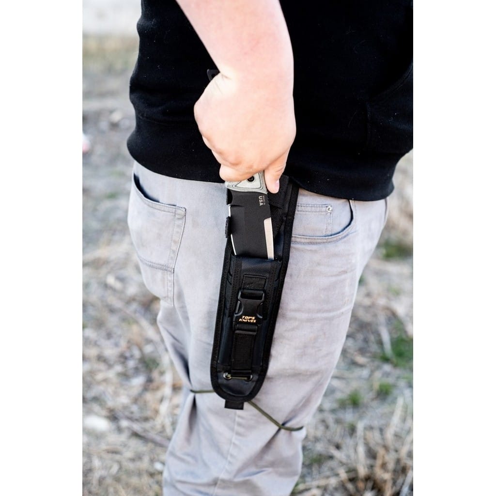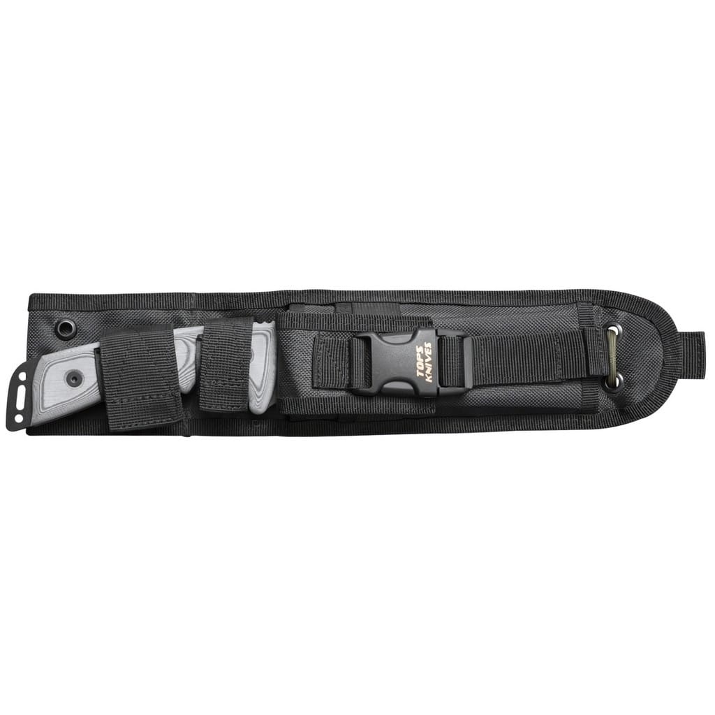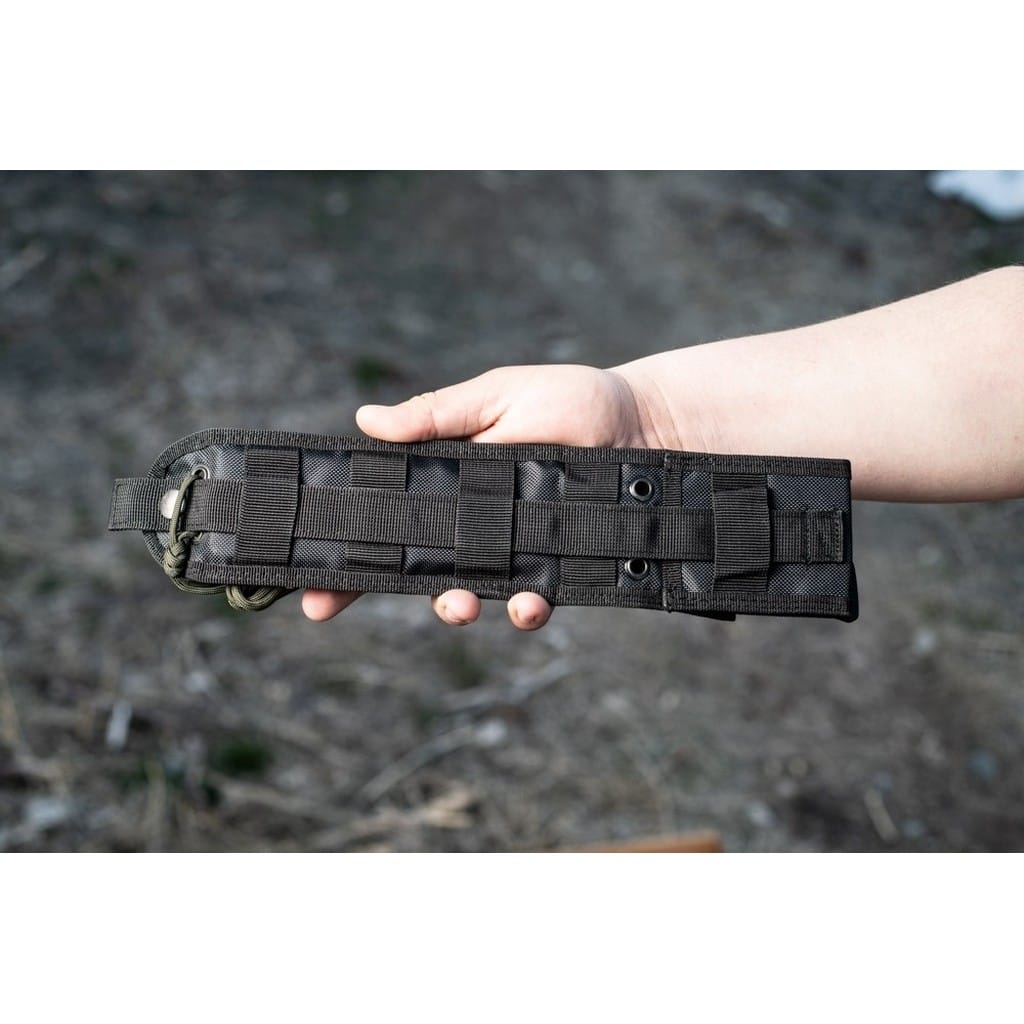 Outpost Command to masywny nóż survivalowy zaprojektowany przez amerykańską firmę TOPS Knives. Model idealnie sprawdzi się do ciężkich prac outdoorowych, doskonale poradzi sobie z niejednym wymagającym zadaniem. Szerokie ostrze o profilu Drop Point zostało wykonane ze stali węglowej 1095 odpornej na wykruszenia i pęknięcia oraz niesprawiającej trudności w ostrzeniu. W celu zabezpieczenia przed korozją i negatywnym działaniem czynników zewnętrznych głownię pokryto antyodblaskową powłoką Black Traction. Jest to zastrzeżona nazwa wykończenia stosowana przez producenta, składającą się z hybrydowej bazy epoksydowej i poliestru. Nakłada się ją proszkowo na klingę i zapieka w piecu przez kilkanaście minut, w temperaturze około 210 stopni Celsjusza. Karbowany grzbiet ostrza stanowi stabilne wsparcie dla kciuka i poprawia kontrolę nad narzędziem. Model cechuje się konstrukcją full tang zwiększającą wytrzymałość i możliwości jego eksploatacji w terenie. Ergonomicznie wyprofilowane okładziny chwytu z Micarty o fakturze płótna pewnie układają się w dłoni gwarantując komfort użytkowania. Na zakończeniu umieszczono otwory pozwalające na przełożenie paracordu i stworzenie oplotu na nadgarstek. Zestaw dopełnia czarna pochwa z nylonu balistycznego, kompatybilna z systemem Molle, umożliwiajaca wygodne przenoszenie całości na pasku spodni blisko ciała. Pokrowiec zawiera również zapasową linkę i kieszonkę na drobne akcesoria EDC, takie jak ostrzałka, czy krzesiwo. W komplecie znajduje się także gwizdek o mocy 116 decybeli, który z powodzeniem możemy zamocować w formie breloka przy kluczach lub innym wyposażeniu. Misją TOPS Knives jest produkowanie noży najwyższej jakości, charakteryzujących się wydajnością i funkcjonalnością w każdej sytuacji. Firma współpracuje z projektantami posiadającymi odpowiednie doświadczenie militarne i bushcraftowe. Ich produkty tworzą osoby z różnych środowisk, żołnierze Navy Seals, Rangersi, instruktorzy sztuk walki, członkowie zespołu SWAT, a nawet indiańscy eksperci od broni. Wszystkie narzędzia są wytwarzane i ręcznie wykańczane w fabryce w USA, w sercu gór skalistych.