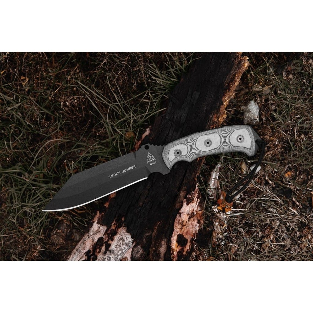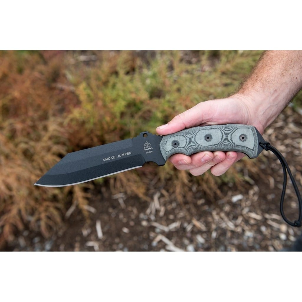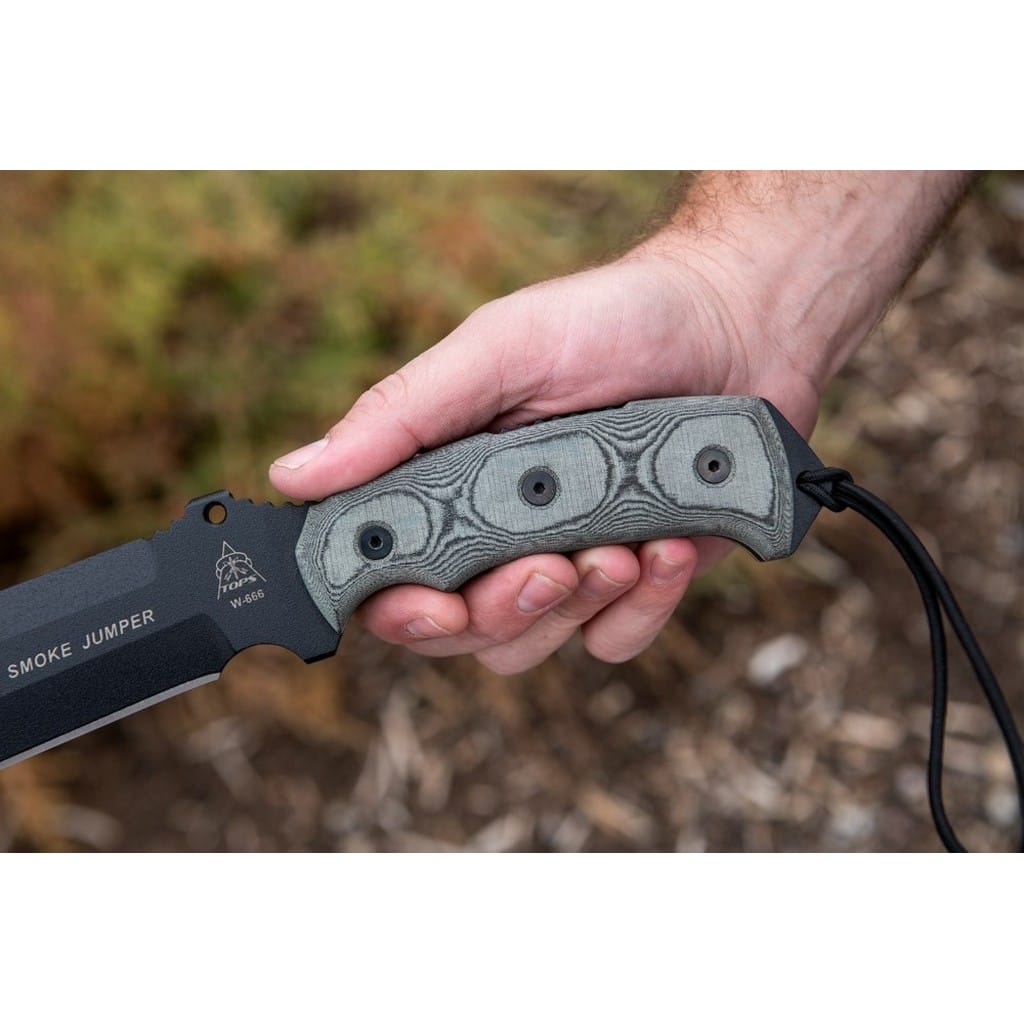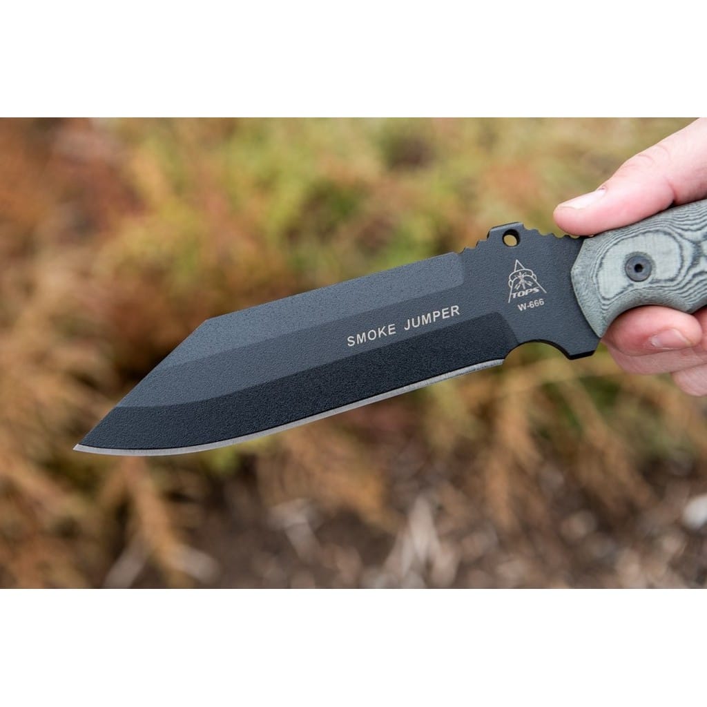 Smoke Jumper z czystej definicji oznacza specjalnie przeszkolonego strażaka, który walczy z pożarem w dzikich i odległych terenach. Skacze ze spadochronem, aby zapewnić doraźną pomoc w gaszeniu ognia. Jest to praca bardzo trudna, wyczerpująca i niebezpieczna, a kurs szkoleniowy z pozytywnym wynikiem kończy niewiele osób. Nóż Smoke Jumper amerykańskiej firmy TOPS został zaprojektowany właśnie z myślą o tych bohaterach. Narzędzie posiada solidną konstrukcję full tang, aby wytrzymać naprawdę silne uderzenia, gdy zajdzie taka konieczność. Głownię o profilu Clip Point wykonano ze stali węglowej 1095 odpornej na wykruszenia i pęknięcia oraz niesprawiającej trudności w ostrzeniu. Pokryto ją powłoką Black Traction, która jest zastrzeżoną nazwą wykończenia stosowaną przez TOPS, składającą się z hybrydowej bazy epoksydowej z dodatkiem poliestru. Nakłada się ją proszkowo na klingę i zapieka w piecu, przez kilkanaście minut, w temperaturze około 210 stopni Celsjusza. Karbowany grzbiet ostrza stanowi stabilne wsparcie dla kciuka przy precyzyjnych zadaniach, co poprawia bezpieczeństwo i komfort użytkowania. Ergonomicznie wyprofilowana rękojeść z Micarty o fakturze lnu gwarantuje pewny chwyt i zapewnia dobrą przyczepność do dłoni. Na zakończeniu umieszczono otwór z przełożoną linką paracord do mocowania na nadgarstku. Całość dopełnia funkcjonalna, czarna pochwa z kydexu wraz z obrotowym klipsem. Pozwala na wygodne przenoszenie narzędzia blisko ciała lub przy wyposażeniu, pod dowolnym kątem. Do kompletu dołączono także gwizdek o mocy 116 decybeli, z powodzeniem możemy zamocować go przy kluczach w formie breloka lub schować do kieszeni. Misją TOPS Knives jest produkowanie noży najwyższej jakości, charakteryzujących się wydajnością i niezawodnością w terenie. Firma współpracuje z projektantami posiadającymi odpowiednie doświadczenie militarne i survivalowe. Ich produkty tworzą osoby z różnych środowisk, żołnierze Navy Seals, Rangersi, instruktorzy sztuk walki, członkowie zespołu SWAT, a nawet indiańscy eksperci od broni. Wszystkie narzędzia są wytwarzane i ręcznie wykańczane w zakładzie w USA, w sercu gór skalistych.