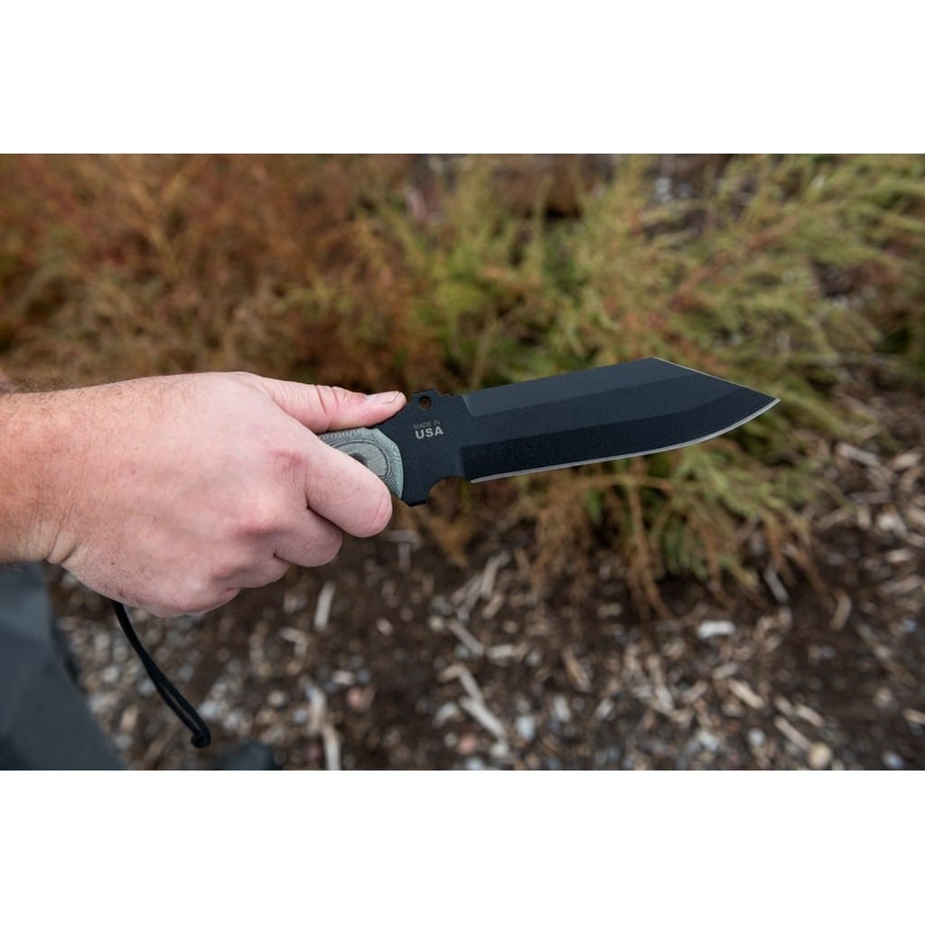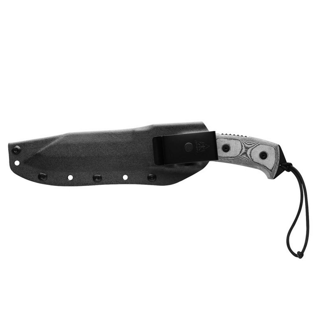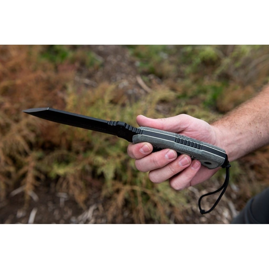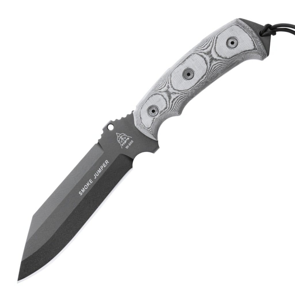 Smoke Jumper z czystej definicji oznacza specjalnie przeszkolonego strażaka, który walczy z pożarem w dzikich i odległych terenach. Skacze ze spadochronem, aby zapewnić doraźną pomoc w gaszeniu ognia. Jest to praca bardzo trudna, wyczerpująca i niebezpieczna, a kurs szkoleniowy z pozytywnym wynikiem kończy niewiele osób. Nóż Smoke Jumper amerykańskiej firmy TOPS został zaprojektowany właśnie z myślą o tych bohaterach. Narzędzie posiada solidną konstrukcję full tang, aby wytrzymać naprawdę silne uderzenia, gdy zajdzie taka konieczność. Głownię o profilu Clip Point wykonano ze stali węglowej 1095 odpornej na wykruszenia i pęknięcia oraz niesprawiającej trudności w ostrzeniu. Pokryto ją powłoką Black Traction, która jest zastrzeżoną nazwą wykończenia stosowaną przez TOPS, składającą się z hybrydowej bazy epoksydowej z dodatkiem poliestru. Nakłada się ją proszkowo na klingę i zapieka w piecu, przez kilkanaście minut, w temperaturze około 210 stopni Celsjusza. Karbowany grzbiet ostrza stanowi stabilne wsparcie dla kciuka przy precyzyjnych zadaniach, co poprawia bezpieczeństwo i komfort użytkowania. Ergonomicznie wyprofilowana rękojeść z Micarty o fakturze lnu gwarantuje pewny chwyt i zapewnia dobrą przyczepność do dłoni. Na zakończeniu umieszczono otwór z przełożoną linką paracord do mocowania na nadgarstku. Całość dopełnia funkcjonalna, czarna pochwa z kydexu wraz z obrotowym klipsem. Pozwala na wygodne przenoszenie narzędzia blisko ciała lub przy wyposażeniu, pod dowolnym kątem. Do kompletu dołączono także gwizdek o mocy 116 decybeli, z powodzeniem możemy zamocować go przy kluczach w formie breloka lub schować do kieszeni. Misją TOPS Knives jest produkowanie noży najwyższej jakości, charakteryzujących się wydajnością i niezawodnością w terenie. Firma współpracuje z projektantami posiadającymi odpowiednie doświadczenie militarne i survivalowe. Ich produkty tworzą osoby z różnych środowisk, żołnierze Navy Seals, Rangersi, instruktorzy sztuk walki, członkowie zespołu SWAT, a nawet indiańscy eksperci od broni. Wszystkie narzędzia są wytwarzane i ręcznie wykańczane w zakładzie w USA, w sercu gór skalistych.