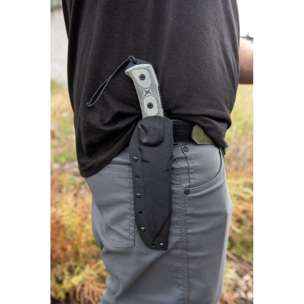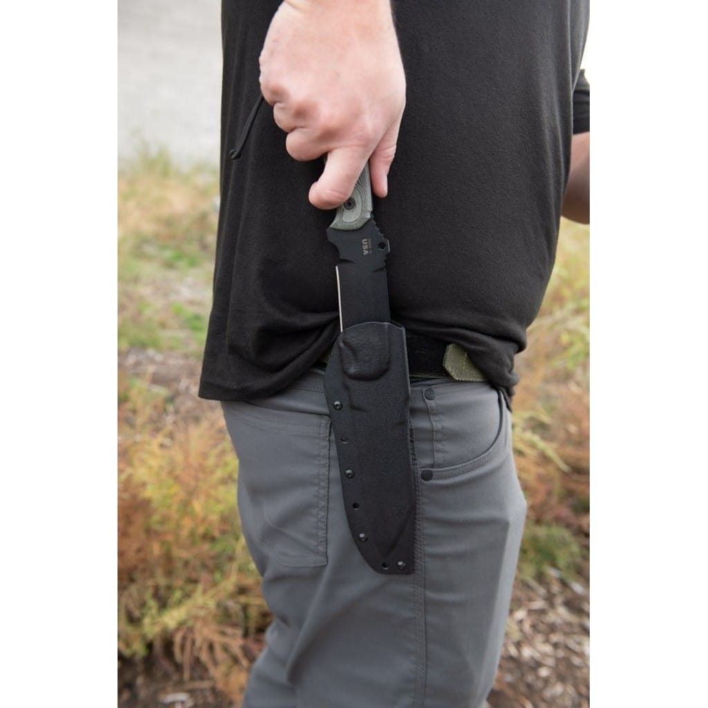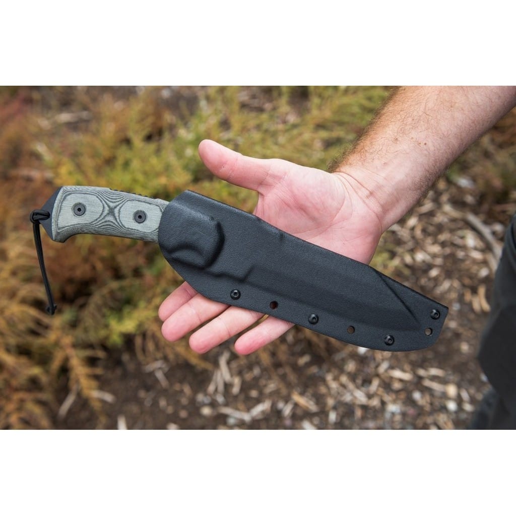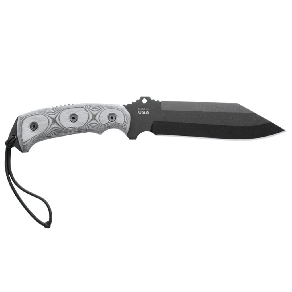 Smoke Jumper z czystej definicji oznacza specjalnie przeszkolonego strażaka, który walczy z pożarem w dzikich i odległych terenach. Skacze ze spadochronem, aby zapewnić doraźną pomoc w gaszeniu ognia. Jest to praca bardzo trudna, wyczerpująca i niebezpieczna, a kurs szkoleniowy z pozytywnym wynikiem kończy niewiele osób. Nóż Smoke Jumper amerykańskiej firmy TOPS został zaprojektowany właśnie z myślą o tych bohaterach. Narzędzie posiada solidną konstrukcję full tang, aby wytrzymać naprawdę silne uderzenia, gdy zajdzie taka konieczność. Głownię o profilu Clip Point wykonano ze stali węglowej 1095 odpornej na wykruszenia i pęknięcia oraz niesprawiającej trudności w ostrzeniu. Pokryto ją powłoką Black Traction, która jest zastrzeżoną nazwą wykończenia stosowaną przez TOPS, składającą się z hybrydowej bazy epoksydowej z dodatkiem poliestru. Nakłada się ją proszkowo na klingę i zapieka w piecu, przez kilkanaście minut, w temperaturze około 210 stopni Celsjusza. Karbowany grzbiet ostrza stanowi stabilne wsparcie dla kciuka przy precyzyjnych zadaniach, co poprawia bezpieczeństwo i komfort użytkowania. Ergonomicznie wyprofilowana rękojeść z Micarty o fakturze lnu gwarantuje pewny chwyt i zapewnia dobrą przyczepność do dłoni. Na zakończeniu umieszczono otwór z przełożoną linką paracord do mocowania na nadgarstku. Całość dopełnia funkcjonalna, czarna pochwa z kydexu wraz z obrotowym klipsem. Pozwala na wygodne przenoszenie narzędzia blisko ciała lub przy wyposażeniu, pod dowolnym kątem. Do kompletu dołączono także gwizdek o mocy 116 decybeli, z powodzeniem możemy zamocować go przy kluczach w formie breloka lub schować do kieszeni. Misją TOPS Knives jest produkowanie noży najwyższej jakości, charakteryzujących się wydajnością i niezawodnością w terenie. Firma współpracuje z projektantami posiadającymi odpowiednie doświadczenie militarne i survivalowe. Ich produkty tworzą osoby z różnych środowisk, żołnierze Navy Seals, Rangersi, instruktorzy sztuk walki, członkowie zespołu SWAT, a nawet indiańscy eksperci od broni. Wszystkie narzędzia są wytwarzane i ręcznie wykańczane w zakładzie w USA, w sercu gór skalistych.