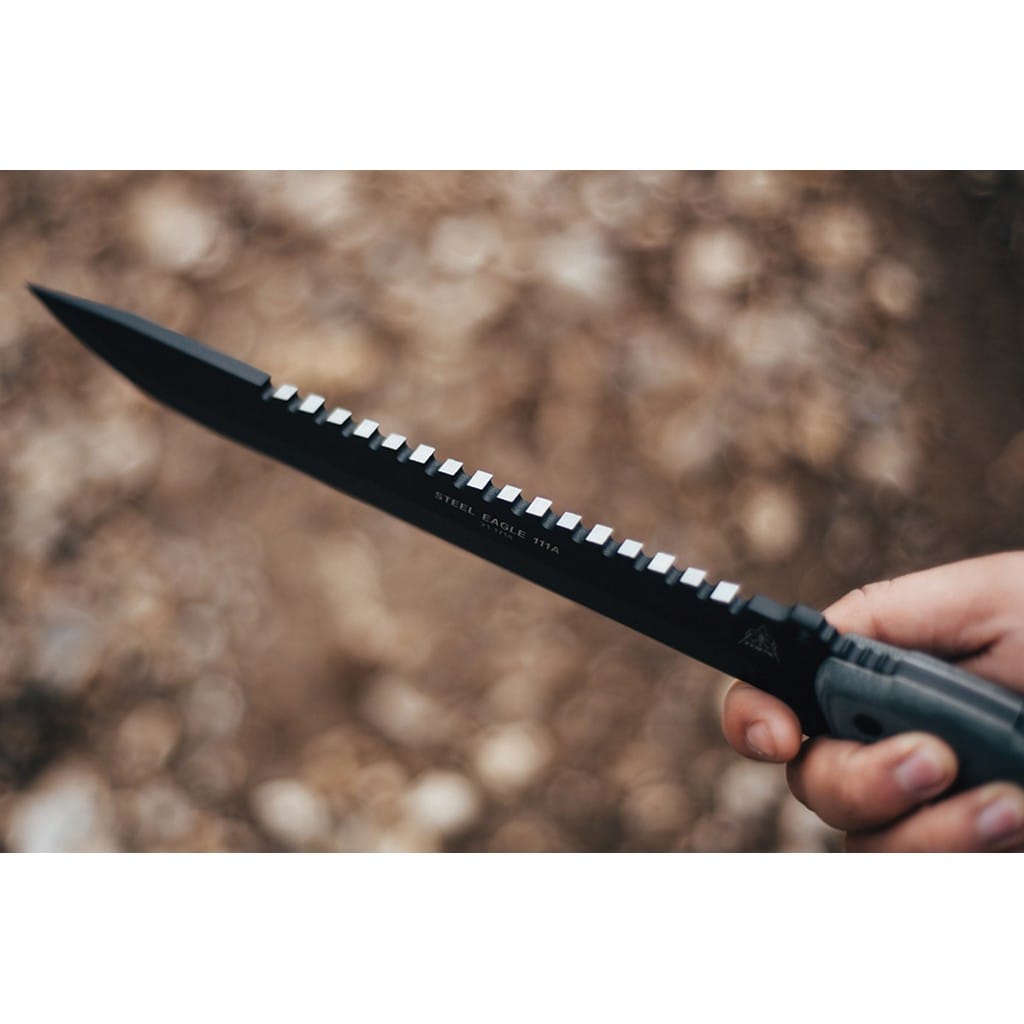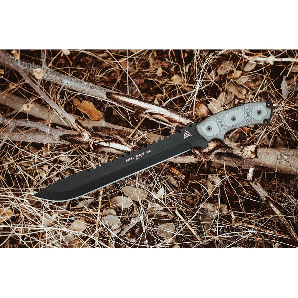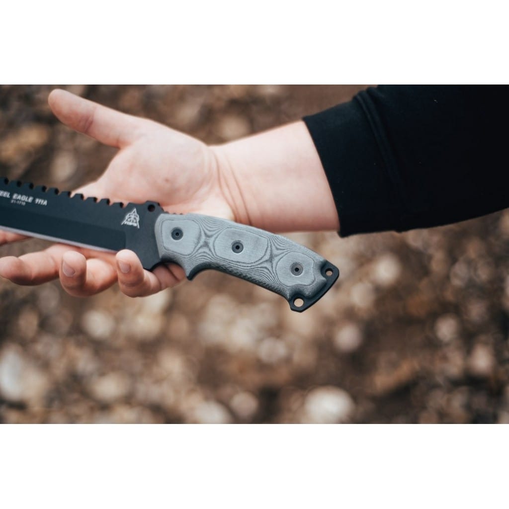 Seria noży Eagle to pierwsze modele stworzone przez firmę TOPS Knives, które przez wiele lat skutecznie udowadniały swoją trwałość i niezawodność. Doskonale sprawdzą się w każdym środowisku jako wszechstronne narzędzia dla żołnierzy jednostek specjalnych, a także dla cywilów. Wersja 111AHP to potężny i masywny nóż do wyjątkowo ciężkich i wymagających zadań na świeżym powietrzu. Głownia o uniwersalnym profilu Drop Point została zrobiona ze stali węglowej 1095 odpornej na wykruszenia i pęknięcia oraz niesprawiającej trudności w ostrzeniu. W celu zabezpieczenia przed korozją i negatywnym działaniem czynników zewnętrznych pokryto ją antyodblaskową powłoką Black Traction. Jest to zastrzeżona nazwa wykończenia stosowana przez producenta, składającą się z hybrydowej bazy epoksydowej z dodatkiem poliestru. Nakłada się ją proszkowo na klingę i zapieka w piecu przez kilkanaście minut, w temperaturze około 210 stopni Celsjusza. Dzięki pile na grzbiecie ostrza z łatwością poradzimy sobie również z cięciem drewna i kości. Bezpieczeństwu sprzyja obustronny jelec chroniący palce przed ich przypadkowym zsunięciem się na krawędź tnącą. Model cechuje się konstrukcją full tang, co zwiększa jego wytrzymałość i możliwości w terenie. Wyprofilowane okładziny chwytu z Micarty o fakturze płótna pewnie układają się w dłoni gwarantując komfort użytkowania. Na zakończeniu umieszczono otwory na paracord celem stworzenie oplotu na nadgarstek. W zestawie znajduje się czarna pochwa z nylonu balistycznego kompatybilna z systemem Molle, umożliwiajaca wygodne przenoszenie narzędzia blisko ciała, na pasku spodni. Pokrowiec posiada także paracord i kieszonkę na drobne akcesoria EDC, jak ostrzałka czy krzesiwo. Dodatkowo do kompletu dołączono gwizdek survivalowy o mocy 116 decybeli, który z powodzeniem możemy zamocować przy kluczach w formie breloka lub schować do kieszeni. Misją TOPS Knives jest produkowanie noży najwyższej jakości, charakteryzujących się wydajnością i niezawodnością podczas pracy. Firma współpracuje z projektantami posiadającymi odpowiednie doświadczenie militarne i survivalowe. Ich produkty tworzą osoby z różnych środowisk, żołnierze Navy Seals, Rangersi, instruktorzy sztuk walki, członkowie zespołu SWAT, a nawet indiańscy eksperci od broni. Wszystkie narzędzia są wytwarzane i ręcznie wykańczane w zakładzie w USA, w sercu gór skalistych.