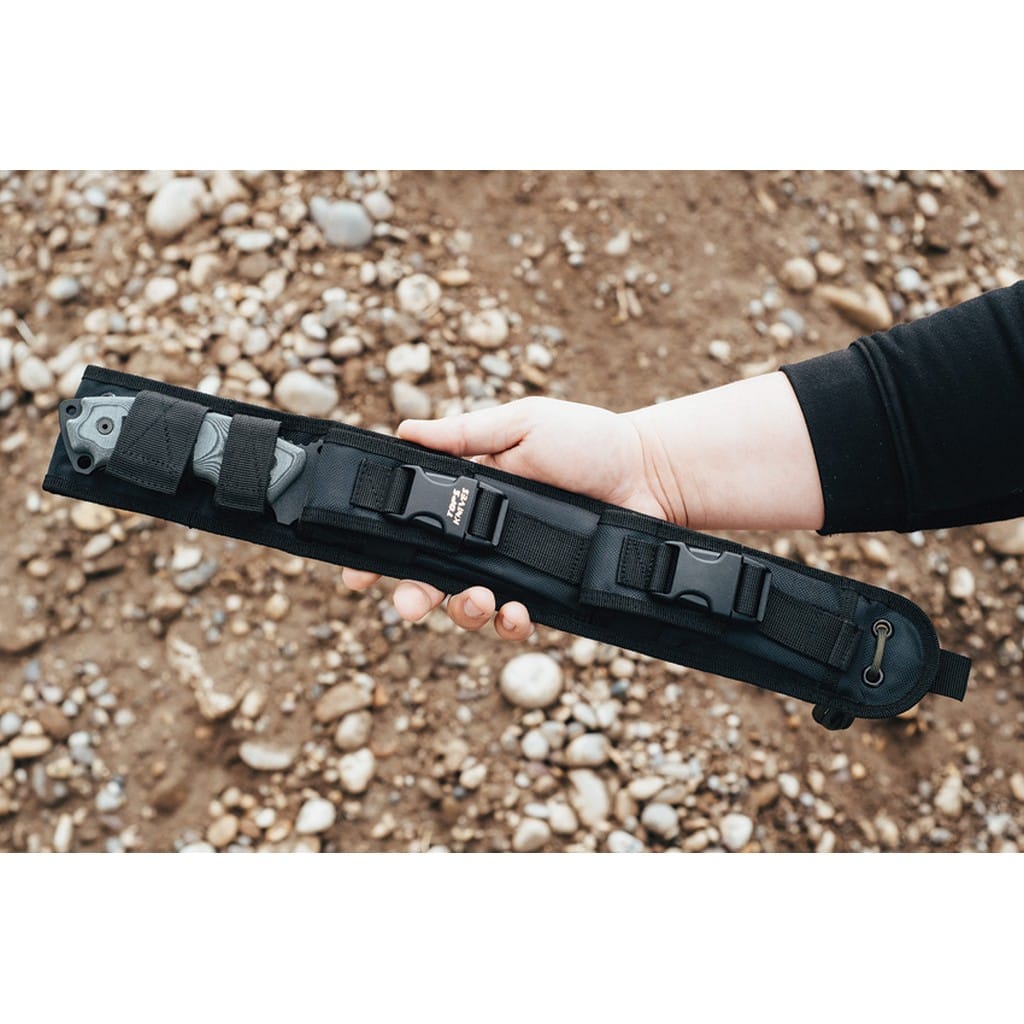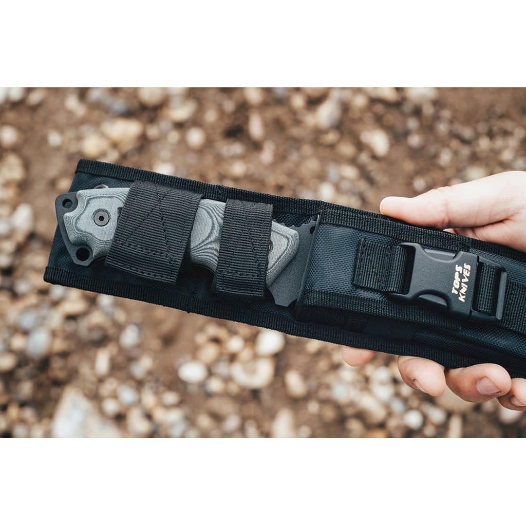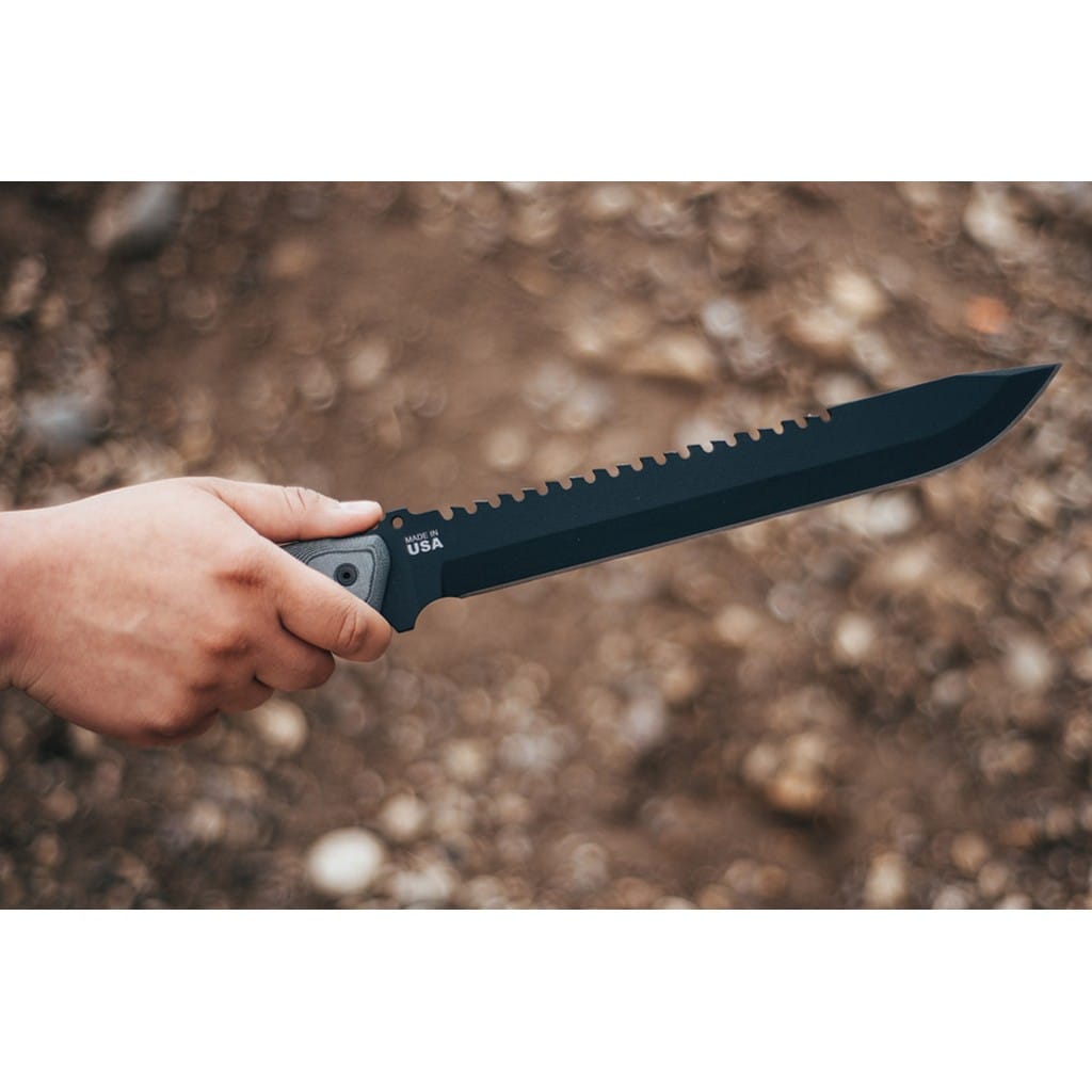Seria noży Eagle to pierwsze modele stworzone przez firmę TOPS Knives, które przez wiele lat skutecznie udowadniały swoją trwałość i niezawodność. Doskonale sprawdzą się w każdym środowisku jako wszechstronne narzędzia dla żołnierzy jednostek specjalnych, a także dla cywilów. Wersja 111AHP to potężny i masywny nóż do wyjątkowo ciężkich i wymagających zadań na świeżym powietrzu. Głownia o uniwersalnym profilu Drop Point została zrobiona ze stali węglowej 1095 odpornej na wykruszenia i pęknięcia oraz niesprawiającej trudności w ostrzeniu. W celu zabezpieczenia przed korozją i negatywnym działaniem czynników zewnętrznych pokryto ją antyodblaskową powłoką Black Traction. Jest to zastrzeżona nazwa wykończenia stosowana przez producenta, składającą się z hybrydowej bazy epoksydowej z dodatkiem poliestru. Nakłada się ją proszkowo na klingę i zapieka w piecu przez kilkanaście minut, w temperaturze około 210 stopni Celsjusza. Dzięki pile na grzbiecie ostrza z łatwością poradzimy sobie również z cięciem drewna i kości. Bezpieczeństwu sprzyja obustronny jelec chroniący palce przed ich przypadkowym zsunięciem się na krawędź tnącą. Model cechuje się konstrukcją full tang, co zwiększa jego wytrzymałość i możliwości w terenie. Wyprofilowane okładziny chwytu z Micarty o fakturze płótna pewnie układają się w dłoni gwarantując komfort użytkowania. Na zakończeniu umieszczono otwory na paracord celem stworzenie oplotu na nadgarstek. W zestawie znajduje się czarna pochwa z nylonu balistycznego kompatybilna z systemem Molle, umożliwiajaca wygodne przenoszenie narzędzia blisko ciała, na pasku spodni. Pokrowiec posiada także paracord i kieszonkę na drobne akcesoria EDC, jak ostrzałka czy krzesiwo. Dodatkowo do kompletu dołączono gwizdek survivalowy o mocy 116 decybeli, który z powodzeniem możemy zamocować przy kluczach w formie breloka lub schować do kieszeni. Misją TOPS Knives jest produkowanie noży najwyższej jakości, charakteryzujących się wydajnością i niezawodnością podczas pracy. Firma współpracuje z projektantami posiadającymi odpowiednie doświadczenie militarne i survivalowe. Ich produkty tworzą osoby z różnych środowisk, żołnierze Navy Seals, Rangersi, instruktorzy sztuk walki, członkowie zespołu SWAT, a nawet indiańscy eksperci od broni. Wszystkie narzędzia są wytwarzane i ręcznie wykańczane w zakładzie w USA, w sercu gór skalistych.