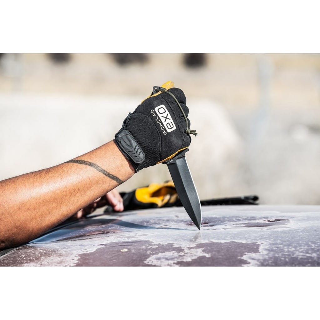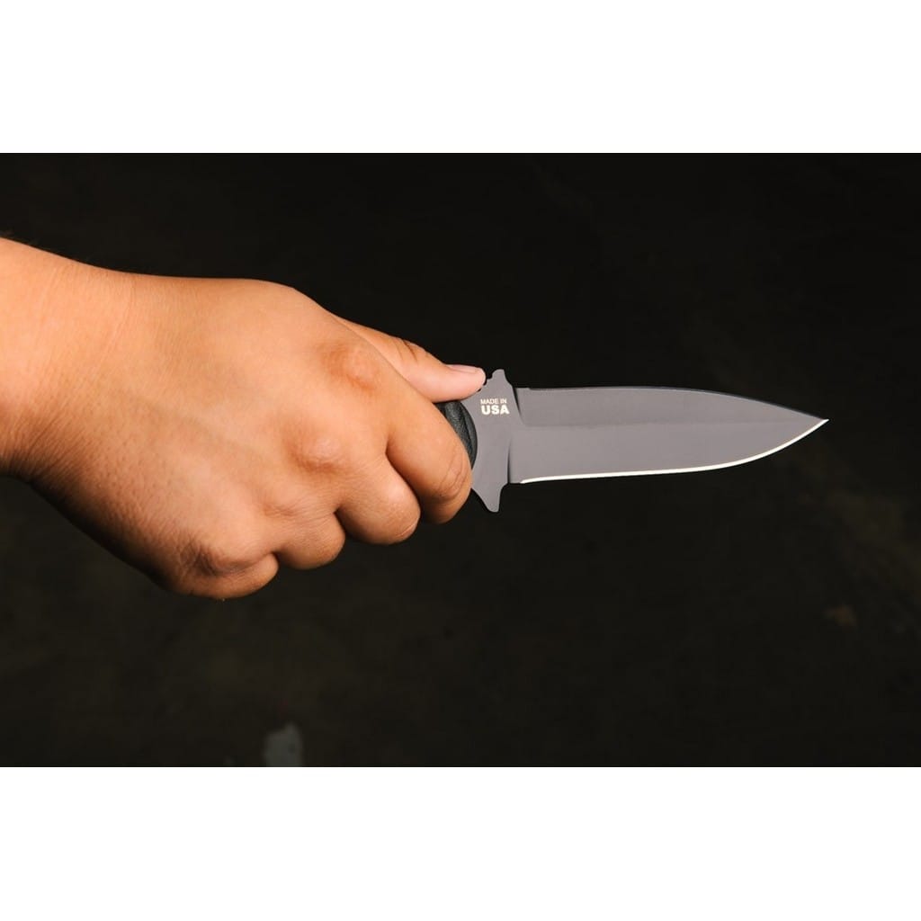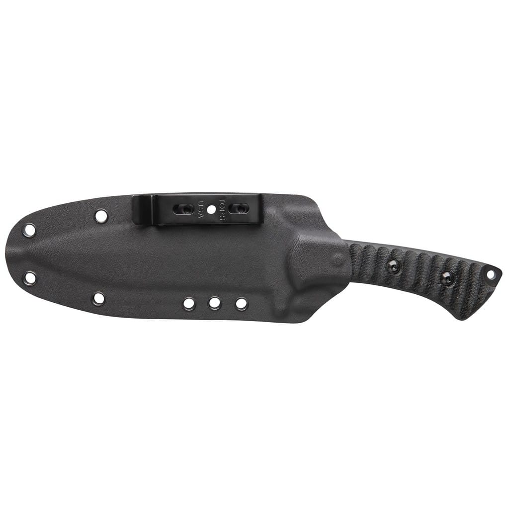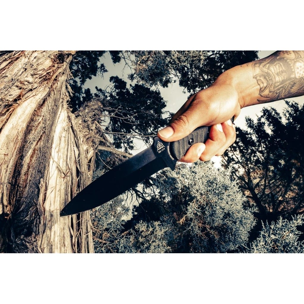 Szabo Express amerykańskiej firmy TOPS to nóż taktyczny zaprojektowany do wymagającym zadań na świeżym powietrzu. Symetryczne ostrze typu Dagger posiada obustronnie naostrzoną krawędź tnącą, dzięki czemu doskonale nadaje sie do pchnięć i głębokiej penetracji. Konstrukcja full tang zwiększa możliwości narzędzia i czyni go bardziej wytrzymałym. Głownia została wykonana ze stali węglowej 1095 odpornej na wykruszenia i pęknięcia oraz niesprawiającej trudności w ostrzeniu. Wykończono ją matową powłoką Cerakote w czarnym kolorze. Jest to ceramiczna i opatentowana formuła na bazie polimerów oferująca odporność na zarysowania, korozję, ciepło i chemikalia. Niewielkie karbowanie na grzbiecie klingi stanowi antypoślizgowe oparcie dla kciuka. Bezpieczeństwo pracy gwarantuje obustronny jelec chroniący palce przed ich przypadkowym zsunięciem się na ostrze. Rękojeść z Micarty, o fakturze płótna z ergonomicznymi wgłębieniami na jej powierzchni, zapewnia bardzo dobrą przyczepność do dłoni w każdej pozycji chwytu. Na zakończeniu umieszczono otwór umożliwiający przełożenie kawałka paracordu i stworzenie oplotu na nadgarstek. Całość dopełnia pochwa z kydexu wraz z wielopozycyjnym klipsem z metalu, pozwalającym na wygodne przenoszenie narzędzia blisko ciała. Otwory na bokach kabury dodatkowo dają możliwość troczenia linki i doczepienia całości do kamizelki lub ekwipunku. Do kompletu dołączono także gwizdek survivalowy o mocy 116 decybeli. Z powodzeniem zamocujemy go przy kluczach w formie breloka lub schowamy do kieszeni. Misją TOPS Knives jest produkowanie noży najwyższej jakości, charakteryzujących się wydajnością i efektywnością w terenie. Firma współpracuje z projektantami posiadającymi odpowiednie doświadczenie militarne i survivalowe. Ich produkty tworzą osoby z różnych środowisk, żołnierze Navy Seals, Rangersi, instruktorzy sztuk walki, członkowie zespołu SWAT, a nawet indiańscy eksperci od broni. Wszystkie narzędzia są wytwarzane i ręcznie wykańczane w zakładzie w USA, w sercu gór skalistych. Model Szabo Express to godny zaufania i przemyślany owoc mądrej koncepcji firmy TOPS, który spełni oczekiwania swojego użytkownika i nie zawiedzie go w trudnej sytuacji.