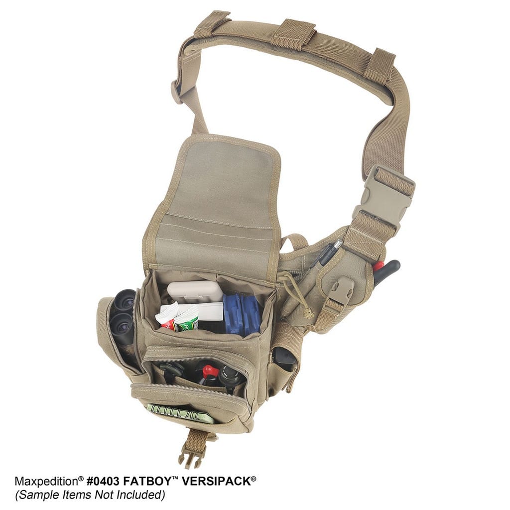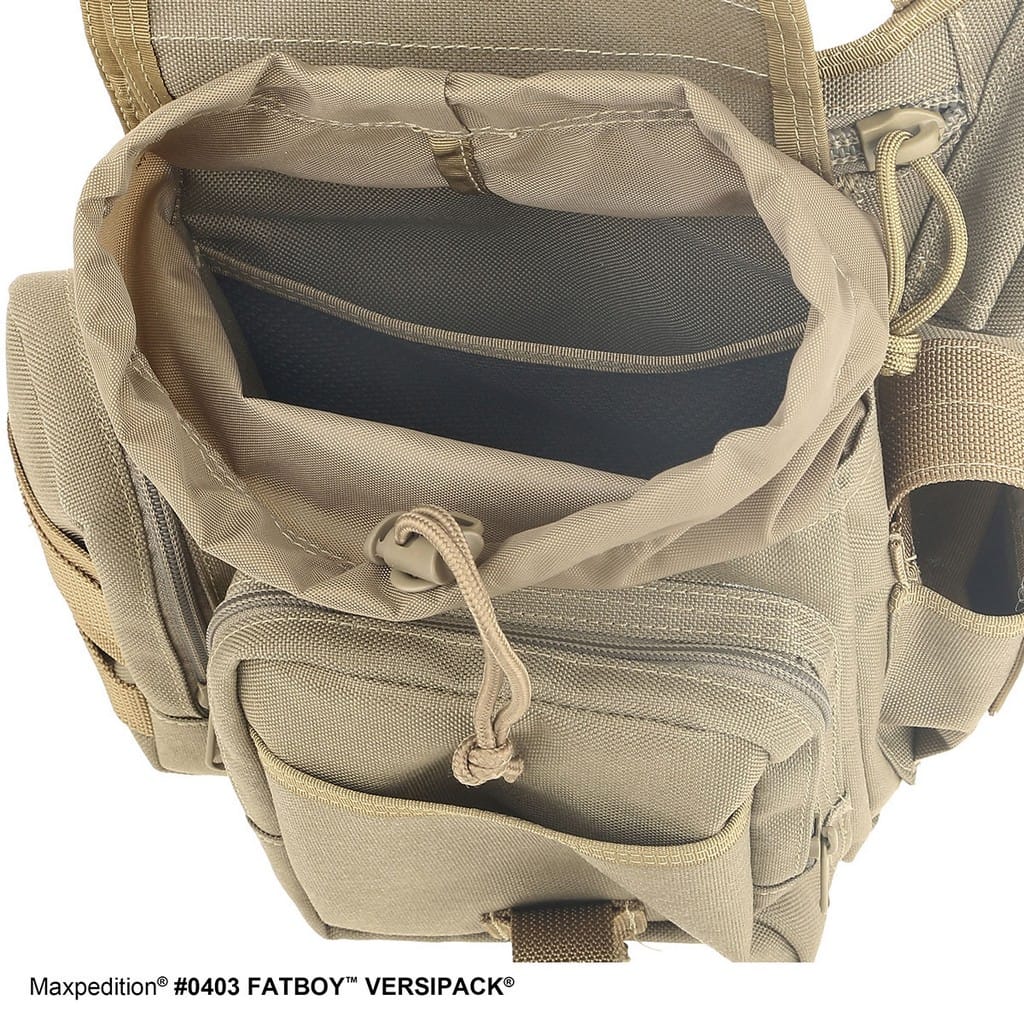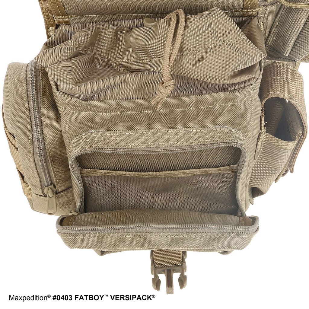 Maxpedition FATBOY VERSIPACK to coś więcej niż solidna i ergonomiczna torba; to supernowoczesna torba na nasz sprzęt taktyczny. Zapewnia hermetyczne zabezpieczenie naszego sprzętu taktycznego- a kiedy jest potrzebny, szybki i bezproblemowy dostęp do niego. Główna komora o pojemności 2,5 litra ma wszyty wodoodporny komin który „uzbrojony” jest w ściągacz z shock cordu. W głównej komorze zmieścimy duże przedmioty- do dyspozycji mamy jeszcze dwie mniejsze kieszenie i wszyte płaskie kieszenie na dokumenty i płaskie przedmioty(opatrunki, quick clot itp.)