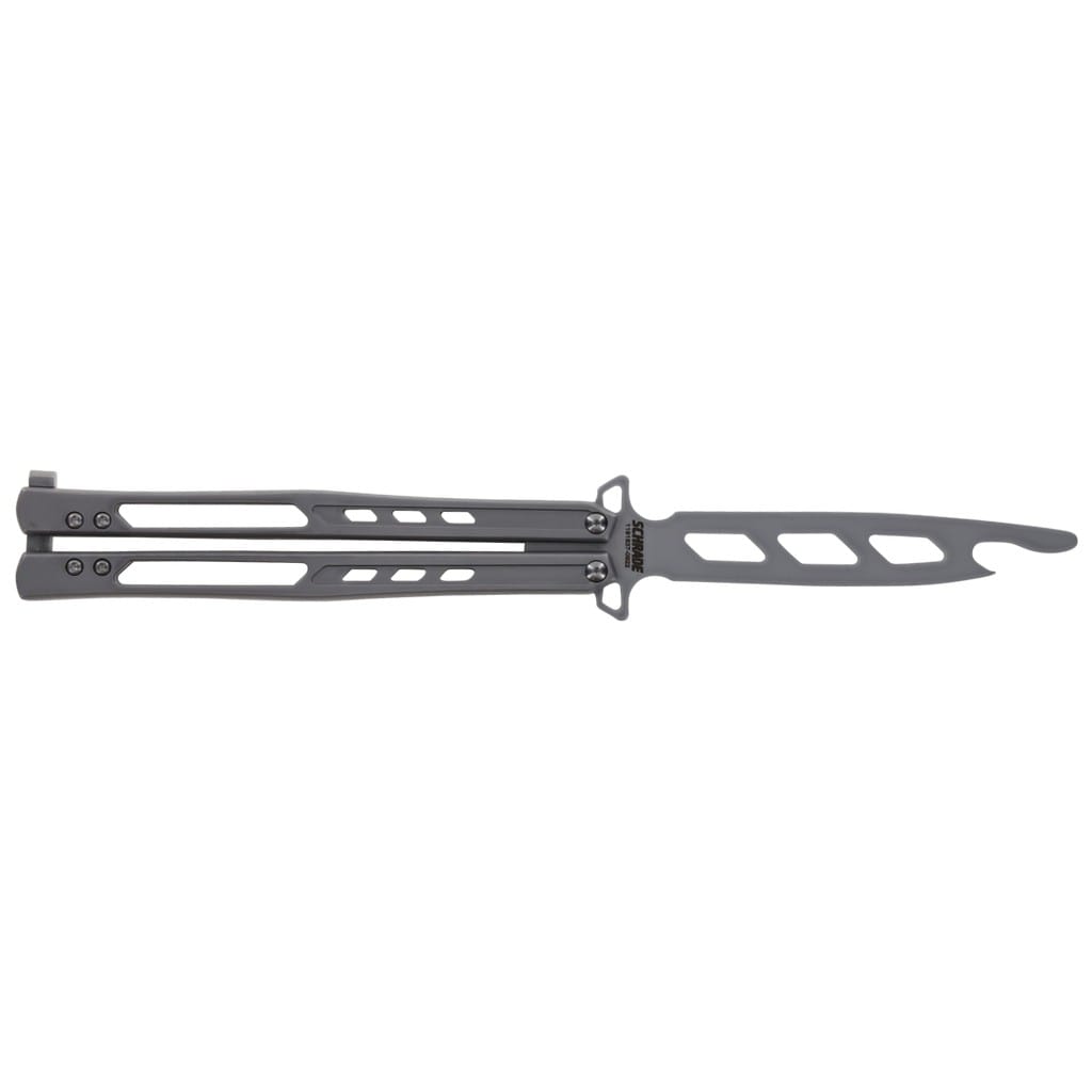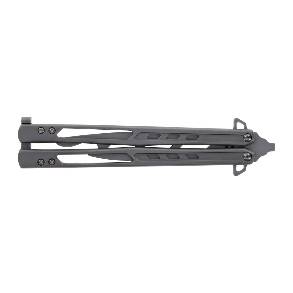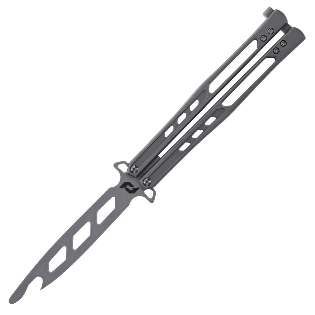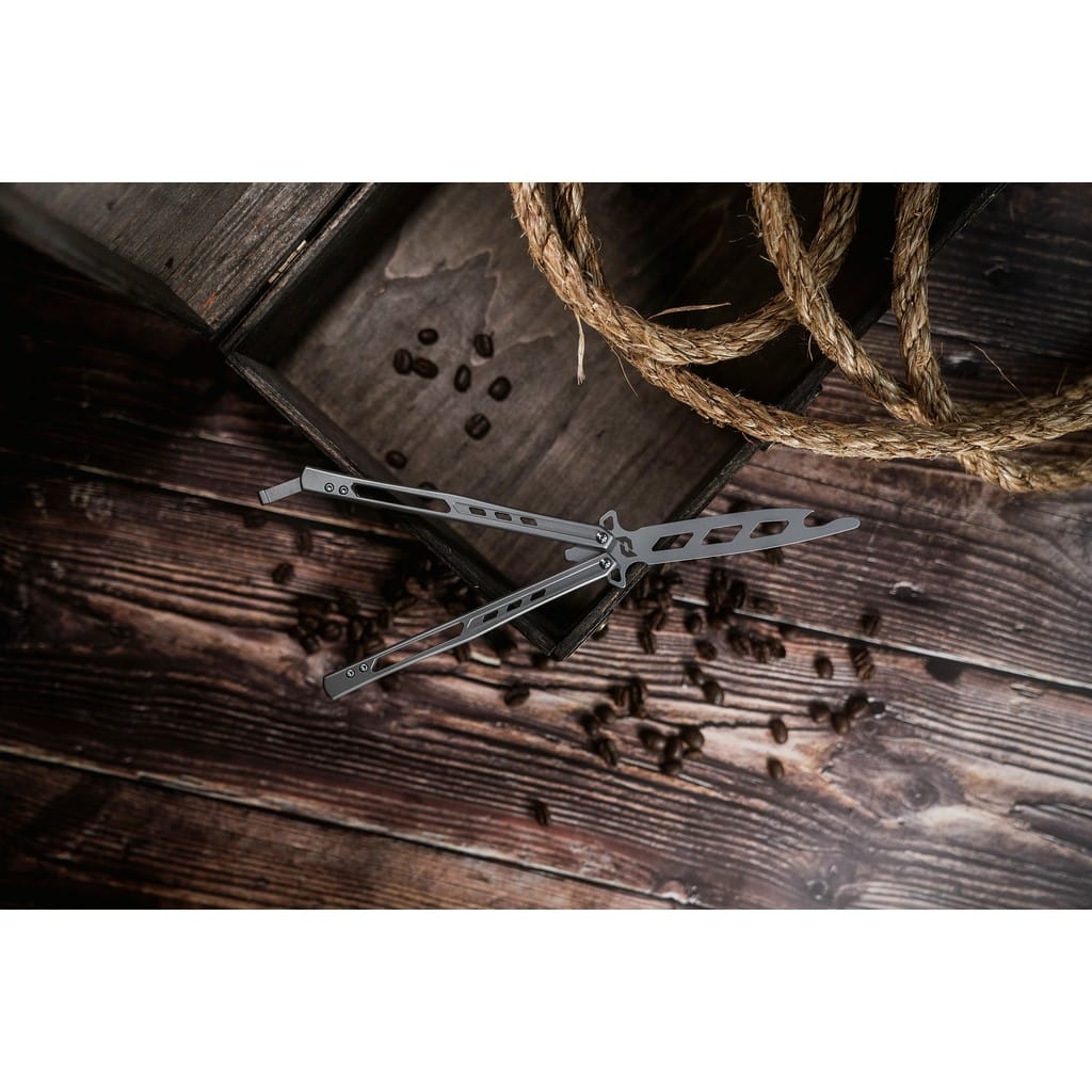 Alkemyst Trainer został stworzony przez firmę Schrade do bezpiecznej nauki obsługi noża motylkowego. Model nie posiada ostrej krawędzi tnącej, dzięki czemu użytkownik nie może się skaleczyć podczas ćwiczenia różnych trików. Konstrukcję zrobiono ze stali nierdzewnej i w całości wykończono matową powłoką uzyskaną poprzez piaskowanie, czyli dzięki tak zwanej metodzie Beadblast. Rozkładanie ostrza wspomaga mechanizm łożysk kulkowych Ultra Glide gwarantujący niezwykle płynną pracę narzędzia. W pozycji zamkniętej klinga blokowana jest solidnym trzpieniem, tak zwaną blokadą Spring Latch. Symetryczne wycięcia na stalowej rękojeści zmniejszają wagę konstrukcji i nadają interesującego wyglądu. Dodatkowo maszynowo obrabiany uchwyt sprawia, że świetnie układa się w dłoni i zapewnia dobrą przyczepność podczas zabawy z folderem. Dopełnienie stanowi otwieracz do butelek znajdujący się na głowni. Alkemyst to doskonały wybór dla miłośników noży motylkowych, którzy dopiero uczą się z nich korzystać.
