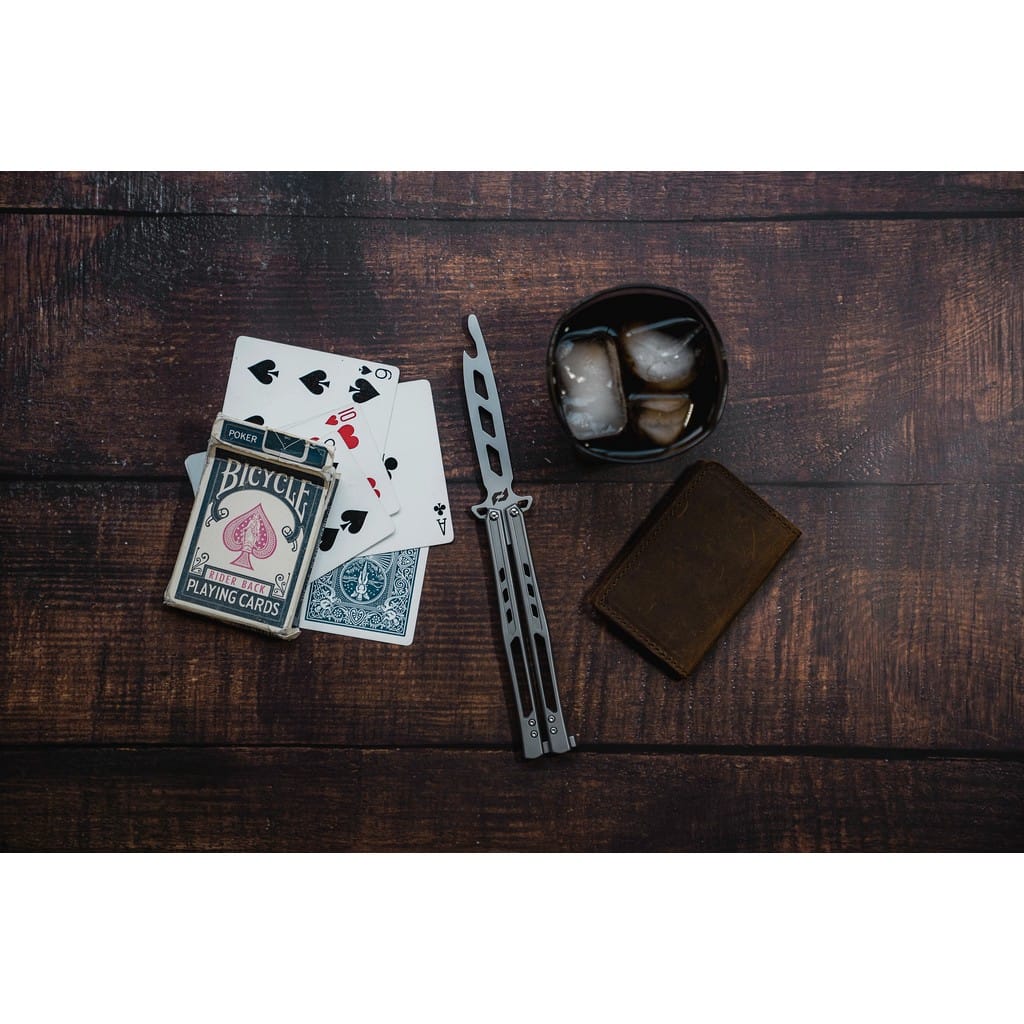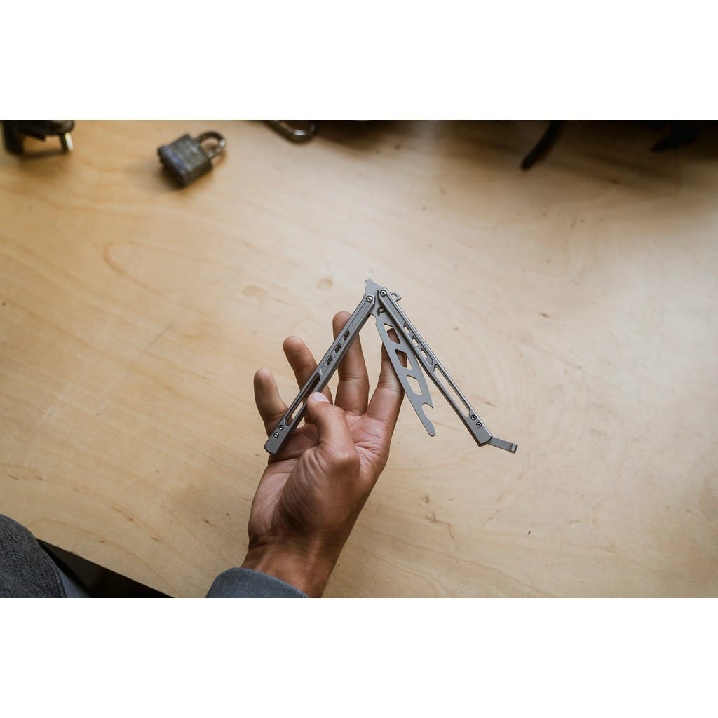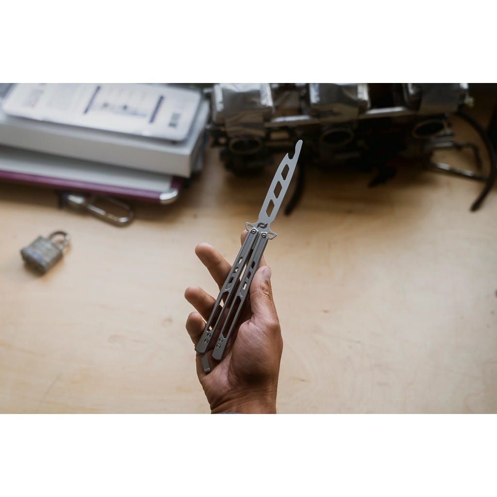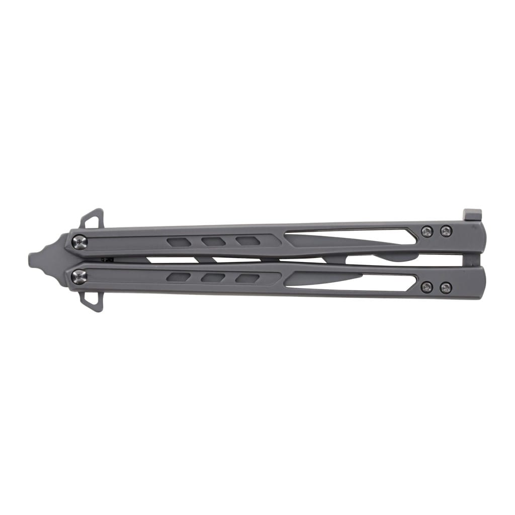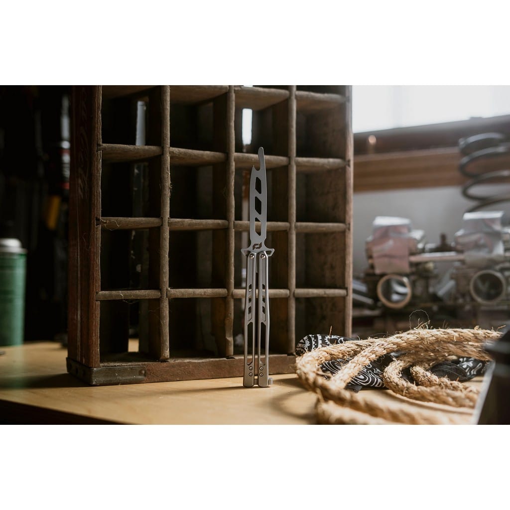 Alkemyst Trainer został stworzony przez firmę Schrade do bezpiecznej nauki obsługi noża motylkowego. Model nie posiada ostrej krawędzi tnącej, dzięki czemu użytkownik nie może się skaleczyć podczas ćwiczenia różnych trików. Konstrukcję zrobiono ze stali nierdzewnej i w całości wykończono matową powłoką uzyskaną poprzez piaskowanie, czyli dzięki tak zwanej metodzie Beadblast. Rozkładanie ostrza wspomaga mechanizm łożysk kulkowych Ultra Glide gwarantujący niezwykle płynną pracę narzędzia. W pozycji zamkniętej klinga blokowana jest solidnym trzpieniem, tak zwaną blokadą Spring Latch. Symetryczne wycięcia na stalowej rękojeści zmniejszają wagę konstrukcji i nadają interesującego wyglądu. Dodatkowo maszynowo obrabiany uchwyt sprawia, że świetnie układa się w dłoni i zapewnia dobrą przyczepność podczas zabawy z folderem. Dopełnienie stanowi otwieracz do butelek znajdujący się na głowni. Alkemyst to doskonały wybór dla miłośników noży motylkowych, którzy dopiero uczą się z nich korzystać.