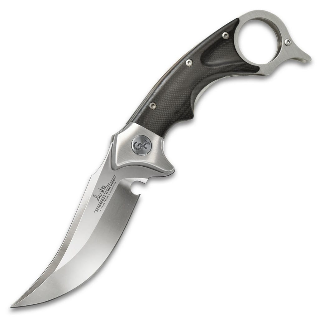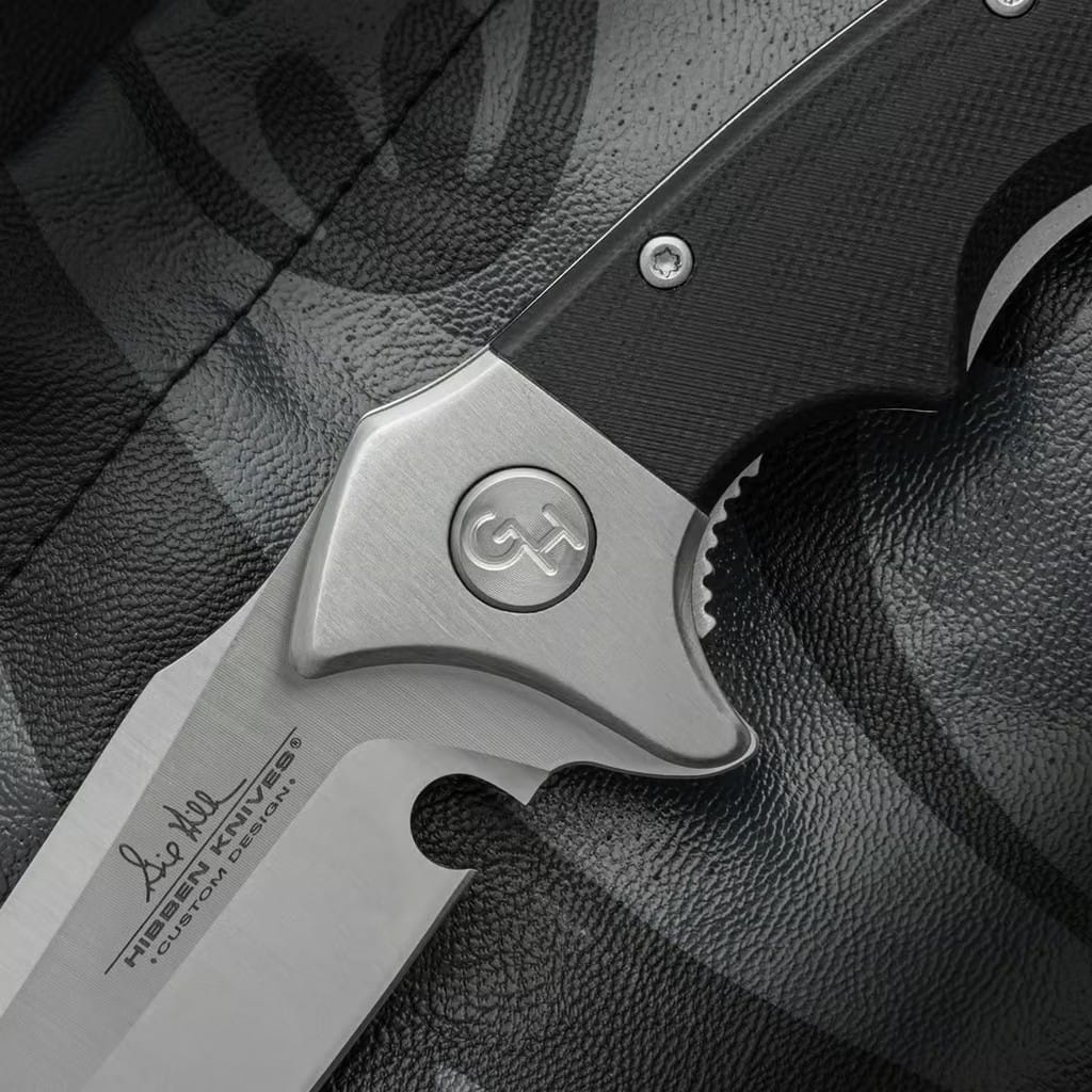 Folder GH5136 firmy United Cutlery został zaprojektowany przez Gila Hibbena, znaną i cenioną postać wśród miłośników i kolekcjonerów ostrych narzędzi. Nóż odznacza się drapieżnym wyglądem i niezwykłą siłą przebijania. Klinga wyraźnie zakrzywiona do góry, o profilu Trailing Point, została wykonana ze stali nierdzewnej 7Cr17. Wykończenie jej metodą Satin pozostawia drobne ryski lekko matujące powierzchnię, co daje efekt niedokładnego wypolerowania. Ostrze osadzono na łożyskach kulkowych, które przy wykorzystaniu sporych rozmiarów flippera wysuwa się płynnie i gładko. Prosta obsługa jedną ręką zadowoli zarówno osoby prawo, jak i leworęczne. Bezpieczeństwo zapewnia blokada Liner Lock czuwająca przed przypadkowym złożeniem się narzędzia, gdy jest w użyciu. Dodatkowo model charakteryzuje się opatentowaną przez producenta osłoną na palce, umieszczoną w okrągłej głowicy na zakończeniu noża. Pozwala to na wykorzystanie pełnej długości foldera i lepszą kontrolę chwytu. Okładziny rękojeści z lekkiego i wytrzymałego tworzywa G10 wyprofilowano pod zaciskającą się dłoń, co wpływa na komfort użytkowania. Jelec chroni palce przed ich zsunięciem się na krawędź tnącą i skaleczeniem. Stalowa wypustka w awaryjnej sytuacji z powodzeniem może posłużyć do kruszenia i wybijania szyb. Konstrukcję uzupełnia klips mocujący pozwalający na wygodne przenoszenie noża w kieszeni spodni lub przy wyposażeniu.