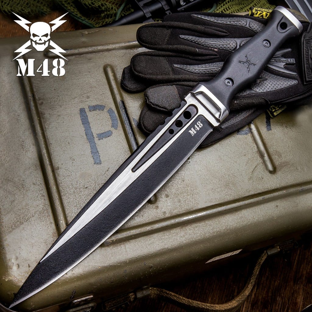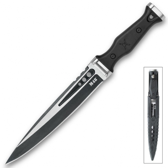Highland Dirk z serii M48 firmy United Cutlery to elegancki i nowoczesny nóż taktyczny wzorowany na szkockich sztyletach. Srebrno-czarne ostrze wykończone oksydą zostało wykonane ze stali 2Cr13, która cechuje się dobrą odpornością na ścieranie oraz długo utrzymuje ostrość. Rękojeść z gumowego tworzywa zapewnia pewny chwyt i komfort podczas pracy. Na jej zakończeniu znajduje się otwór umożliwiający zamocowanie linki i stworzenie oplotu na dłoń. Dodatkowo stalowa głowica w sytuacji awaryjnej może posłużyć jako zbijak do szyb lub młotek. W zestawie występuje pochwa wykonana z polipropylenu o antypoślizgowej powłoce, dzięki której możemy bezpiecznie przenosić nóż przy pasie.