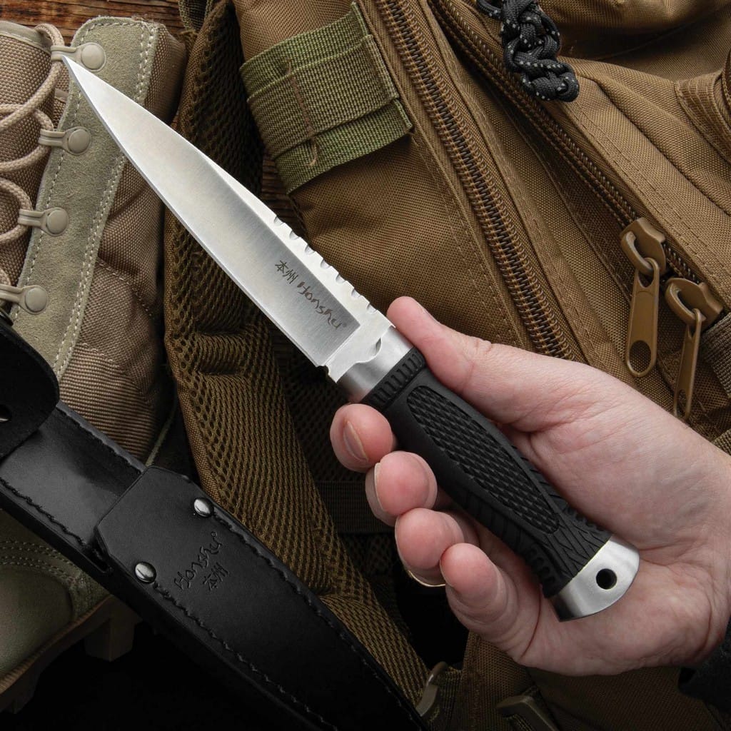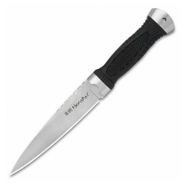 Seria Honshu firmy United Cutlery, do której należy model Sgian łączy tradycyjne formy o praktycznym zastosowaniu, z nowoczesnym i eleganckim designem. Nóż posiada ostrze o profilu Spear Point wykonane ze stali nierdzewnej 7Cr13. Głownia charakteryzuje się doskonałymi zdolnościami penetrującymi, przez co bardzo dobrze nadaje się do pchnięć. Wykończenie jej metodą Satin pozostawia drobne ryski lekko matujące powierzchnię, co daje efekt niedokładnego wypolerowania. Rękojeść z tworzywa TPR o antypoślizgowej teksturze zapewnia idealną przyczepność do dłoni użytkownika oraz gwarantuje pewny chwyt w każdych warunkach pogodowych. Na zakończeniu umieszczono otwór umożliwiający przełożenie paracordu i stworzenie oplotu na nadgarstek. Stalowa głowica w awaryjnej sytuacji z powodzeniem może zostać wykorzystana jako młotek lub zbijak do szyb. Dodatkowo w zestawie znajduje się skórzana pochwa wyposażona w metalowy klips do wygodnego mocowania noża na pasku, przy ekwipunku lub w cholewie buta. Model Sgian to niezawodne i wszechstronne narzędzie taktyczne zaprojektowane dla wszystkich miłośników militariów.
