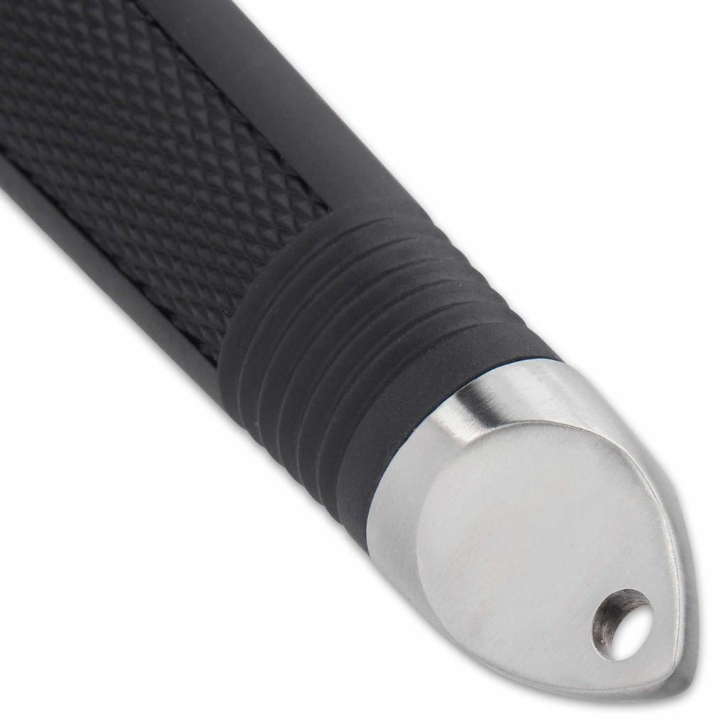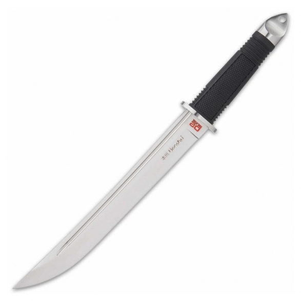 Honshu Tanto firmy United Cutlery łączy inspirację japońskim miecznictwem z nowoczesnym, taktycznym designem. Model doskonale sprawdzi się na polowaniu na dziki lub inne zwierzęta. Nóż został wykonany z wysokiej jakości jednego kawałka stali narzędziowej D2, co zwiększa jego wytrzymałość i możliwości wykorzystania w terenie. Ostrze o profilu Tanto posiadające na całej długości rowek, charakteryzuje się bardzo dobrą wydajnością cięcia, jest twarde i odporne na zużycie. Wykończenie głowni metodą Satin pozostawia drobne ryski lekko matujące powierzchnię, co daje efekt niedokładnego wypolerowania. Duży obustronny jelec zabezpiecza palce przed ich przypadkowym zsunięciem się na krawędź tnącą i skaleczeniem. Rękojeść z antypoślizgowego tworzywa TPR świetnie amortyzuje drgania i gwarantuje dobrą przyczepność do dłoni i pewny chwyt w każdym środowisku. Na zakończeniu umieszczono otwór umożliwiający przełożenie breloka ozdobnego lub paracordu. Dodatkowo w zestawie znajduje się skórzana pochwa do wygodnego transportowania narzędzia na pasku, blisko ciała.