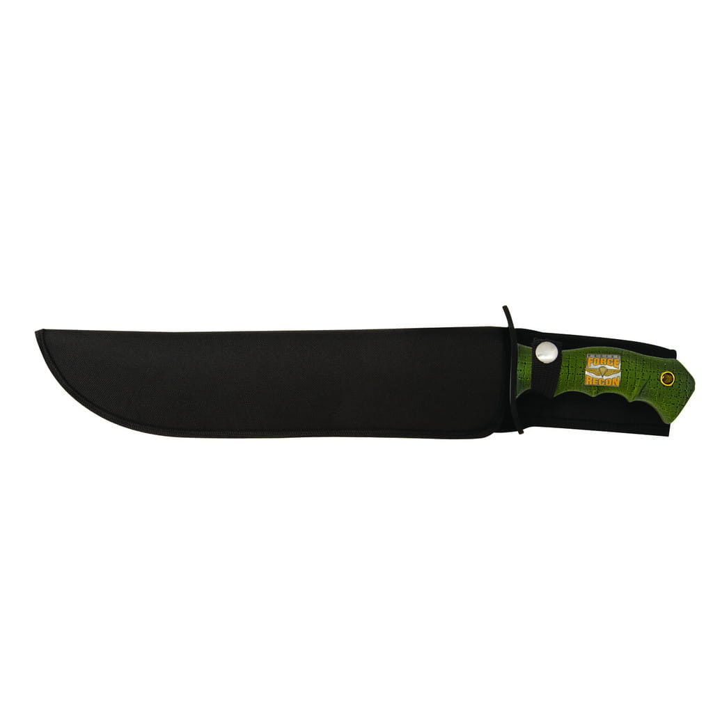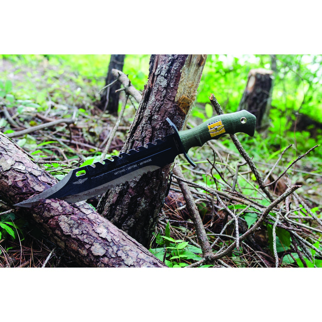„Anything, Anytime, Anywhere” co w polskim tłumaczeniu oznacza: wszystko, zawsze, wszędzie. Te trzy słowa zostały naniesione na głownię noża UC2863 wyprodukowanego przez firmę United Cutlery. Dodatkowo na rękojeści znajduje się emblemat „Marine Force Recon”. Potężne, zakrzywione ostrze wykonano z jednego kawałka stali nierdzewnej, którą pokryto czarną powłoką zabezpieczającą przed korozją oraz odblaskami. Ostrą krawędź tnące wspomaga odcinek częściowo ząbkowany do przecinania lin. Na grzbiecie głowni umieszczono również zęby, dzięki czemu mamy narzędzie, które sprawdzi się jako piła do cięcia gałęzi. Gumowa rękojeść zapewnia komfortową pracę oraz pewny chwyt. Dużych rozmiarów jelec zabezpiecza dłoń przed zsunięciem się na ostrze, co podnosi bezpieczeństwo użycia noża. Do zestawu dołączono także nylonową pochwę z możliwością przymocowania do pasa. Model sprawdzi się zarówno w terenie, jak i podczas wykonywania prac w ogrodnictwie czy innych aktywnościach outdoorowych, które wymagają solidnego narzędzia.