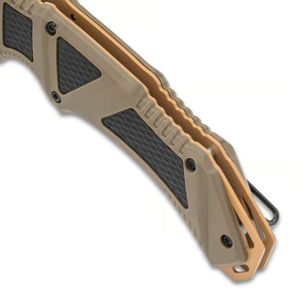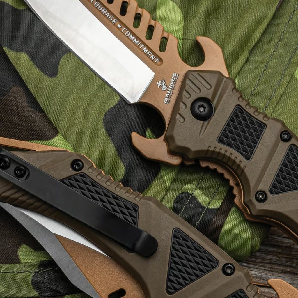UC3622 firmy United Cutlery to nóż składany o taktycznym wyglądzie zaprojektowany do codziennego użytku dla miłośników militariów i taktycznego stylu. Model został oznaczony licencjonowanym logo Korpus Piechoty Morskiej Stanów Zjednoczonych. Posiada na ostrzu laserowo naniesiony napis „Honor, Courage, Commitment”, co w polskim tłumaczeniu oznacza honor, odwaga, ojczyzna. Głownię o profilu Clip Point wykonano ze stali nierdzewnej 3Cr13 o dwutonowym wykończeniu dodającym charakteru całej konstrukcji. Na wklęsłych elementach zastosowano metodę Satin, pozostawiającą drobne ryski lekko matujące powierzchnię, zaś wypukłe pokryto powłoką ochronną w pustynnym kolorze. Klasyczny mechanizm Liner Lock skutecznie blokuje folder podczas pracy, a obustronny jelec zabezpiecza dłoń przed jej przypadkowym zsunięciem się na krawędź tnąca i skaleczeniem. Ergonomicznie wyprofilowana rękojeść z antypoślizgowego tworzywa gwarantuje pewny chwyt w każdych warunkach. Na zakończeniu umieszczono otwór umożliwiający przełożenie breloka ozdobnego lub paracordu. Całość dopełnia klips mocujący pozwalający na wygodne przenoszenie noża w kieszeni spodni lub przy wyposażeniu.